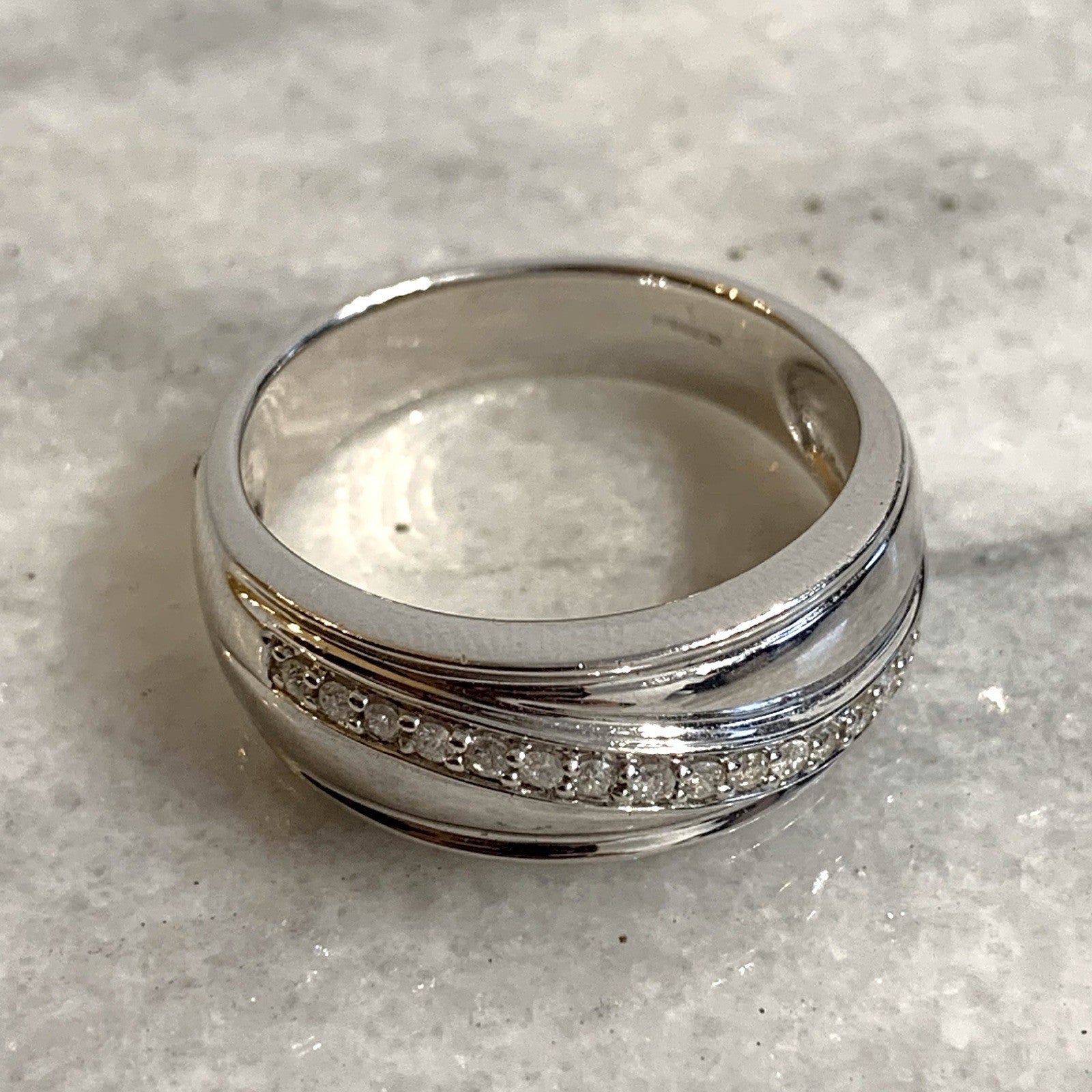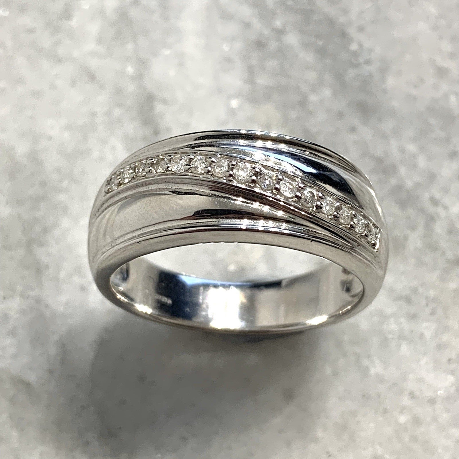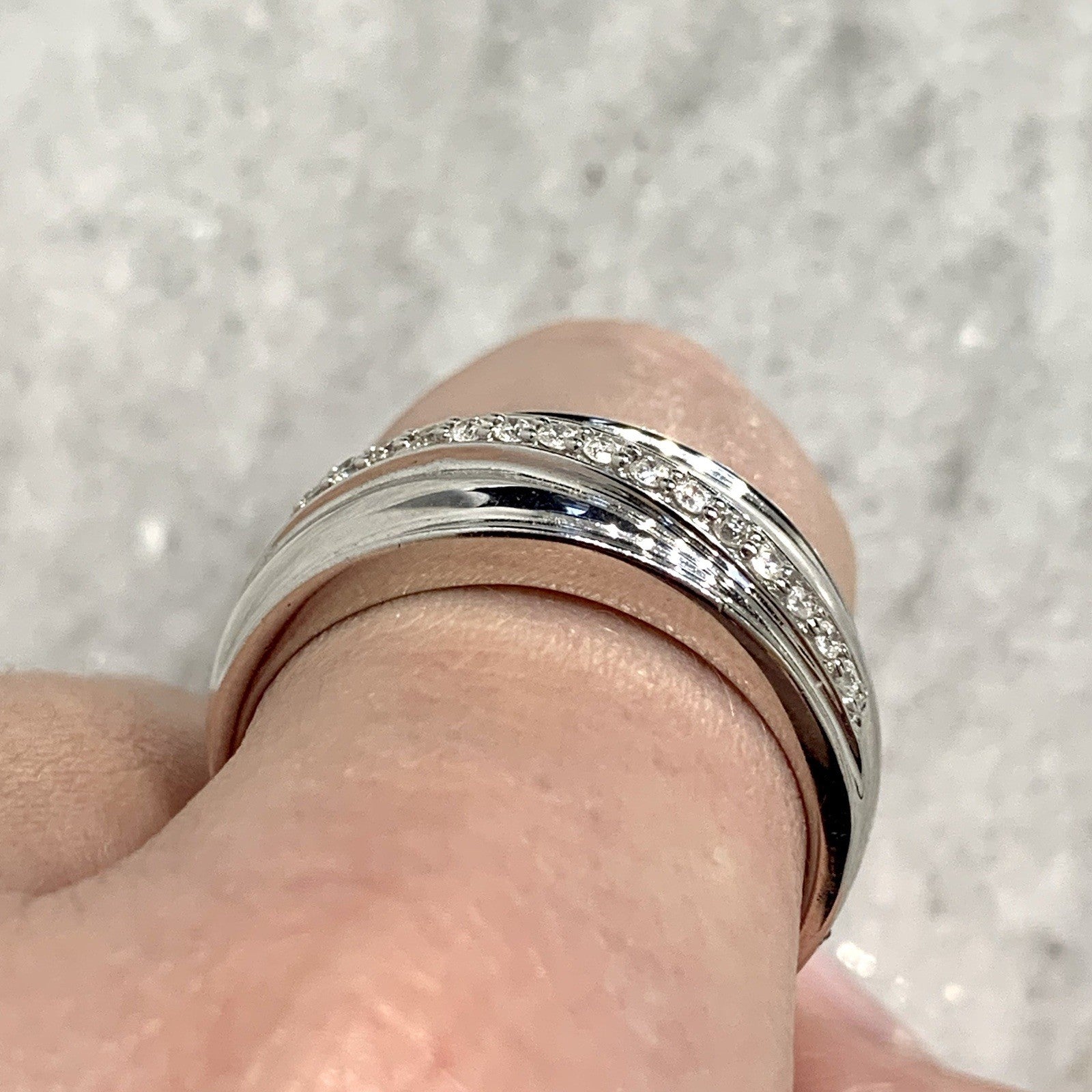 - A charming chunky white gold band ring showcasing a wave of petite diamonds.