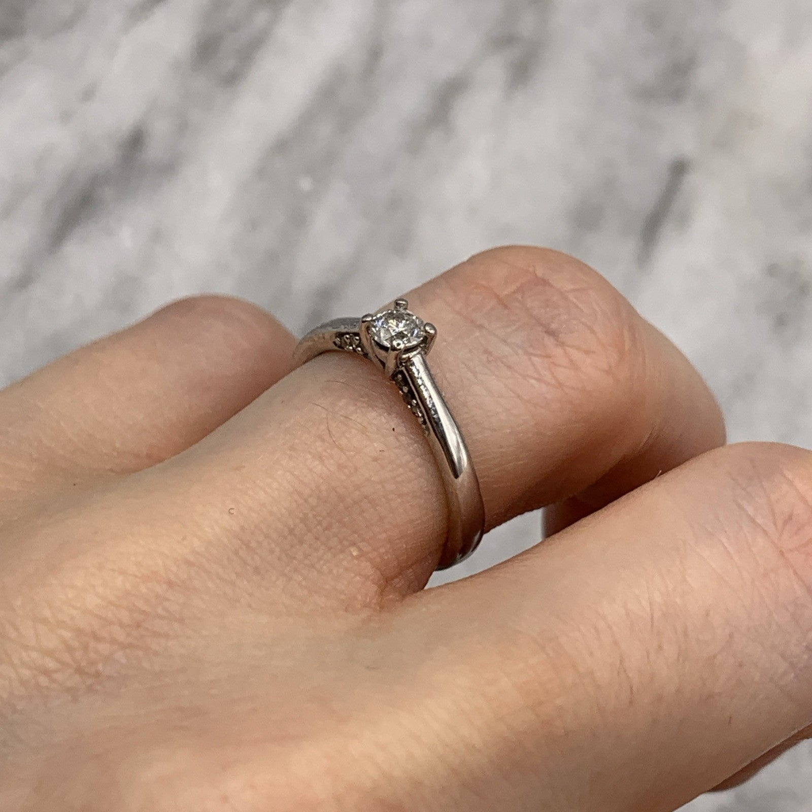 - A stunning white gold ring showcasing a round cut diamond upon shoulder with additional diamond accents on the inside and outside.
