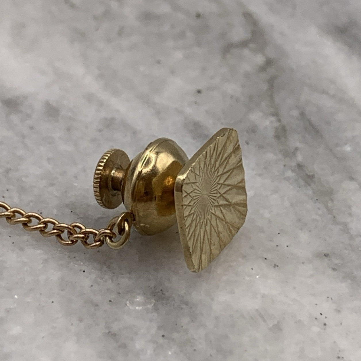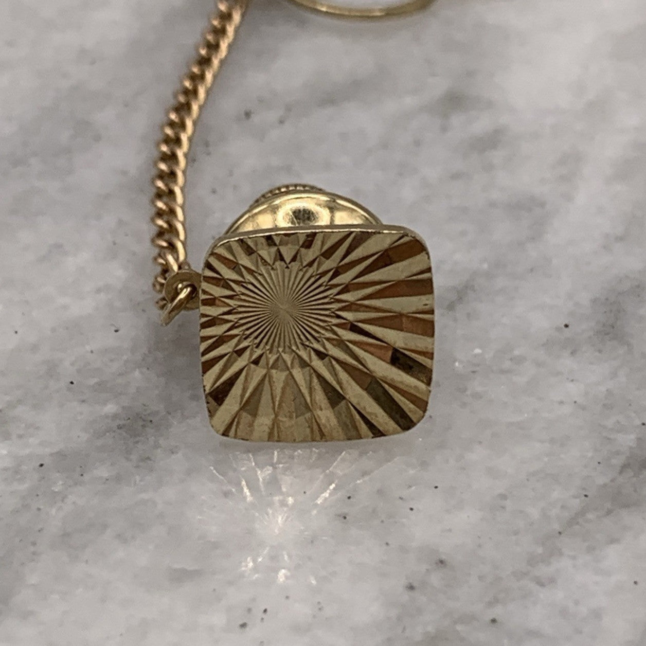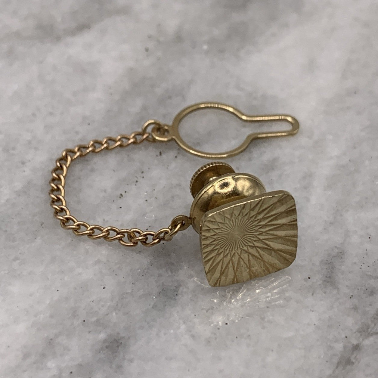 A timeless gold tie pin crafted in a rounded square shape with an embossed patterned finish. Complete with safety chain.