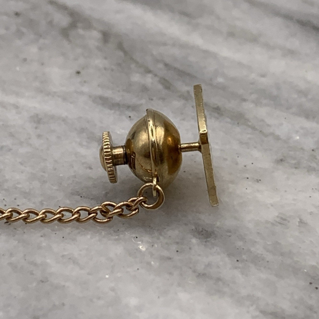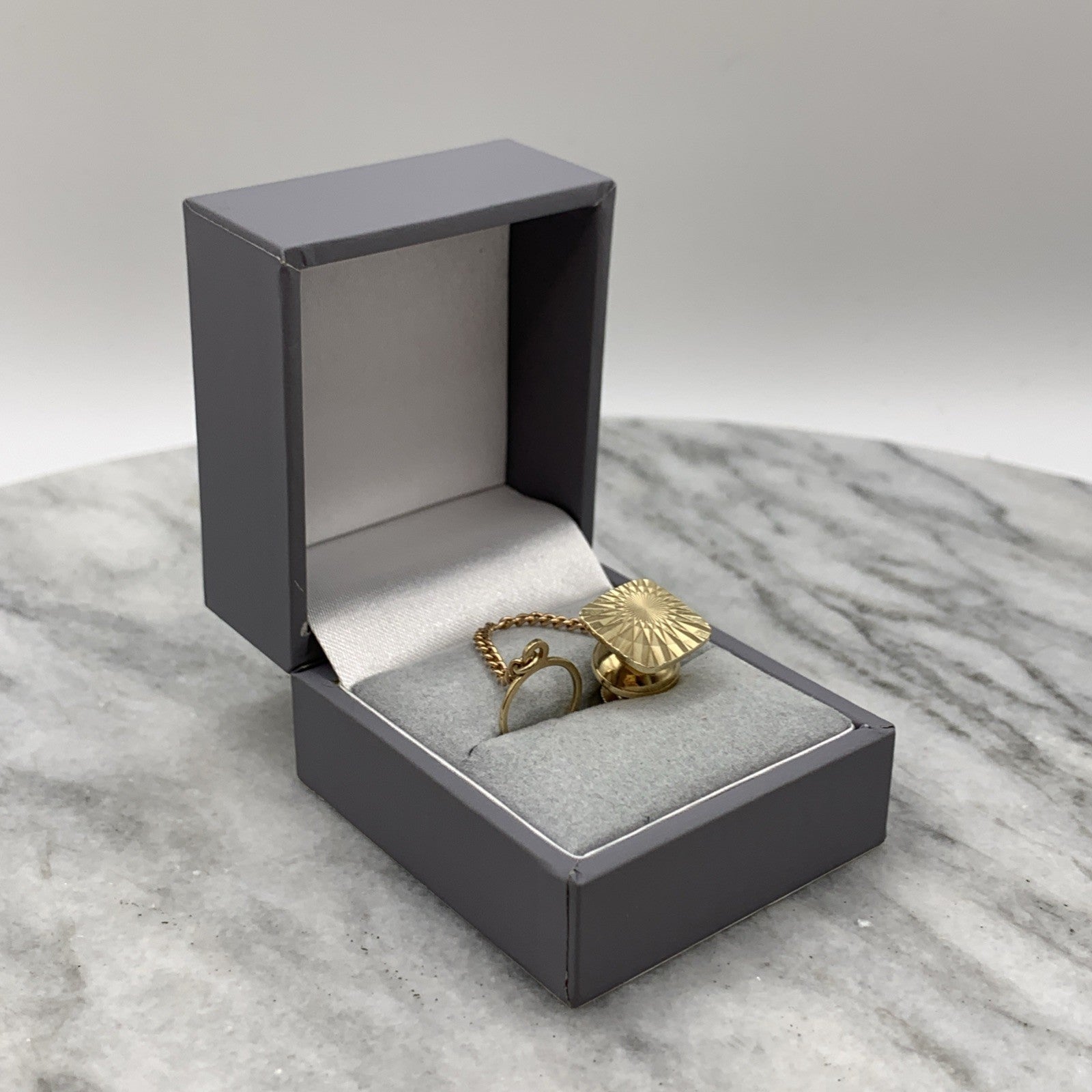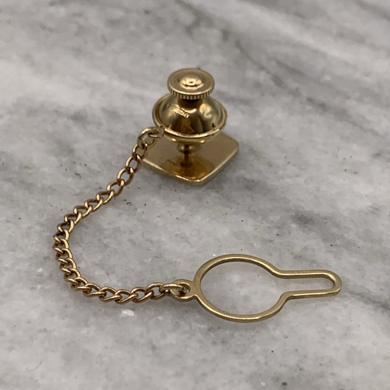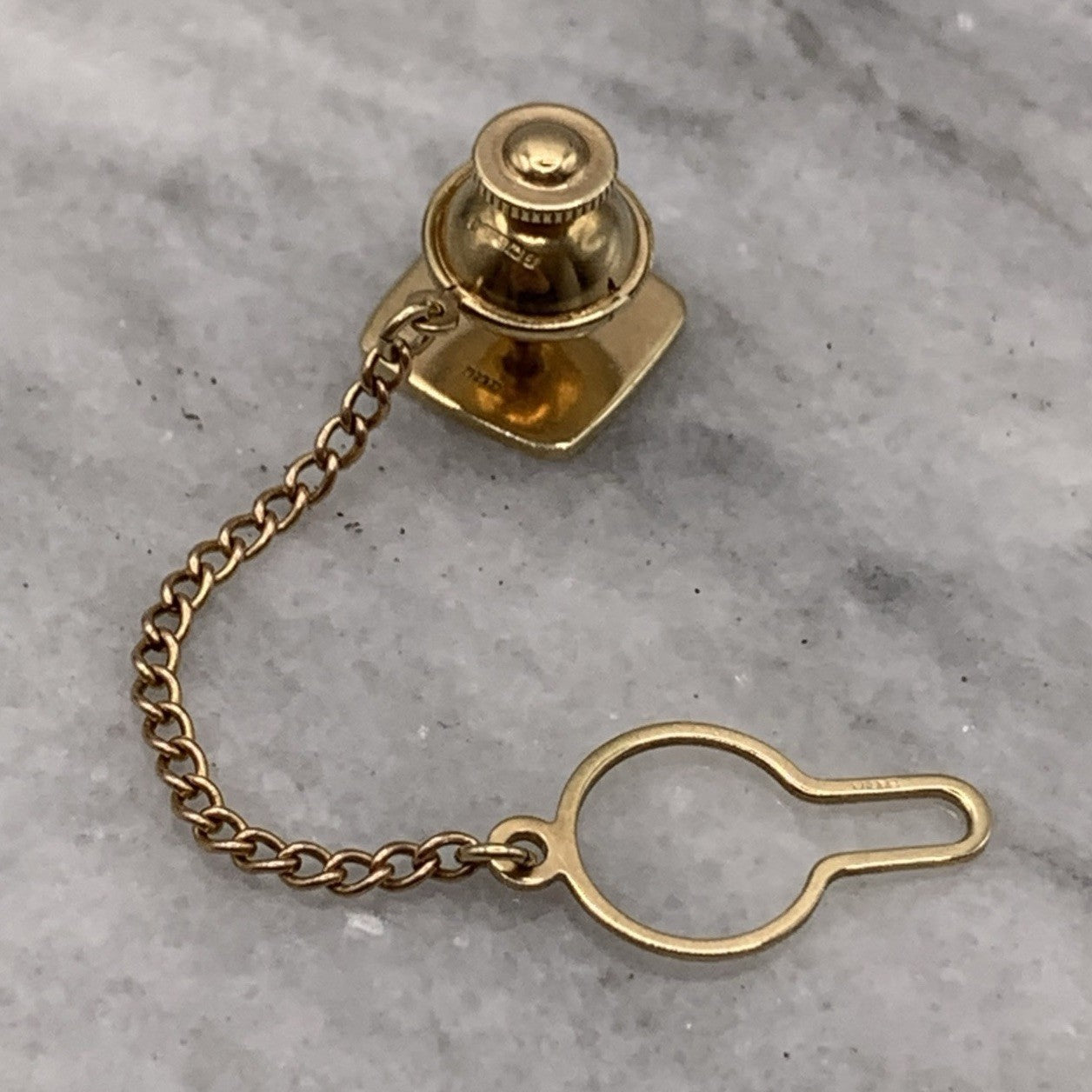 A timeless gold tie pin crafted in a rounded square shape with an embossed patterned finish. Complete with safety chain.