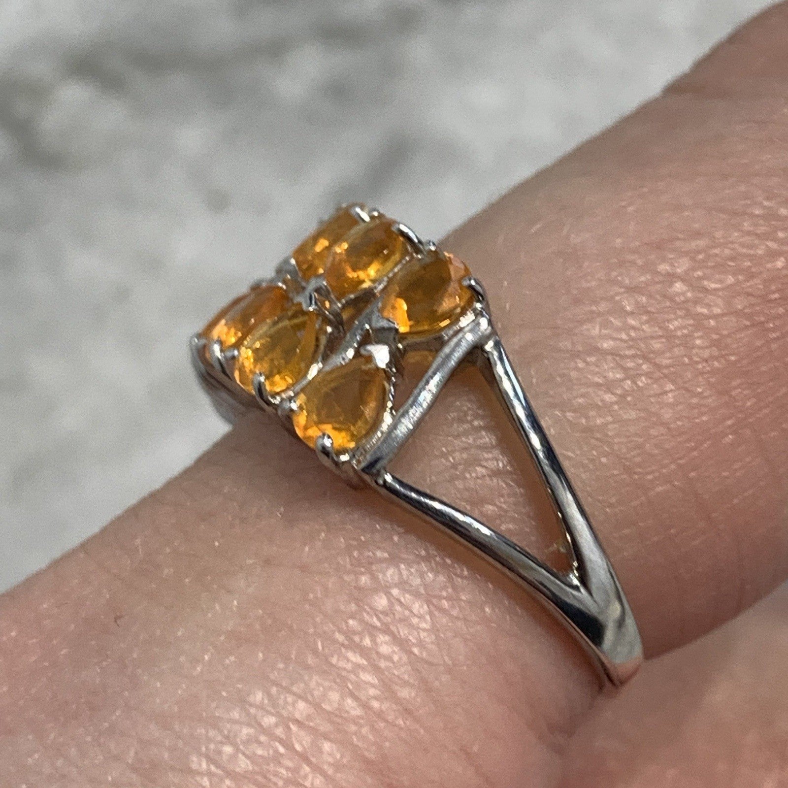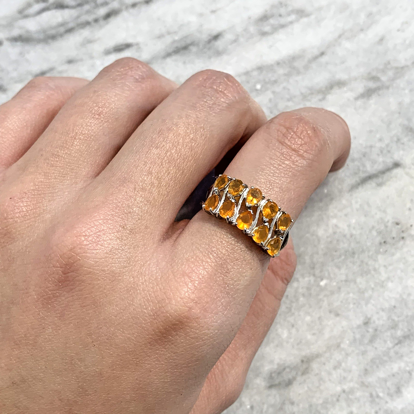 - A stunning white gold ring showcasing an ornate cluster of pear cut fire opal gemstones at .87ct.