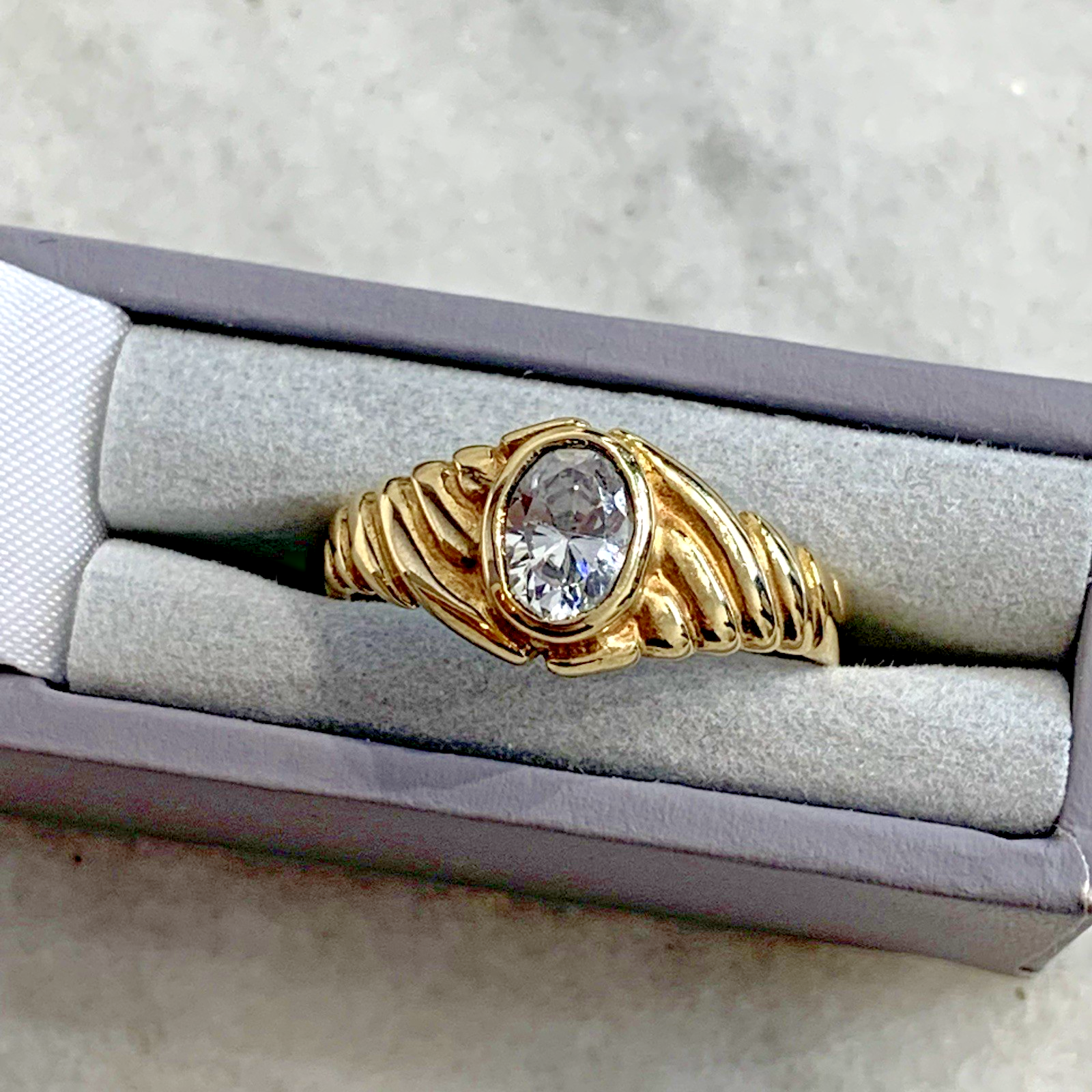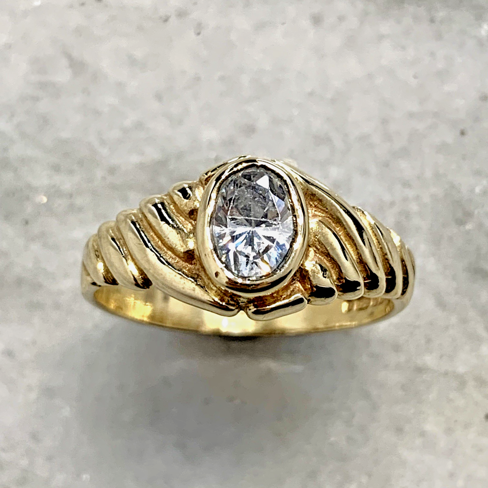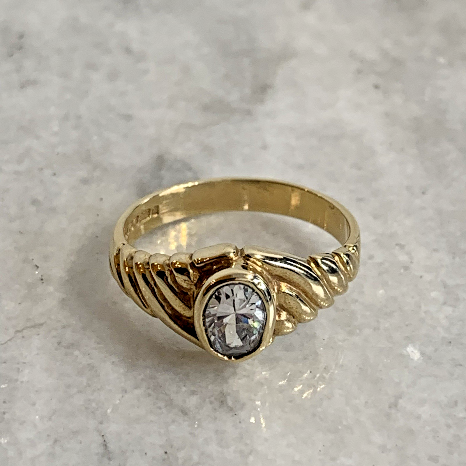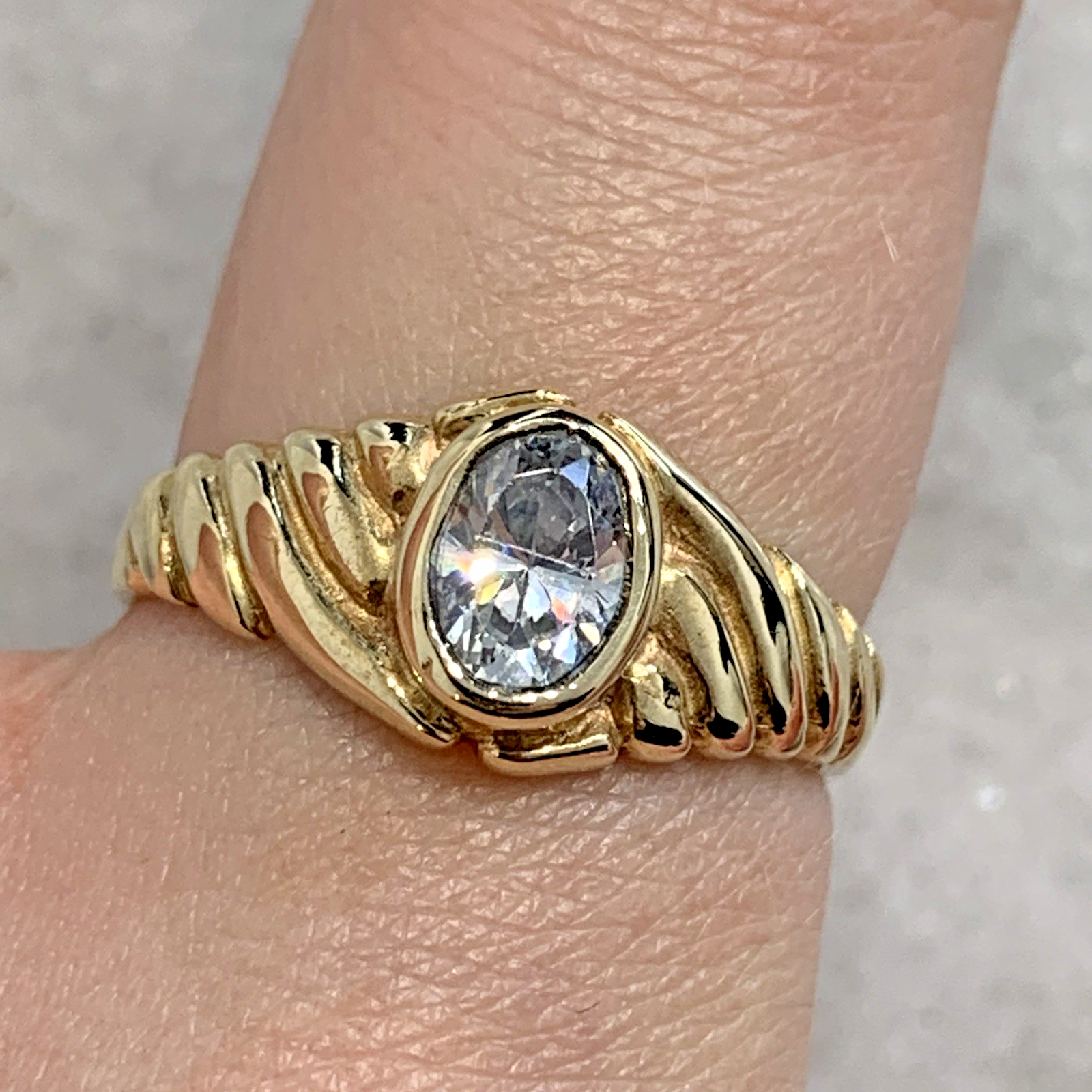 - A lovely gold solitaire ring showcasing an oval cut Goshenite (white beryl) gemstone in a bezel setting, with textured shoulders to accent. Tiny surface scratch to table of stone, only noticeable under very close / magnified inspection.