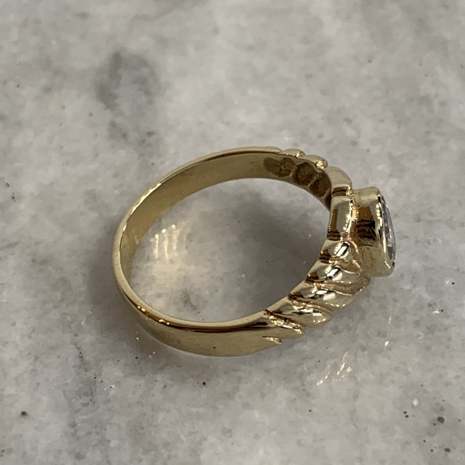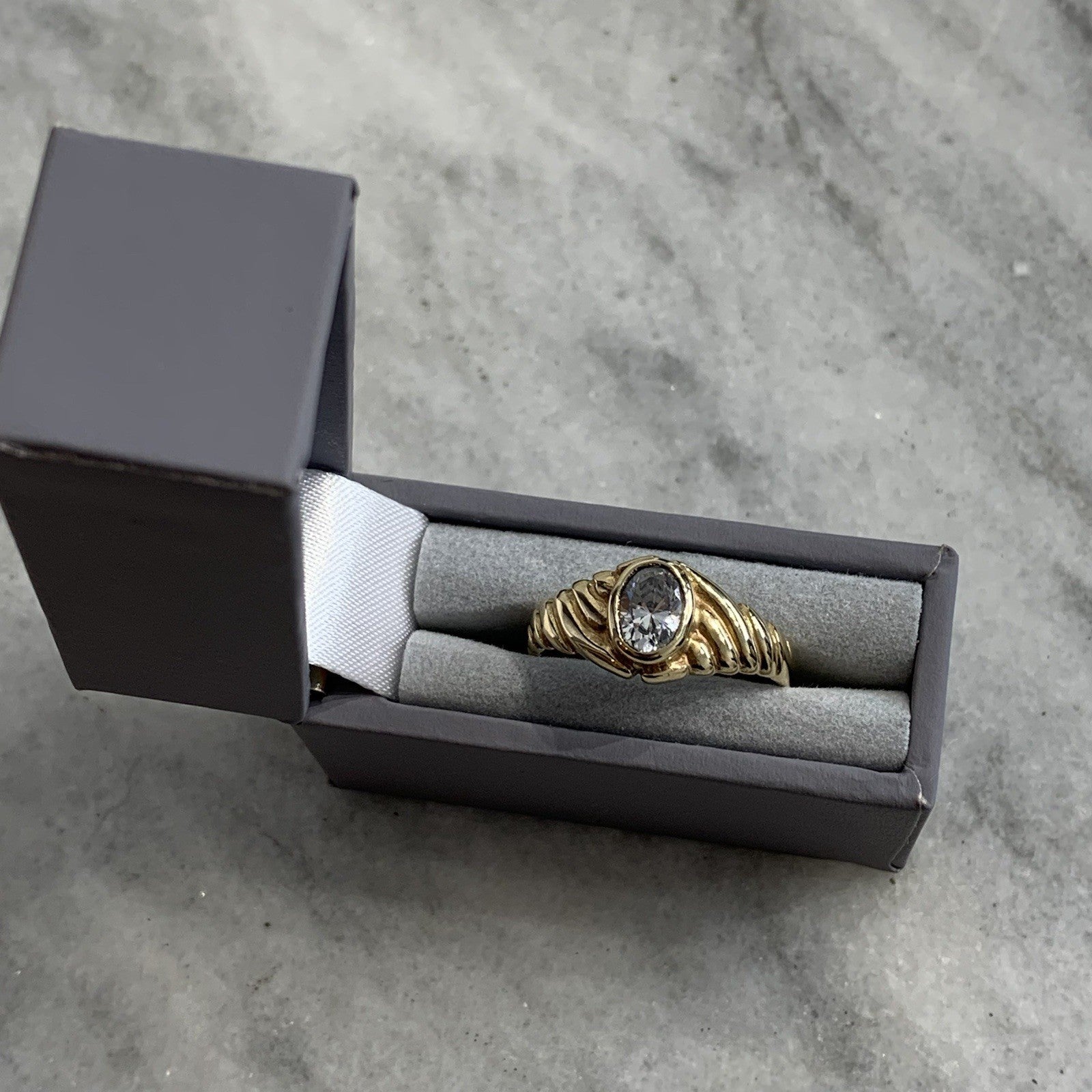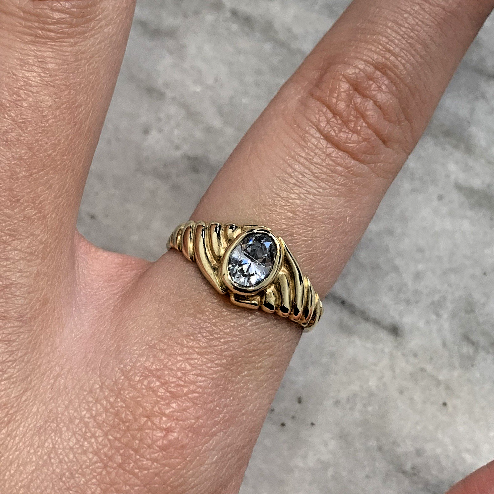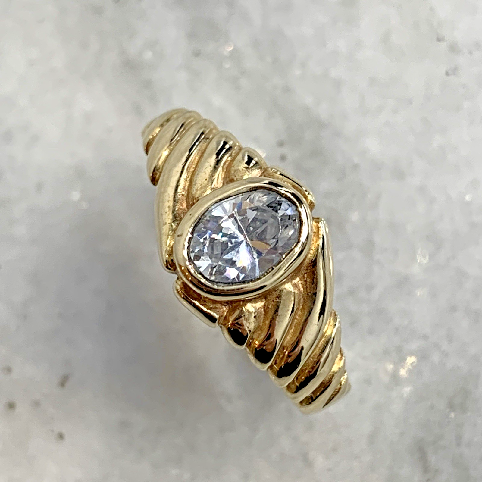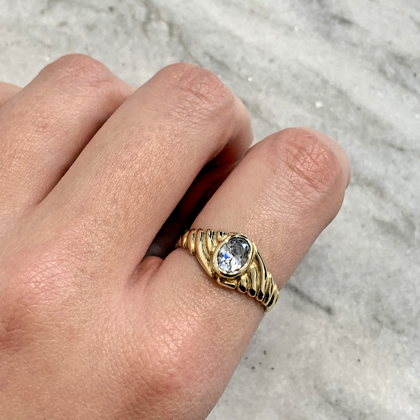 - A lovely gold solitaire ring showcasing an oval cut Goshenite (white beryl) gemstone in a bezel setting, with textured shoulders to accent. Tiny surface scratch to table of stone, only noticeable under very close / magnified inspection.