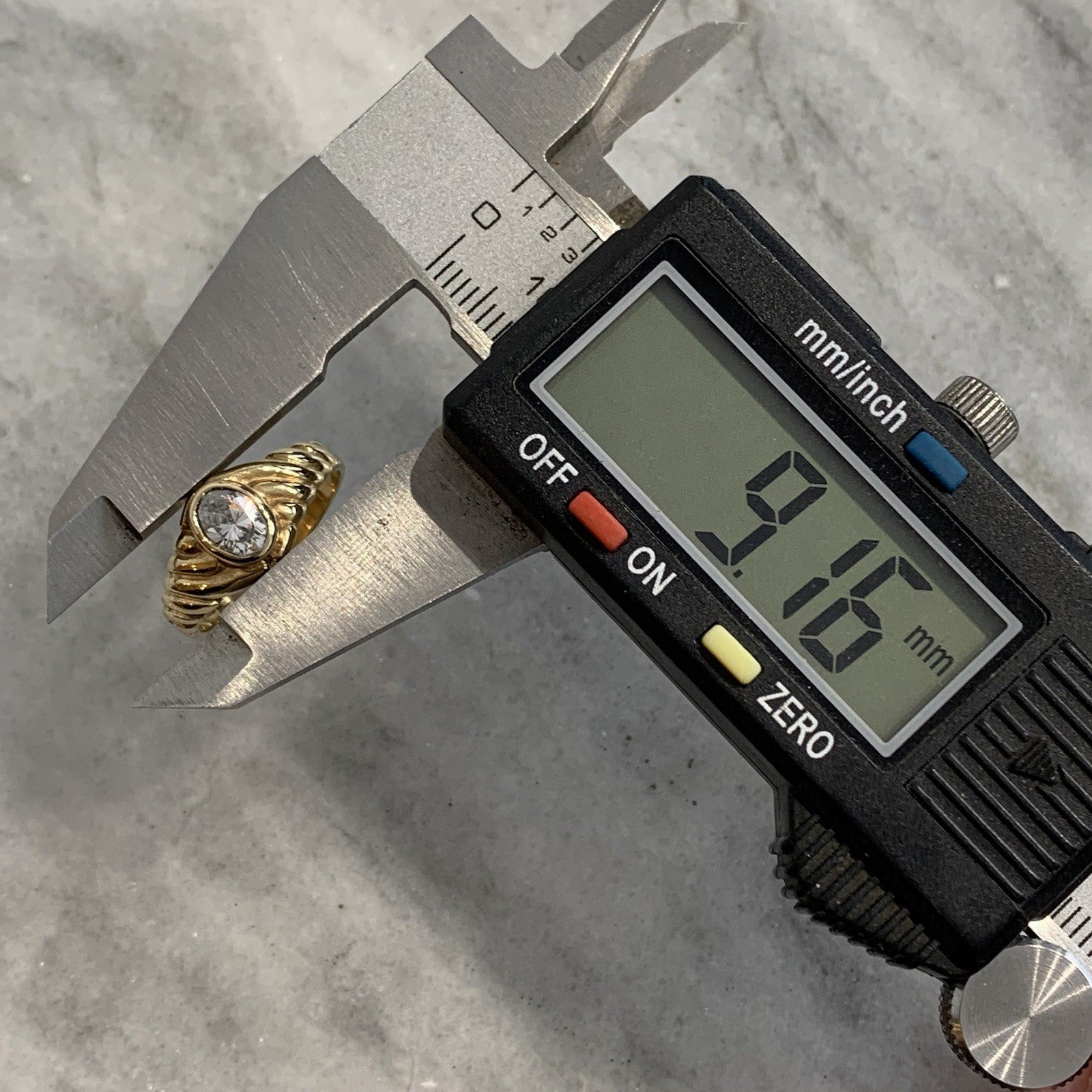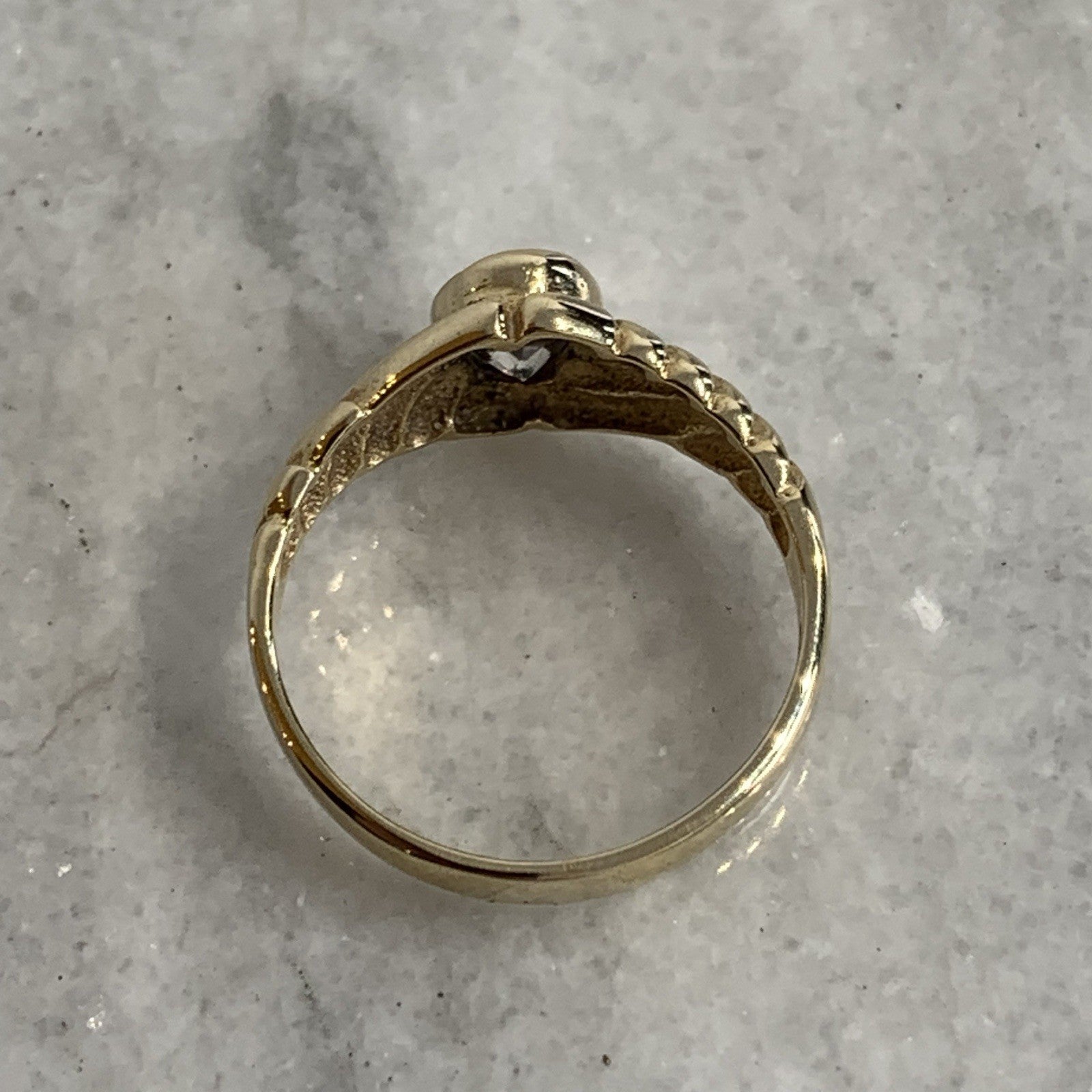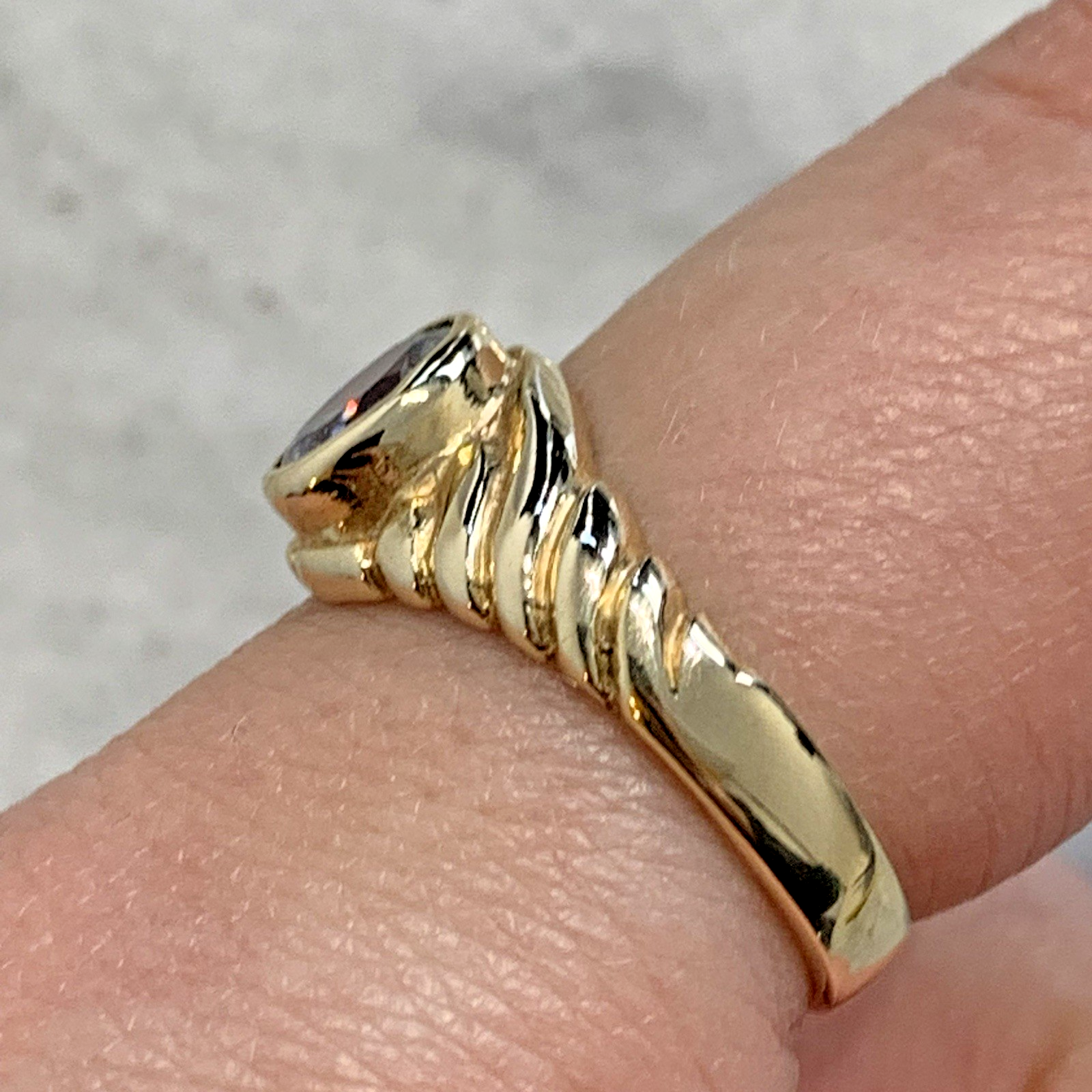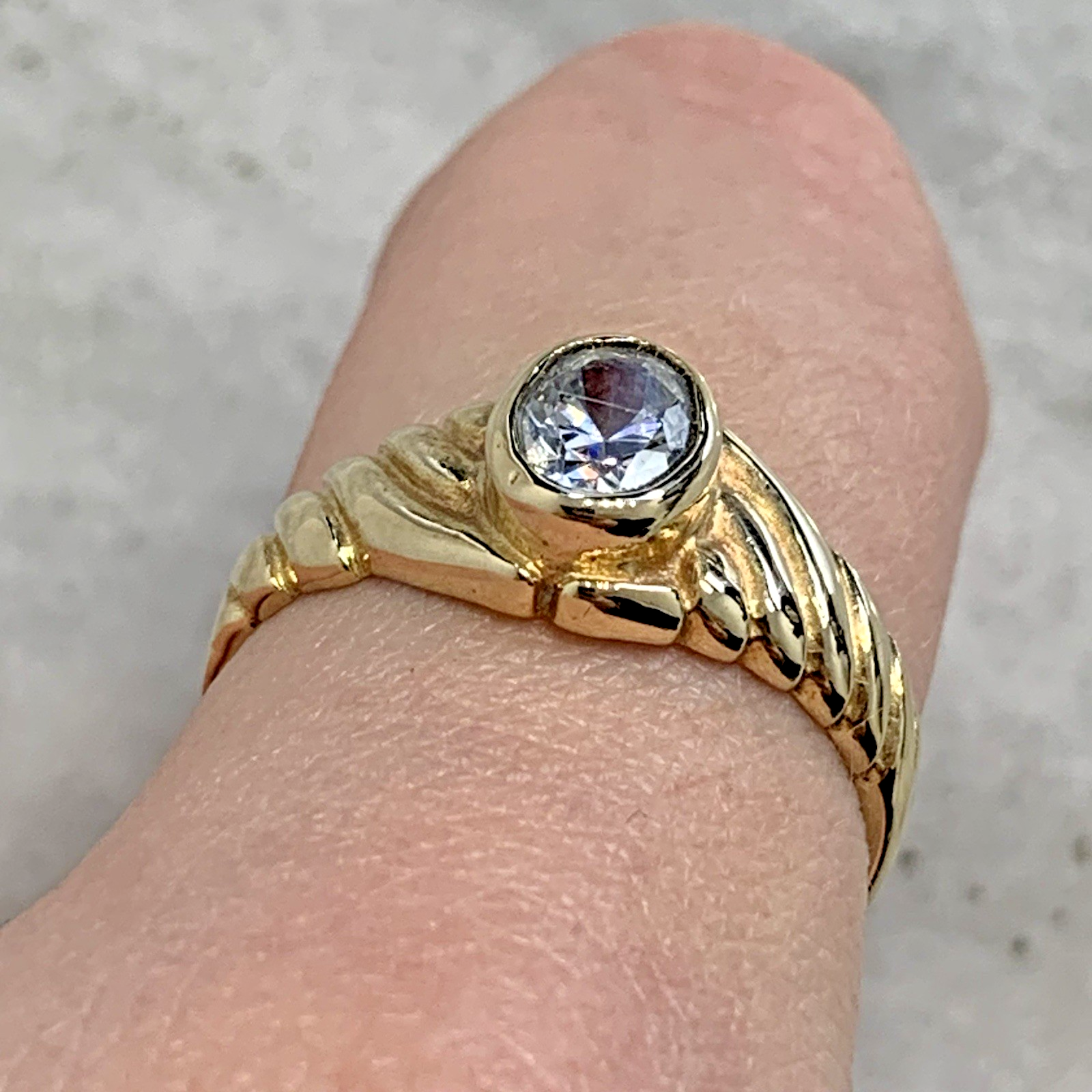 - A lovely gold solitaire ring showcasing an oval cut Goshenite (white beryl) gemstone in a bezel setting, with textured shoulders to accent. Tiny surface scratch to table of stone, only noticeable under very close / magnified inspection.