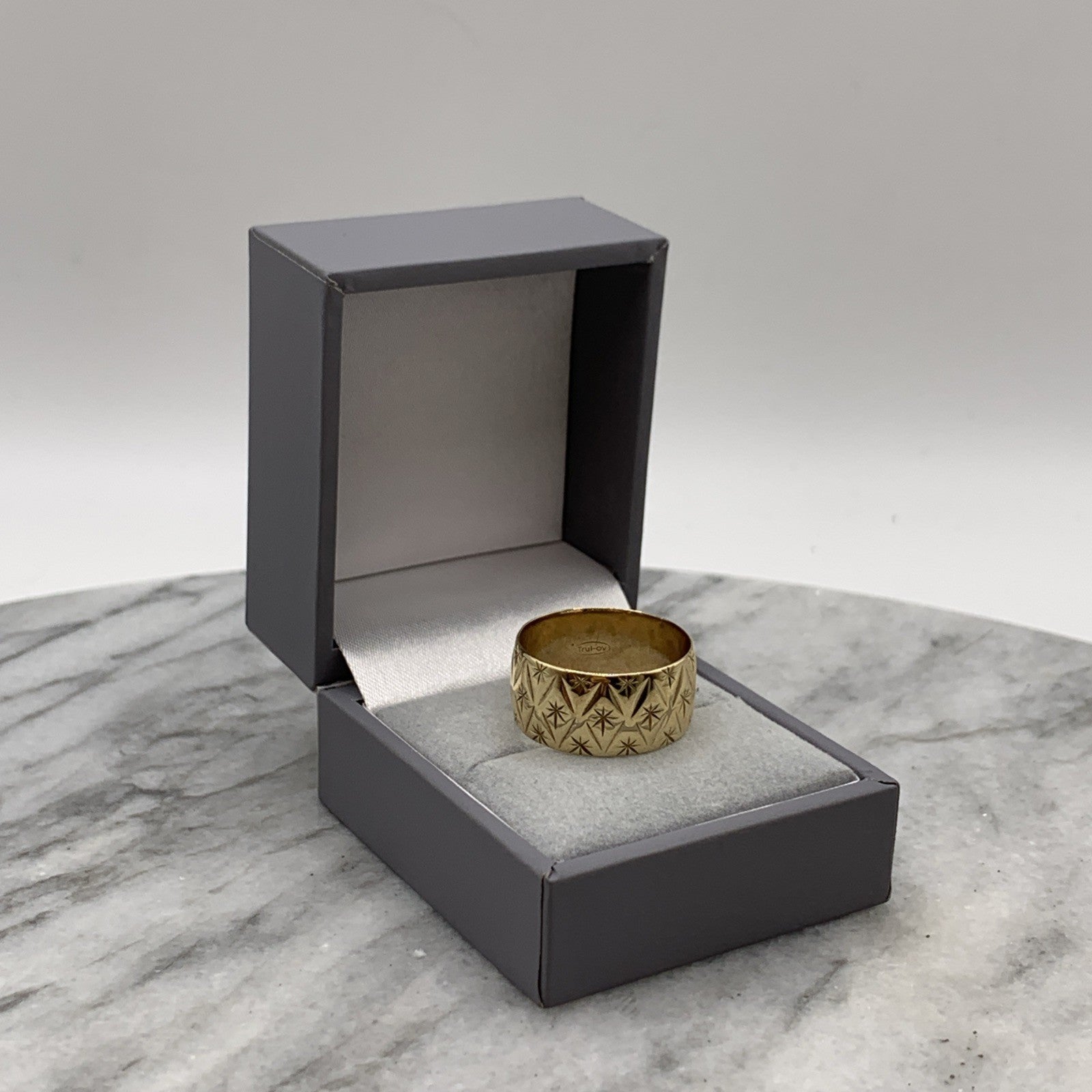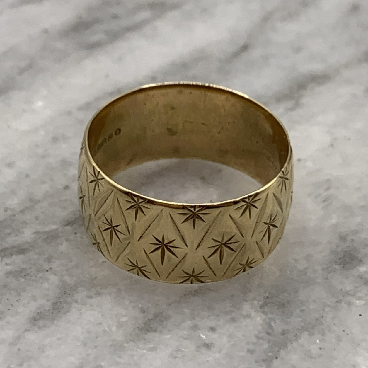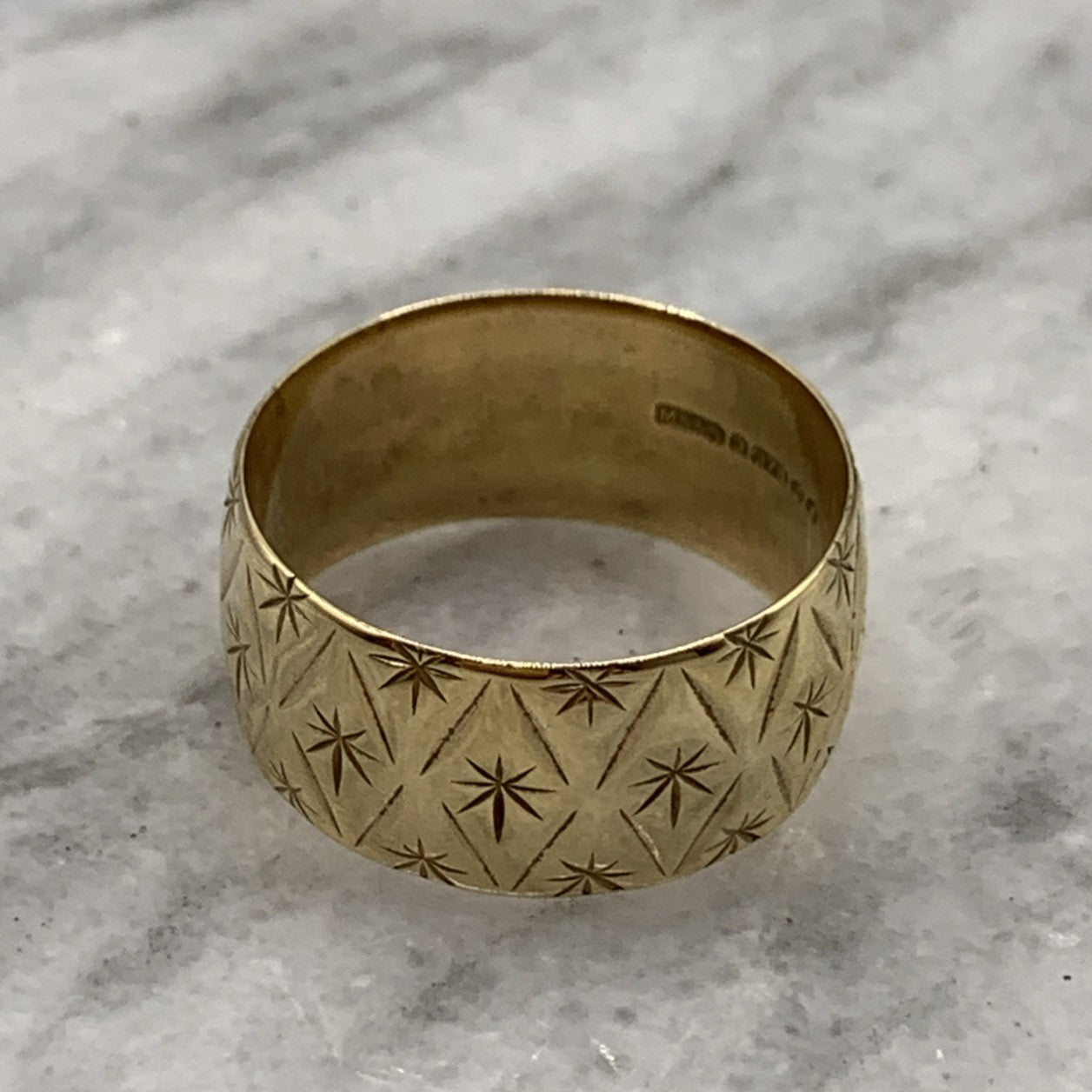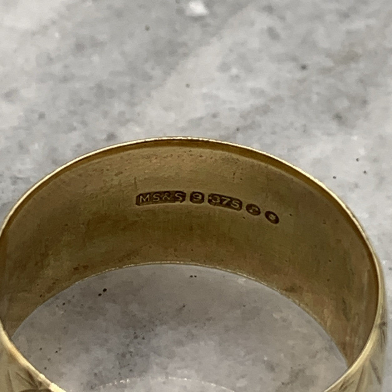 9 ct Gold Patterned Band Ring 375 Yellow Gold - Size Q 1/2