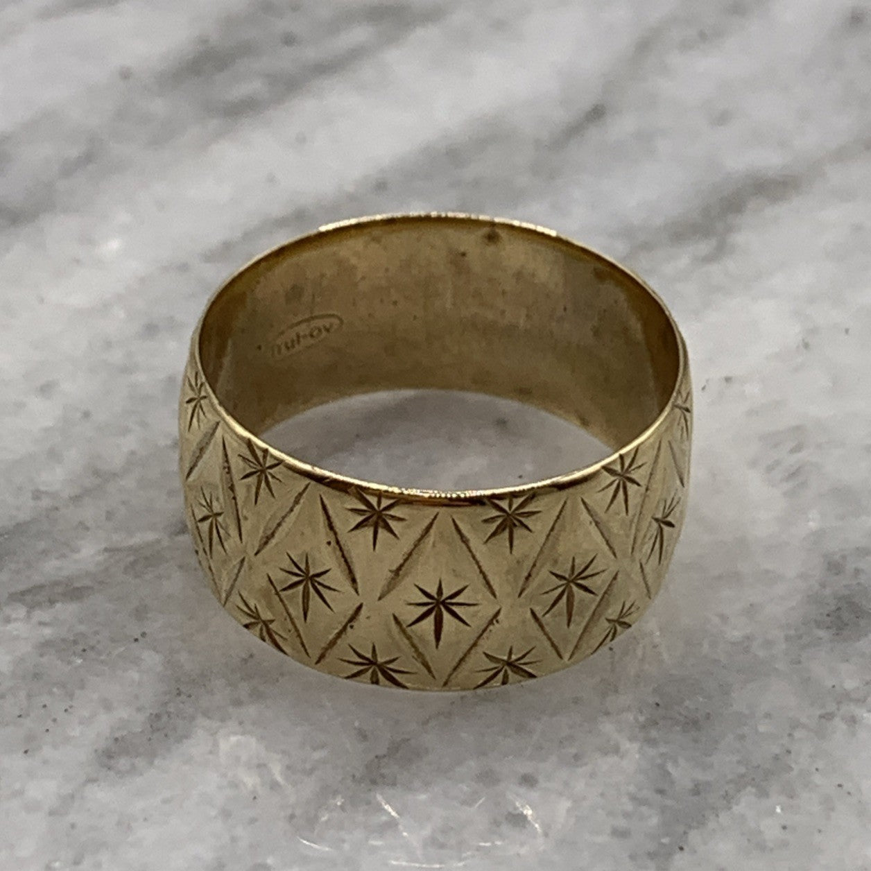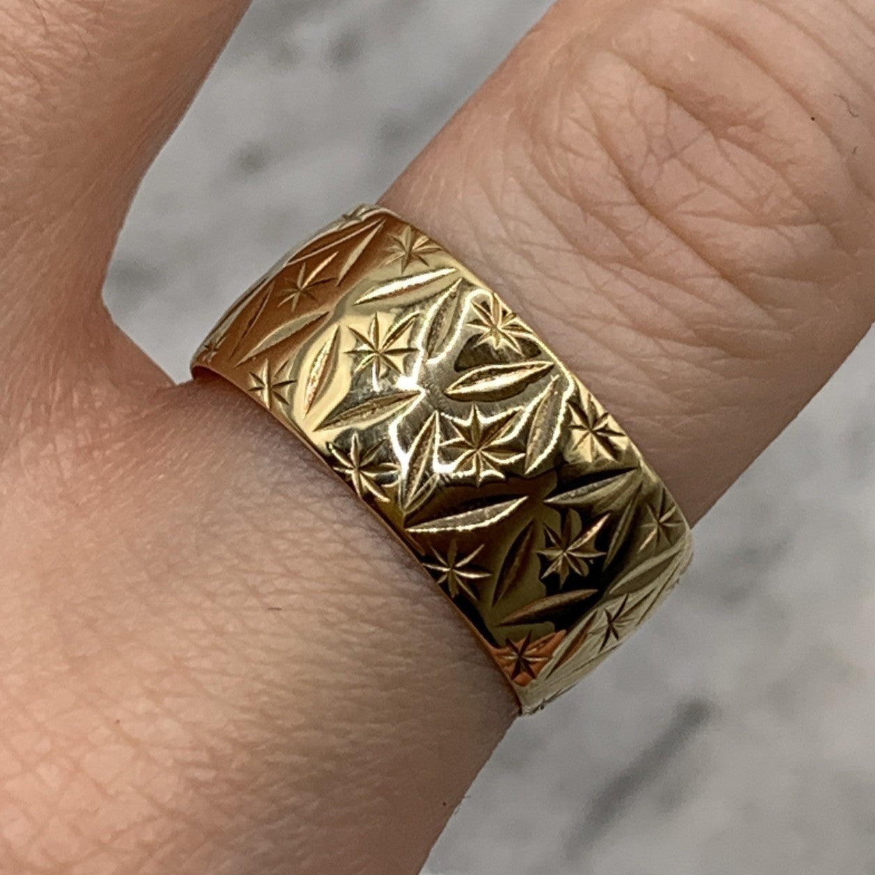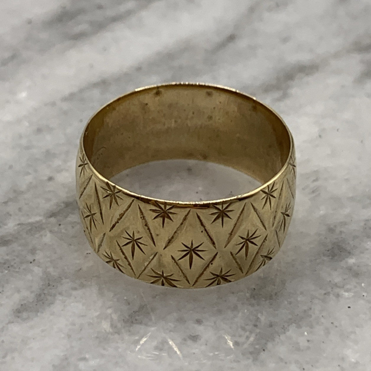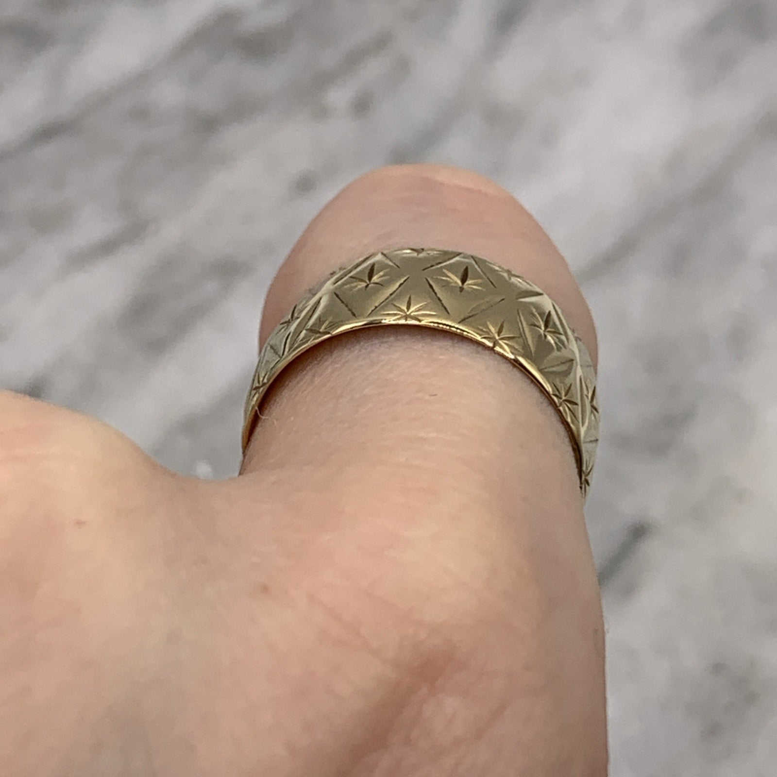 9 ct Gold Patterned Band Ring 375 Yellow Gold - Size Q 1/2