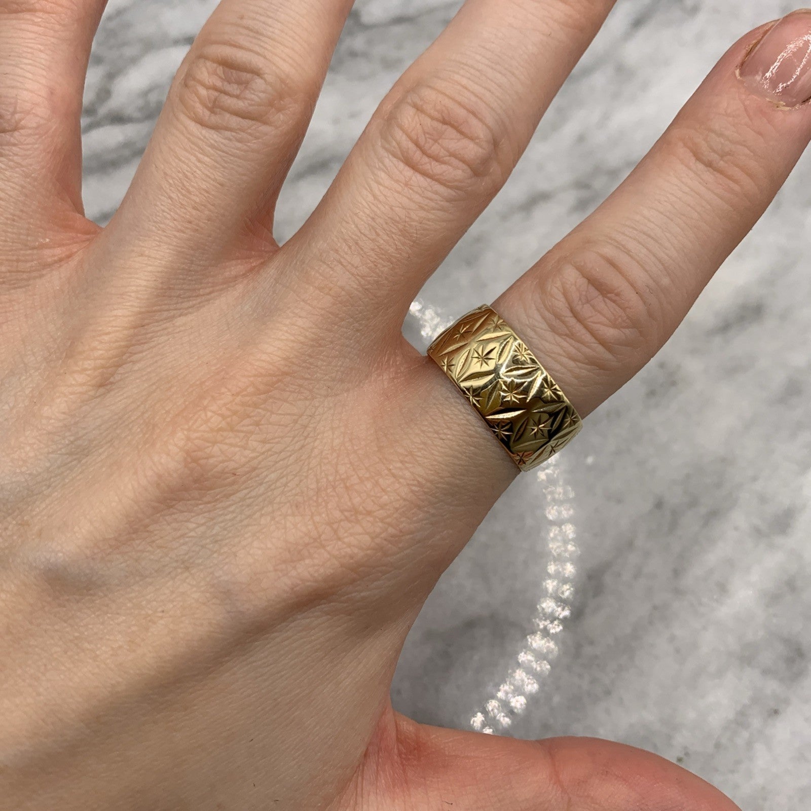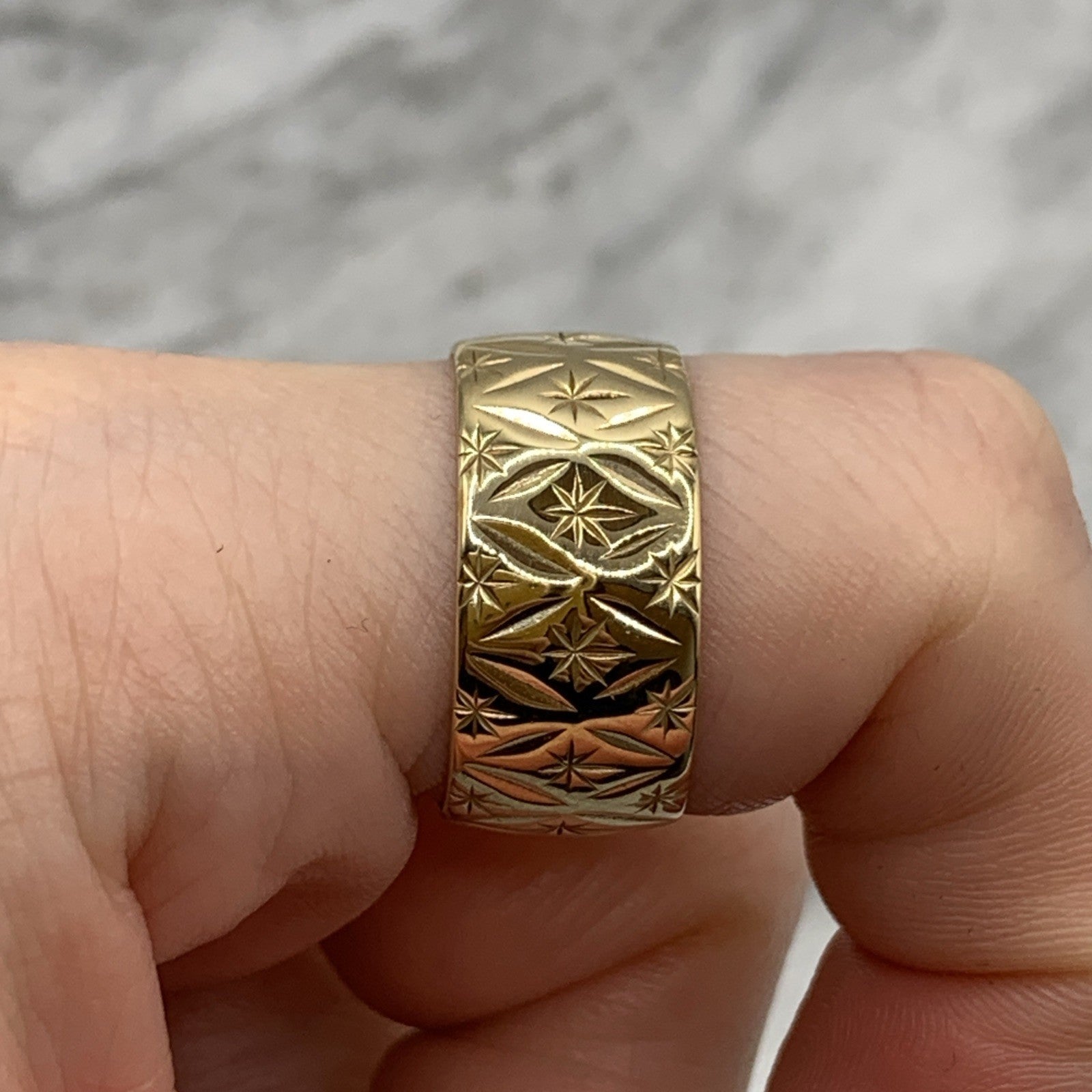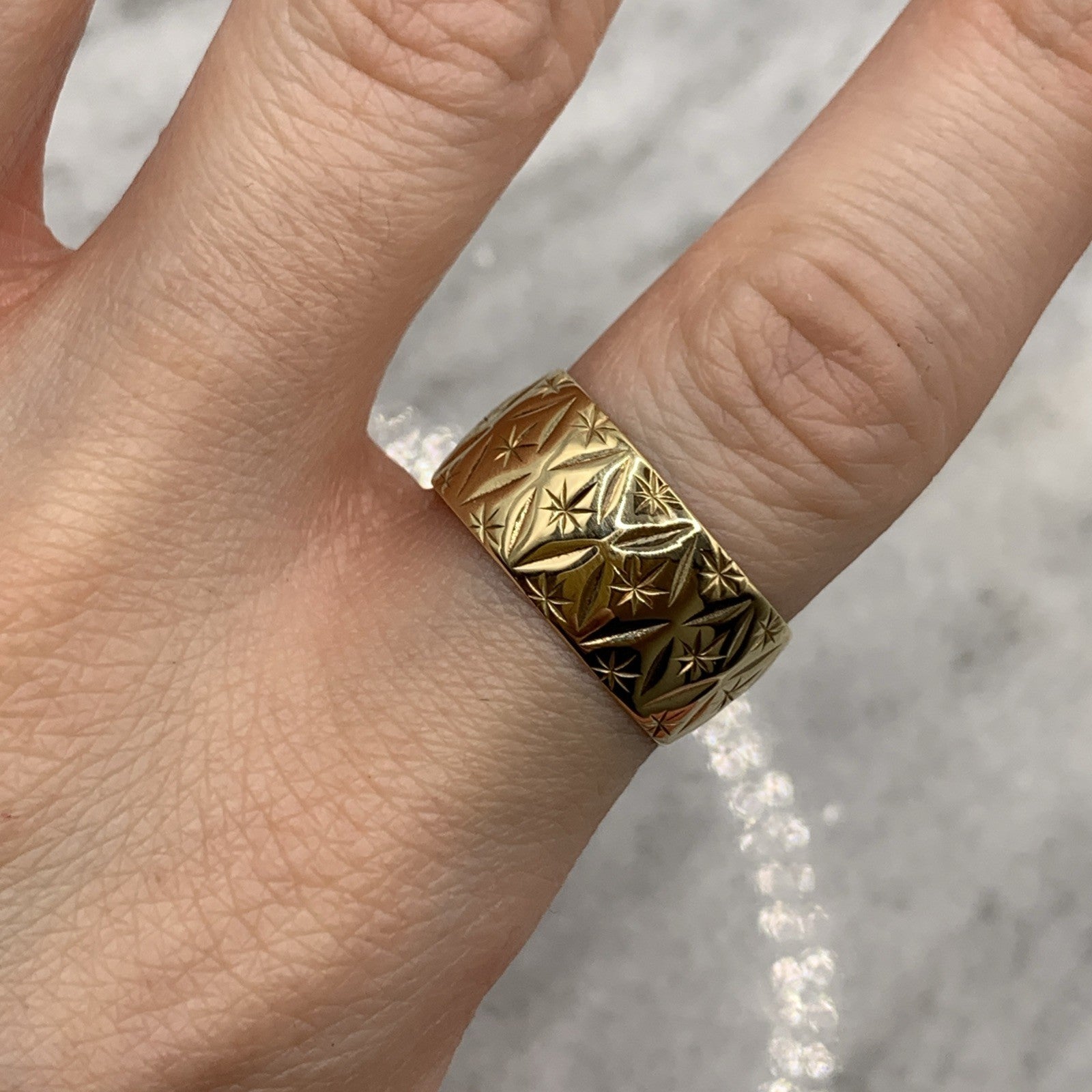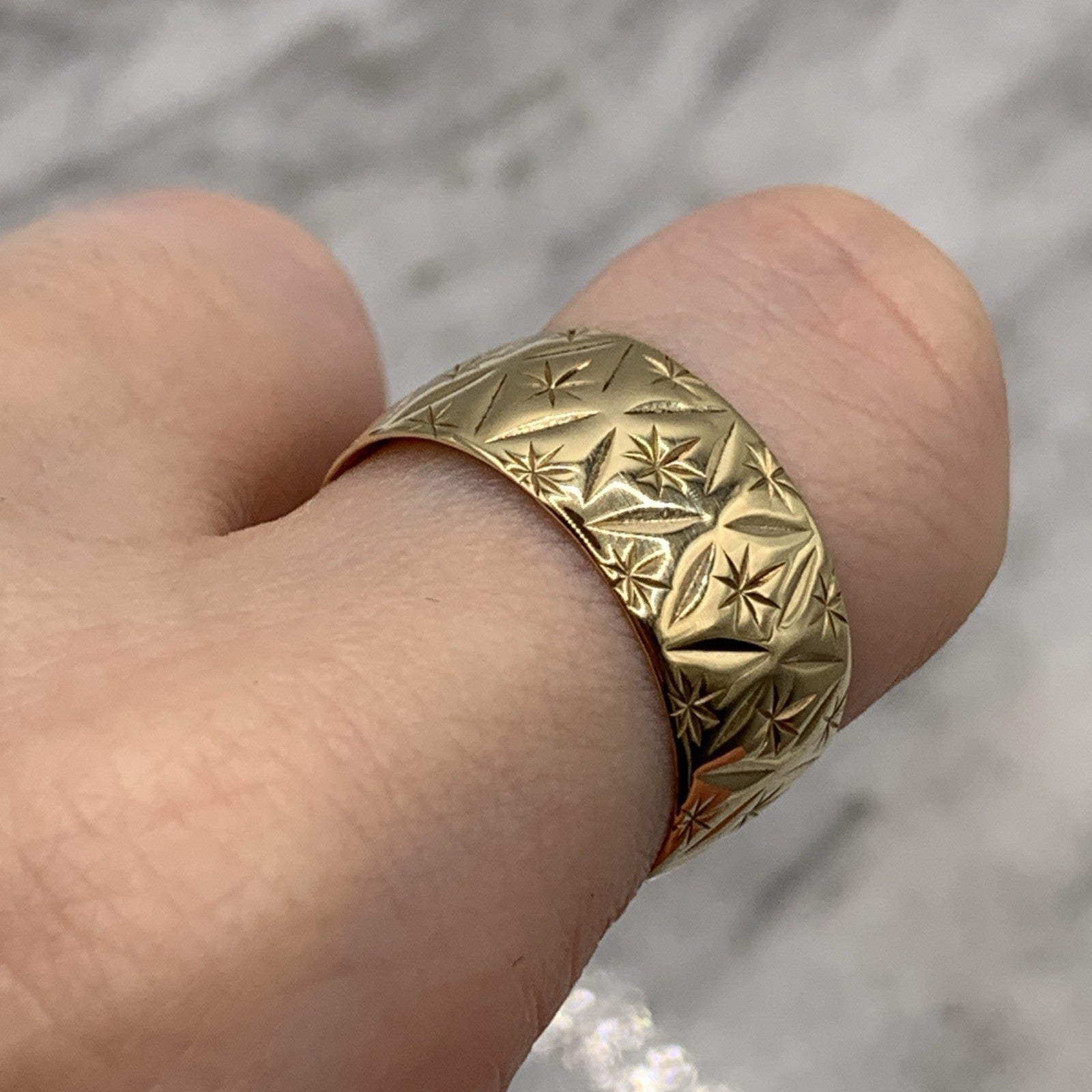 9 ct Gold Patterned Band Ring 375 Yellow Gold - Size Q 1/2