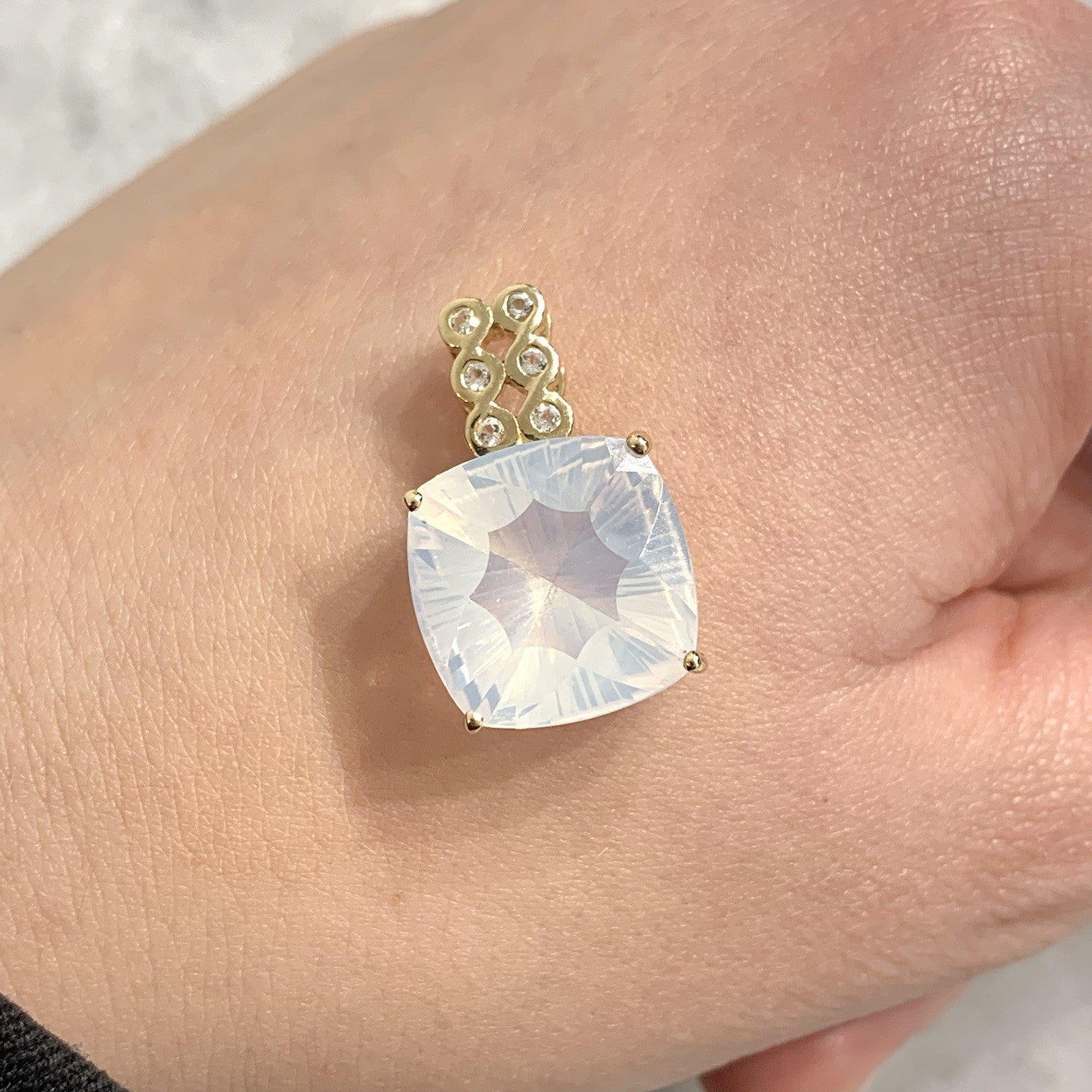 - A stunning gold pendant showcasing an ornate cushion cut mystic moon quartz which has a milky colour with flashes, accented by six petite bezel set white topaz gemstones.