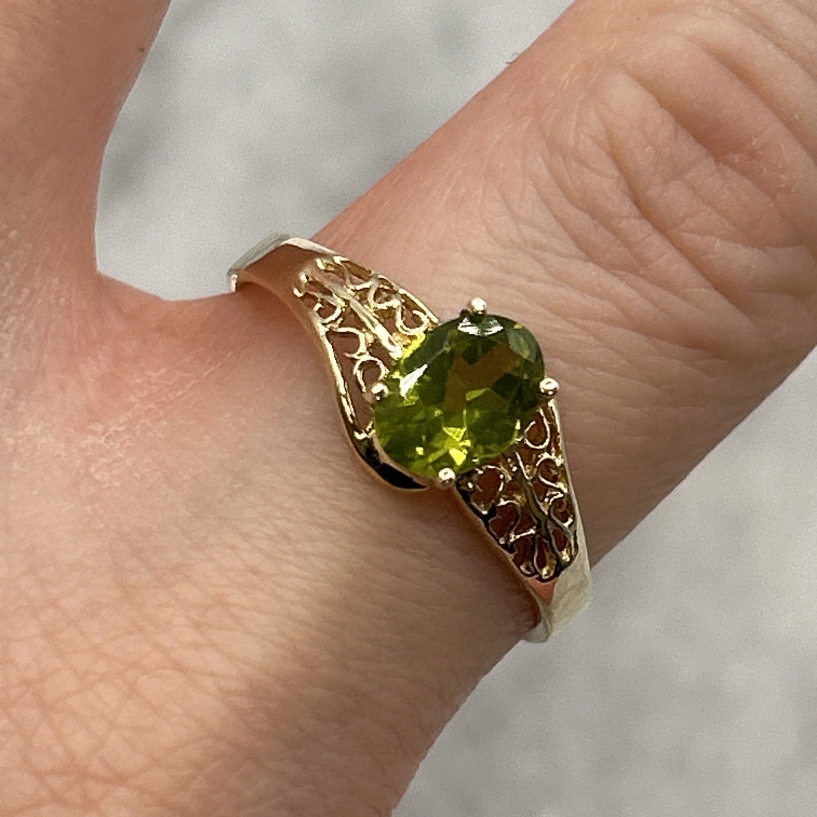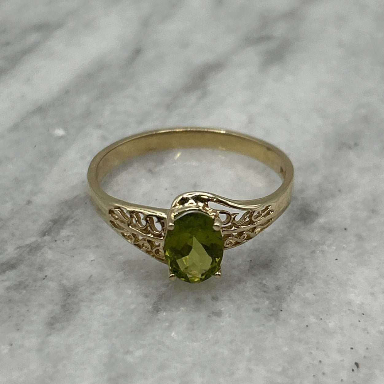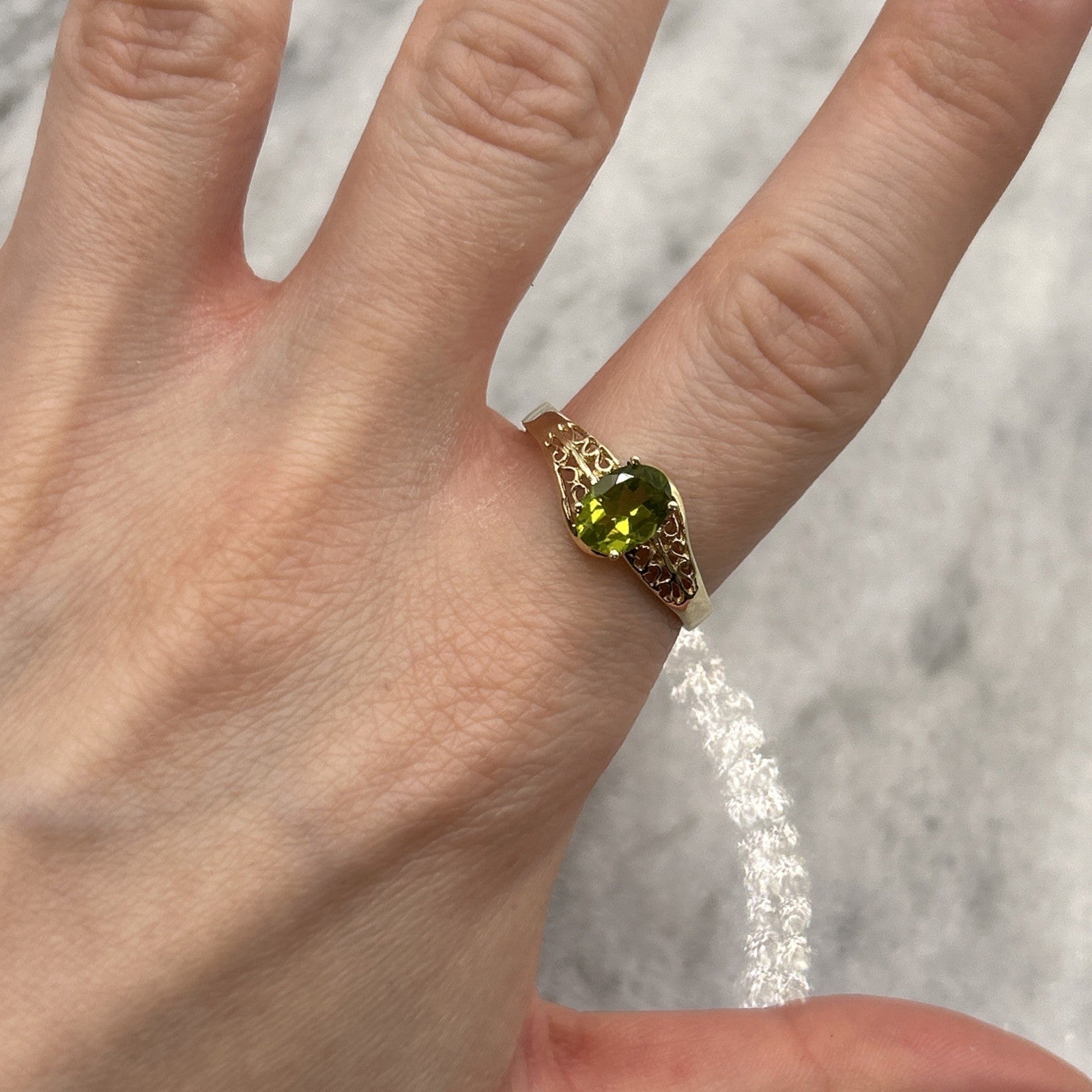 A stunning yellow gold ring showcasing an oval cut solitaire peridot, accented by intricate filigree metalwork shoulders.