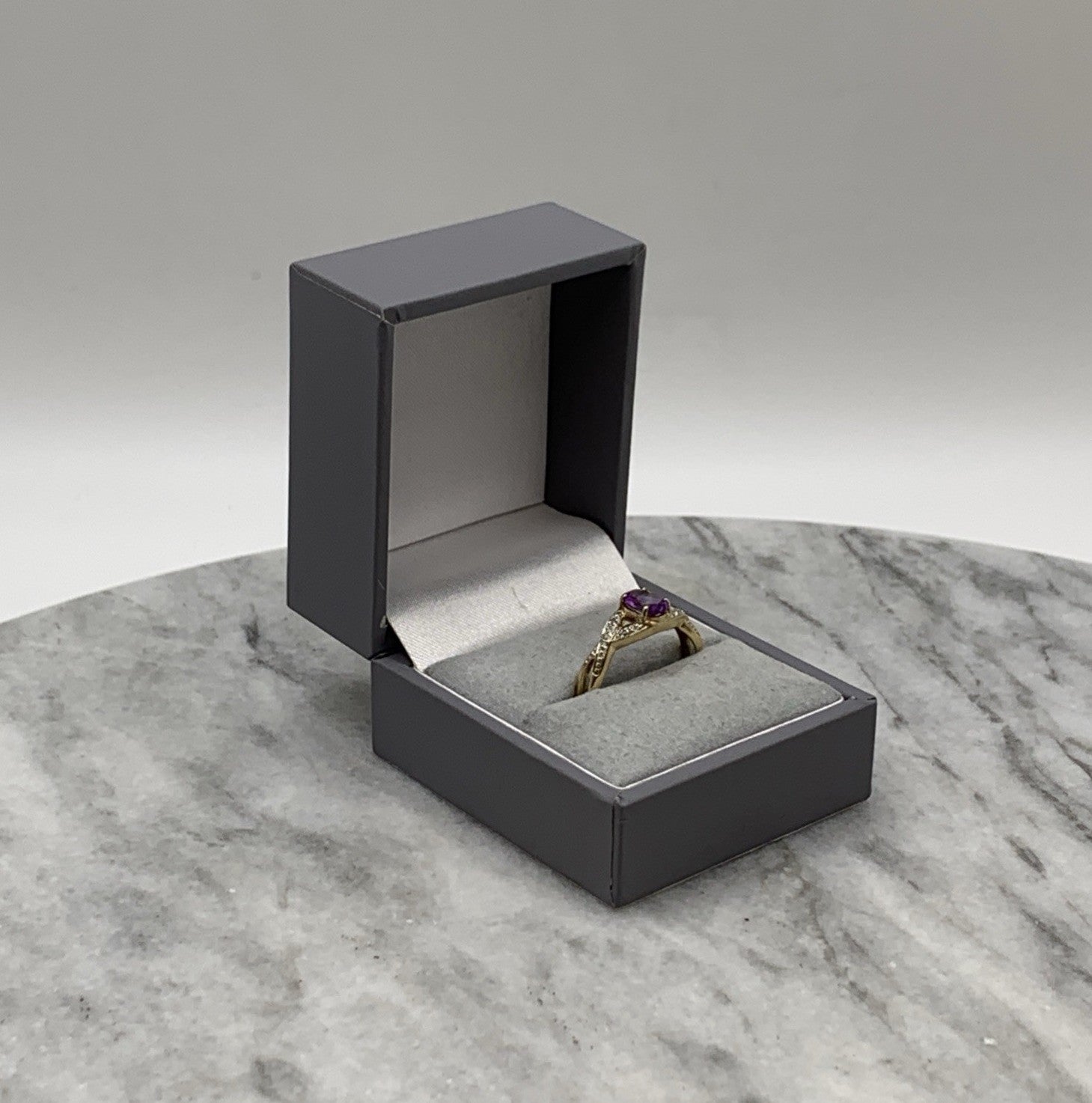 - A gorgeous gold ring showcasing an oval cut amethyst upon diamond adorned crossover style shoulders. Hallmarked.