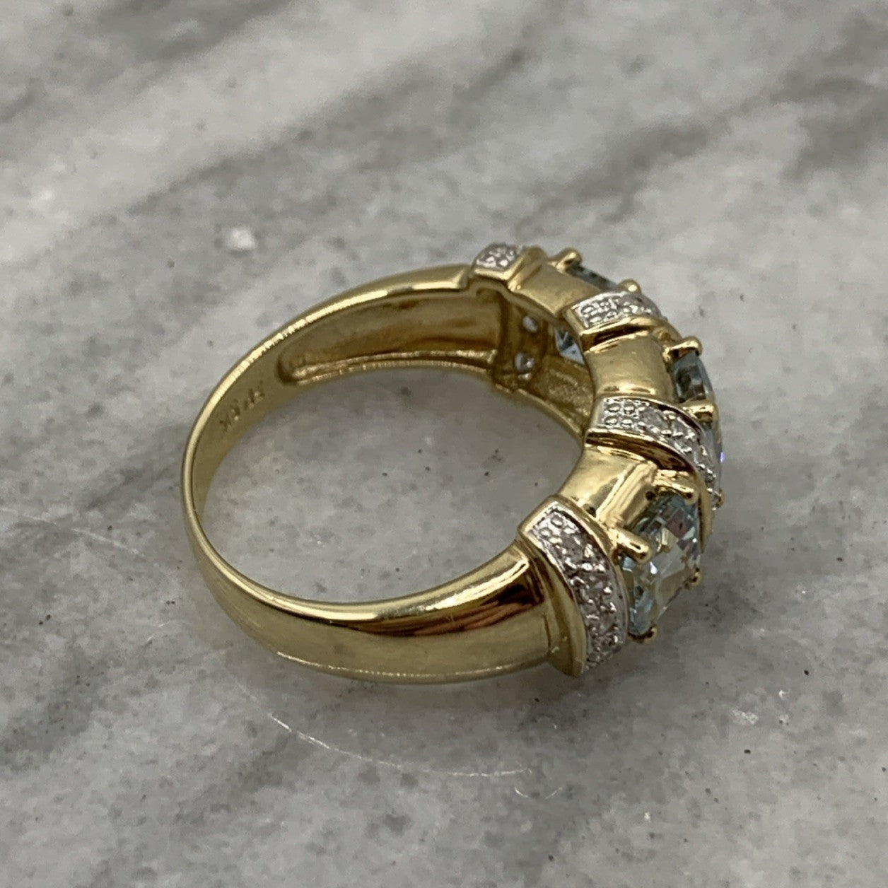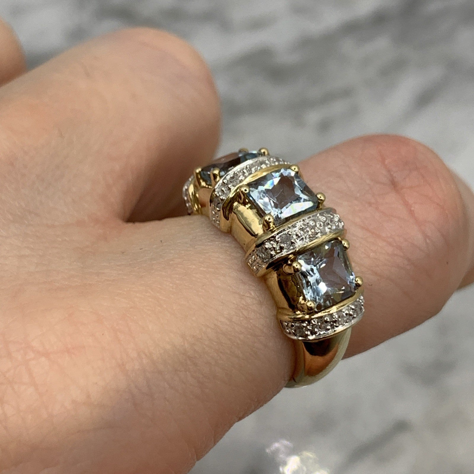 - A gorgeous gold ring featuring a trilogy of princess cut aquamarine gemstones accented by petite pave set diamonds. Hallmarked.