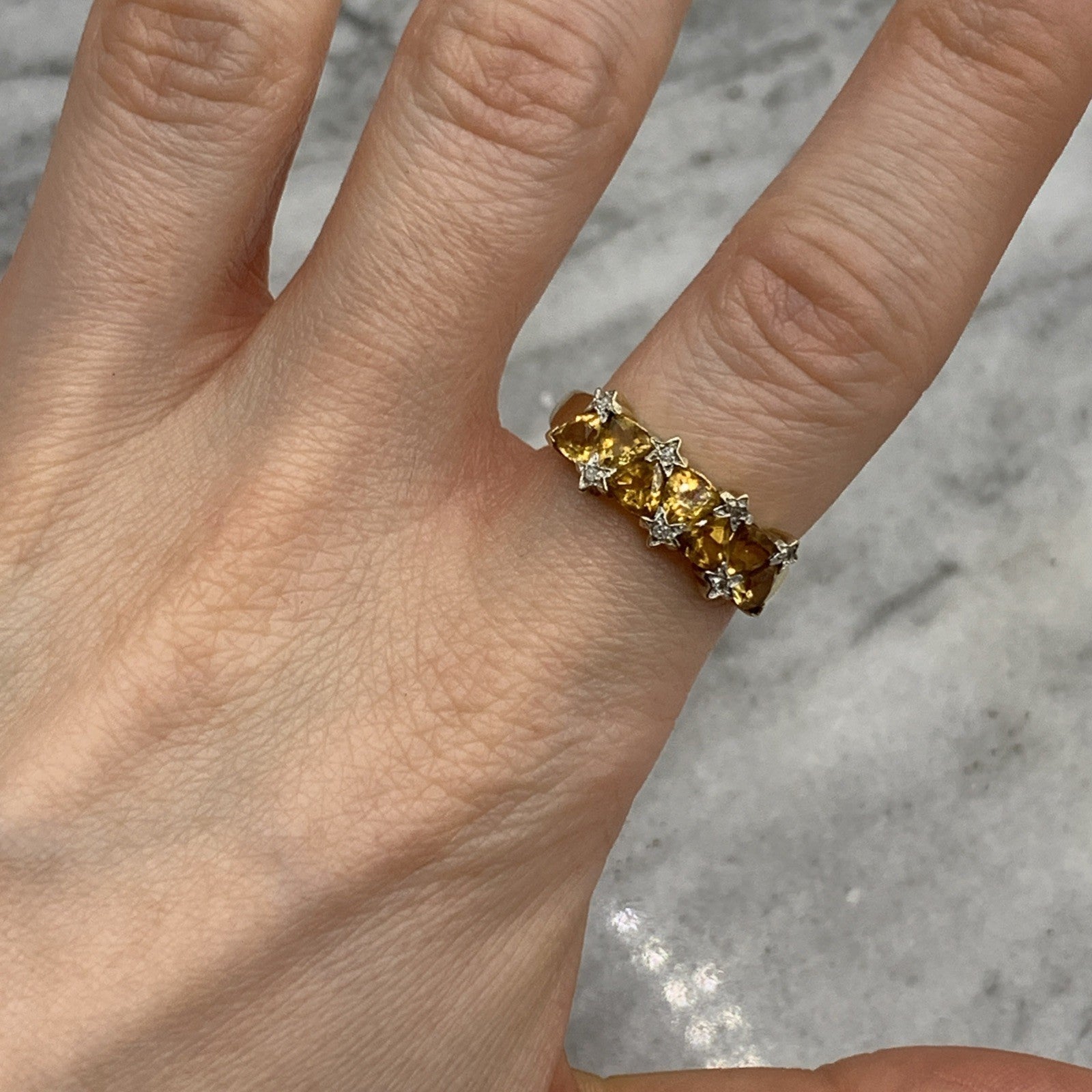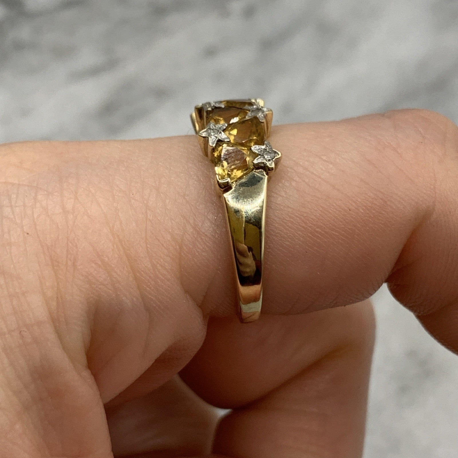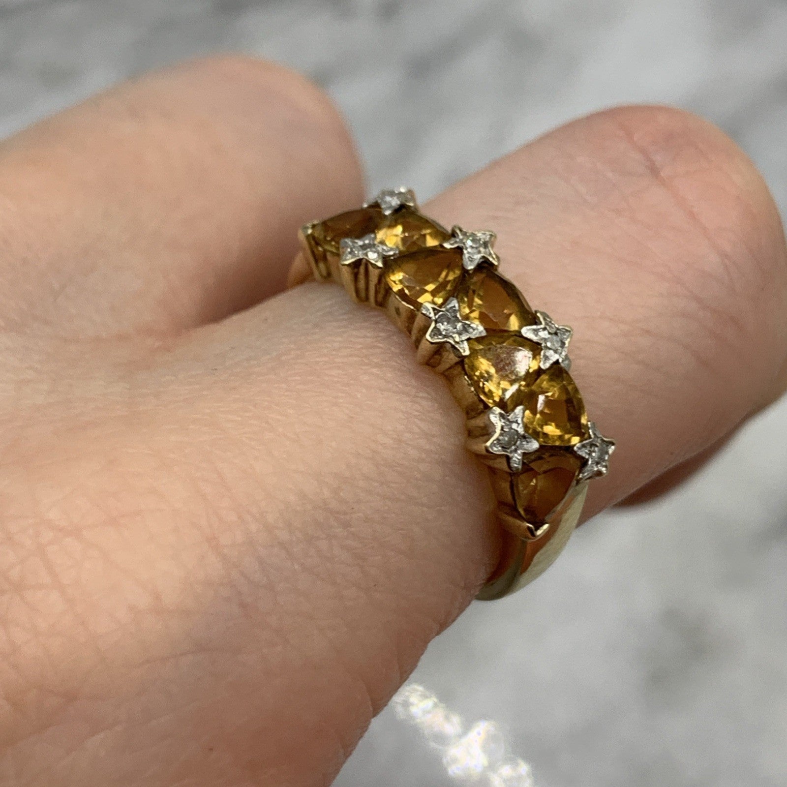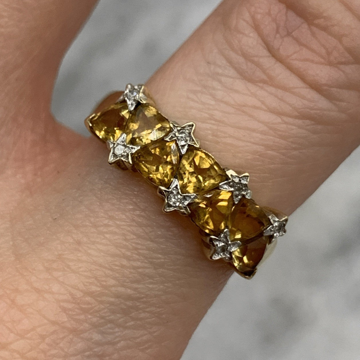 - A charming gold ring featuring a cluster of trilliant cut citrines and petite star set diamonds. Hallmarked.