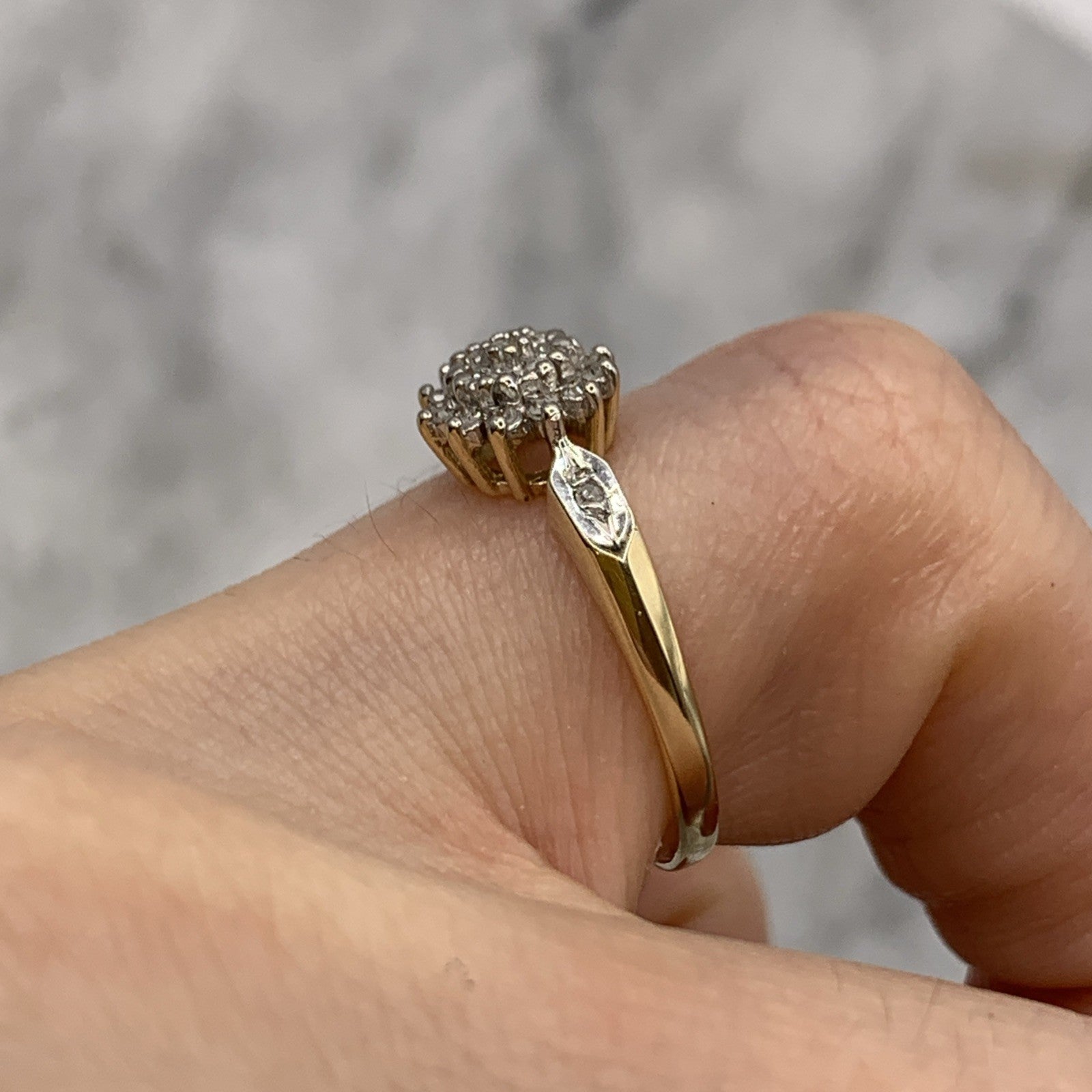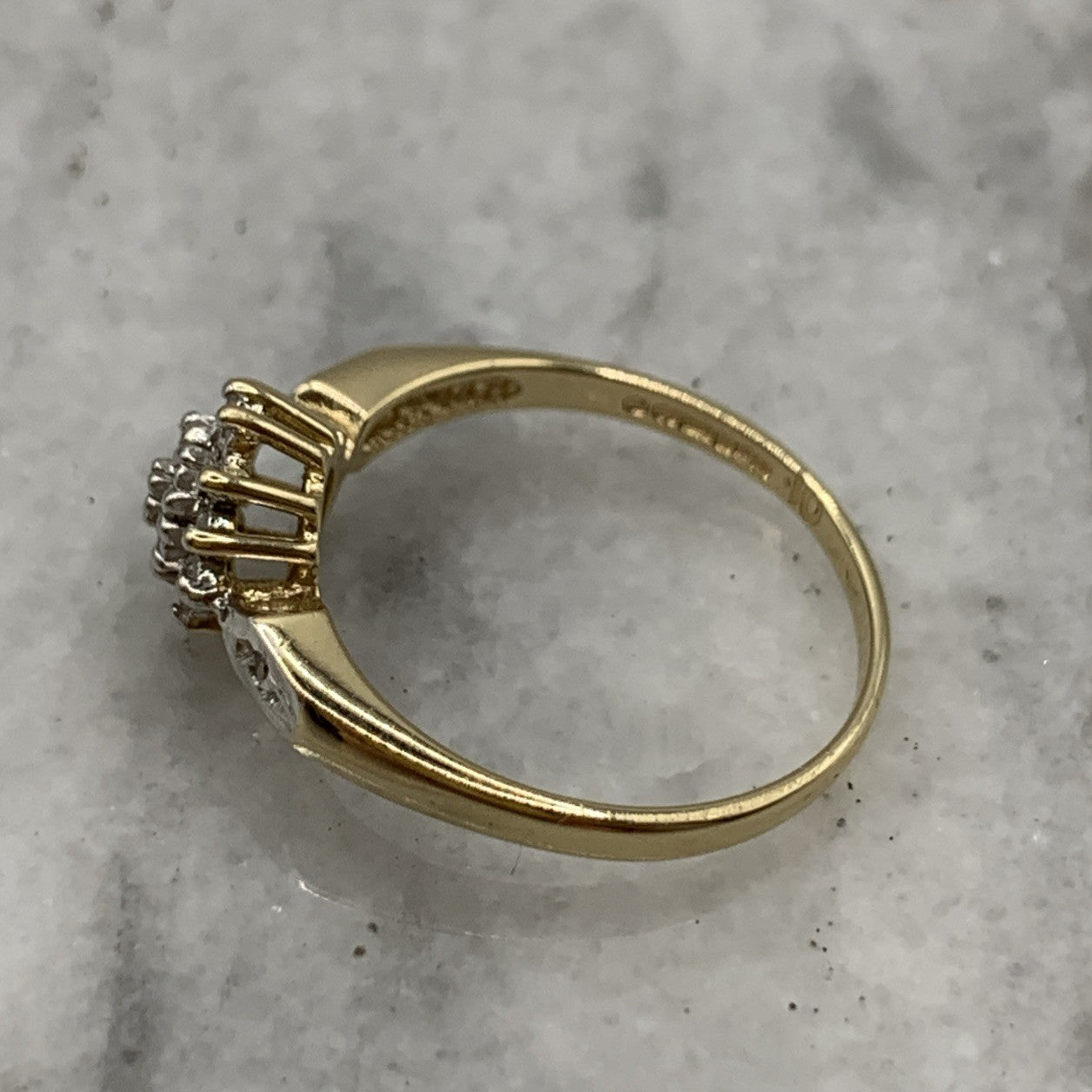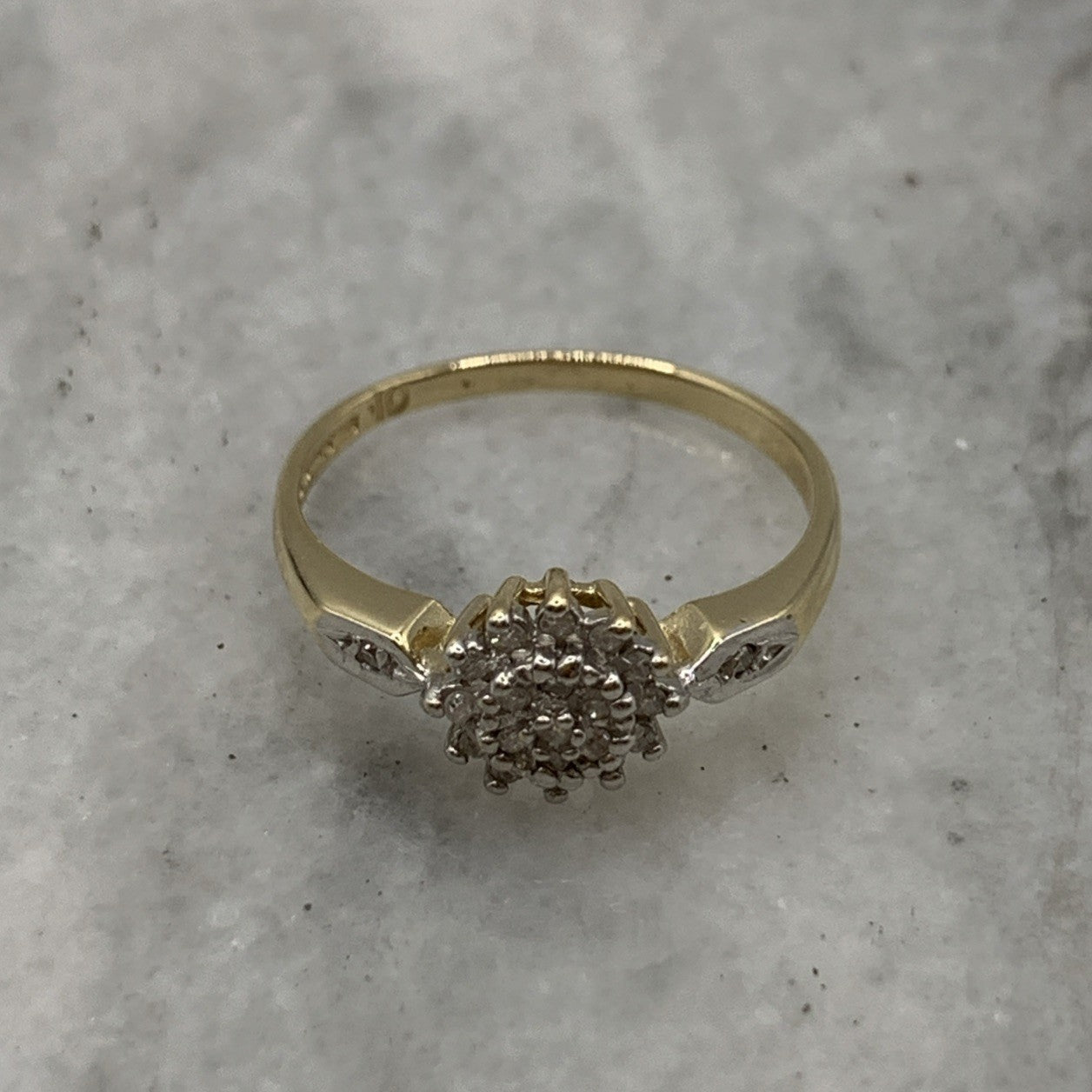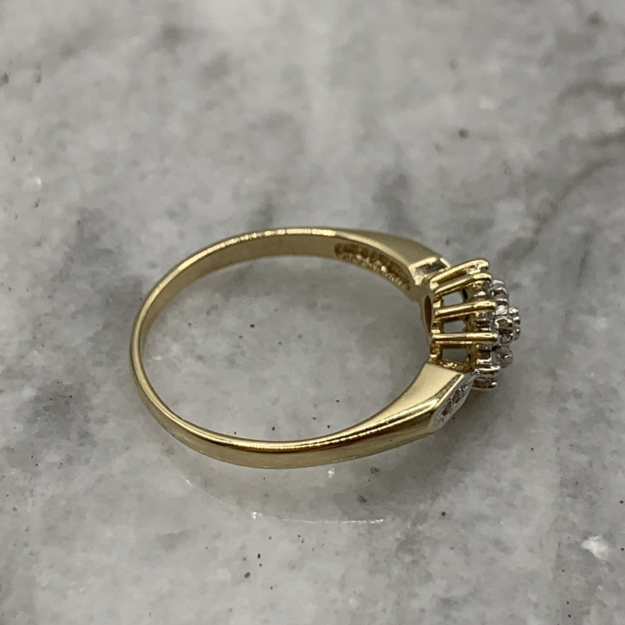 - A gorgeous gold ring featuring a cluster of petite diamonds amounting to .10ct. Hallmarked.