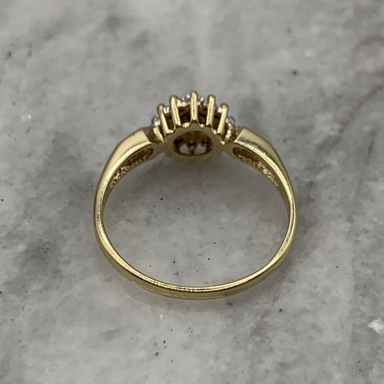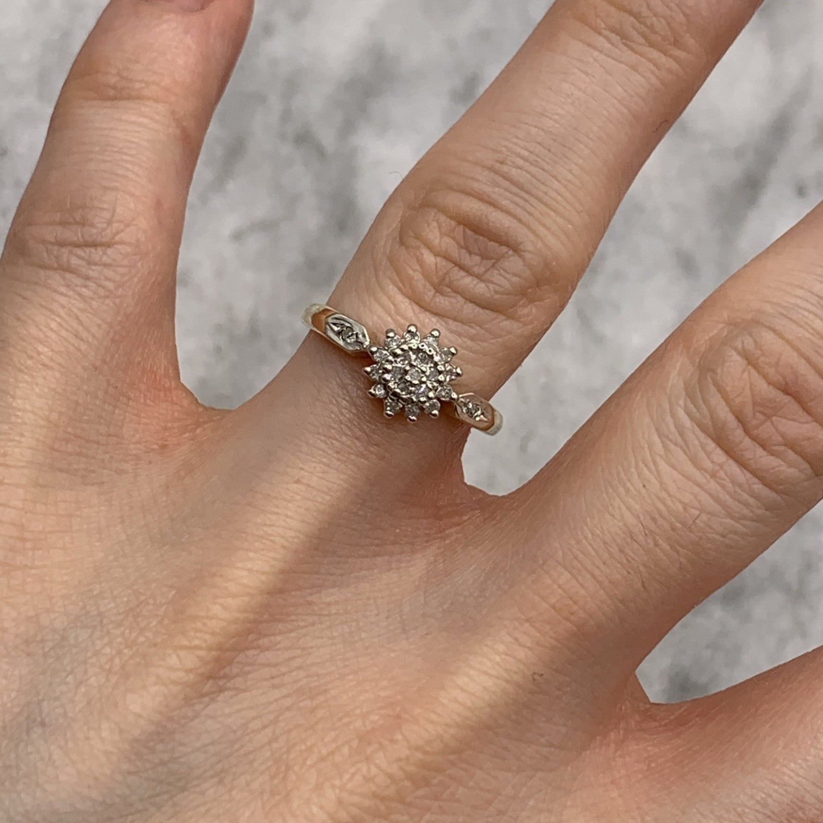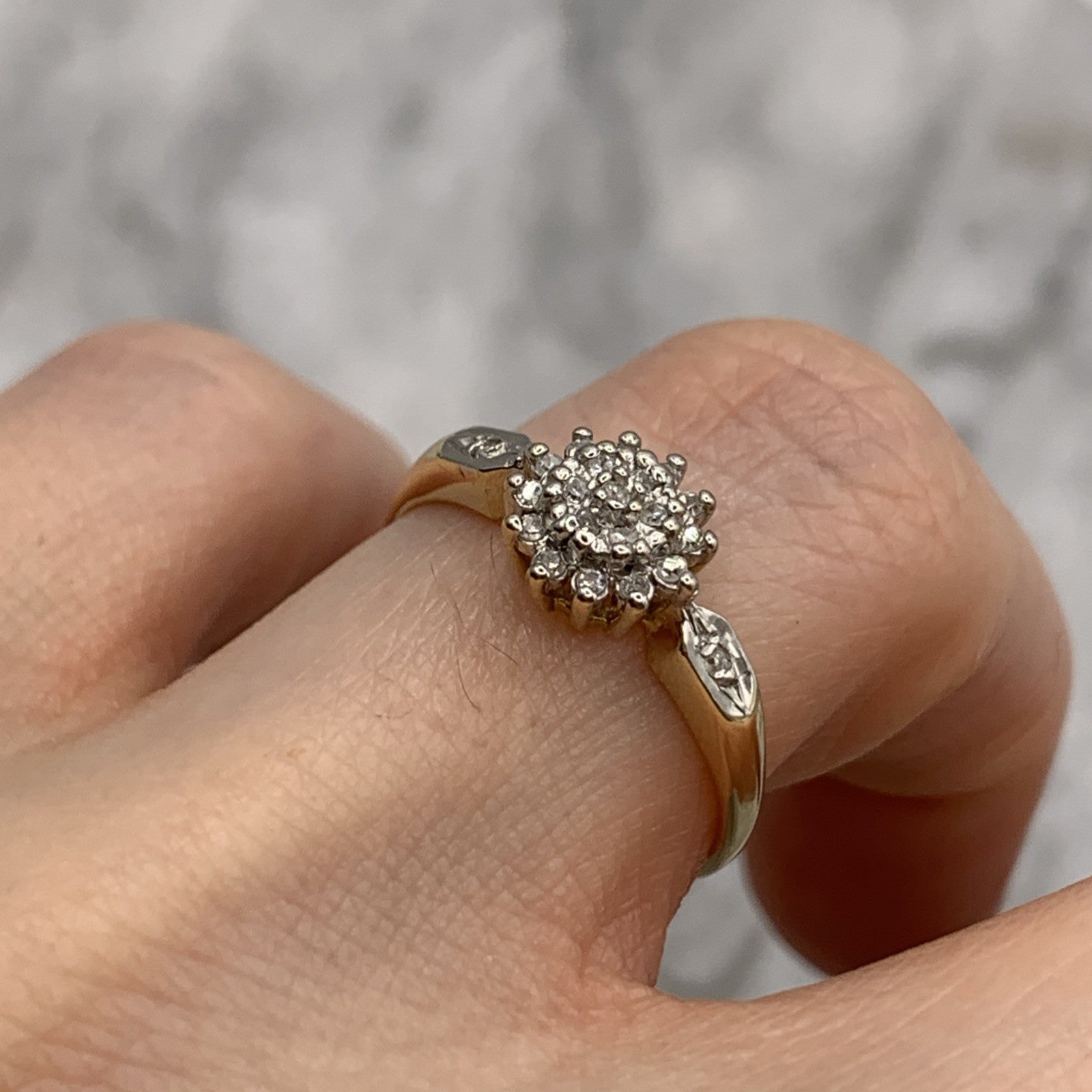 - A gorgeous gold ring featuring a cluster of petite diamonds amounting to .10ct. Hallmarked.