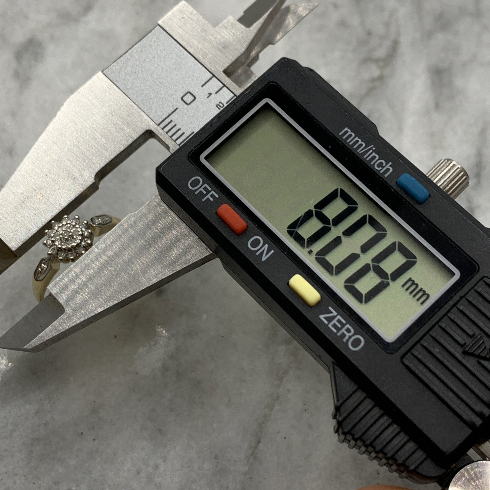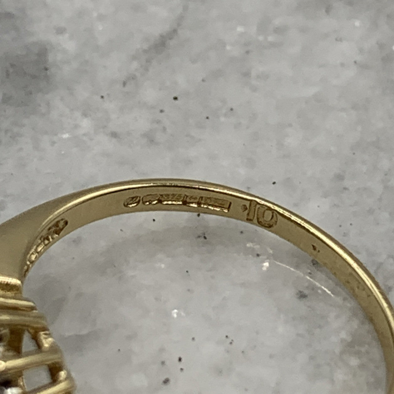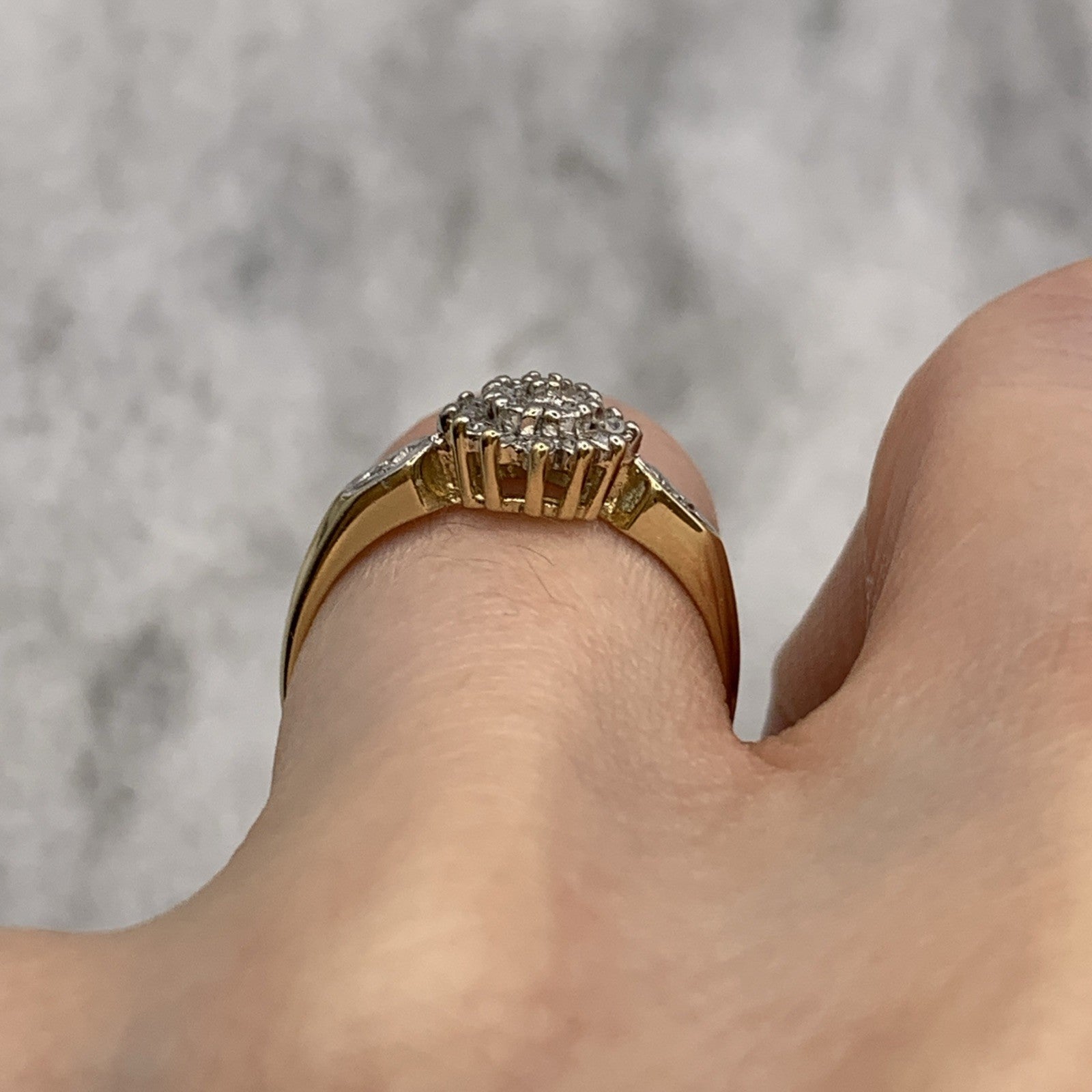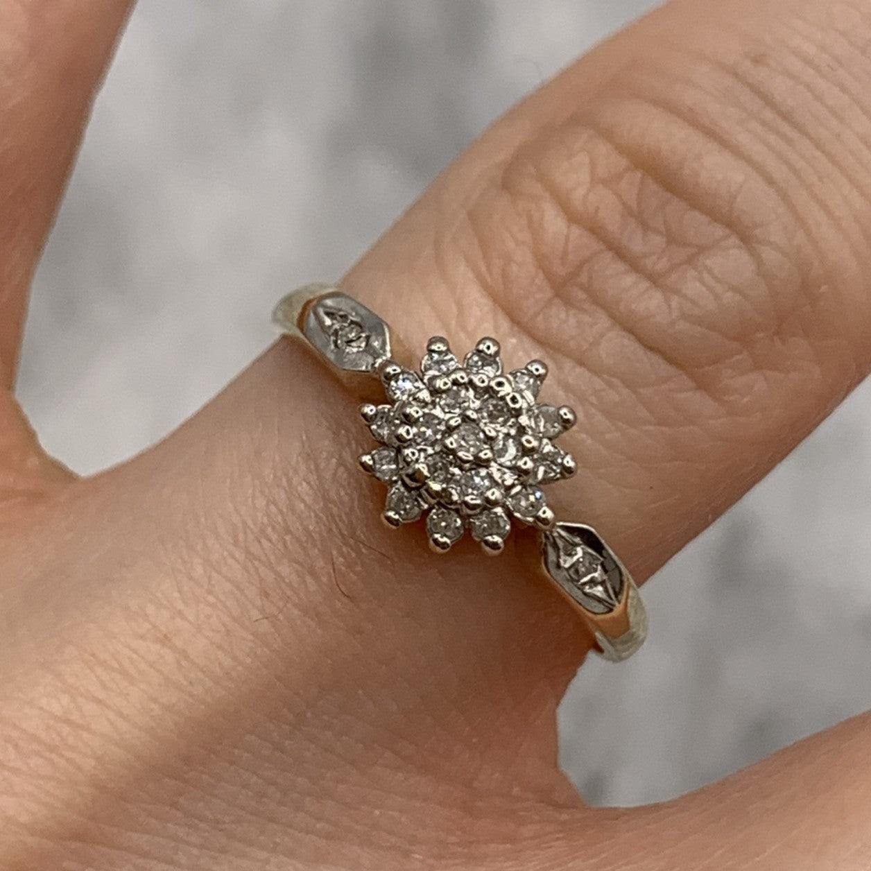 - A gorgeous gold ring featuring a cluster of petite diamonds amounting to .10ct. Hallmarked.