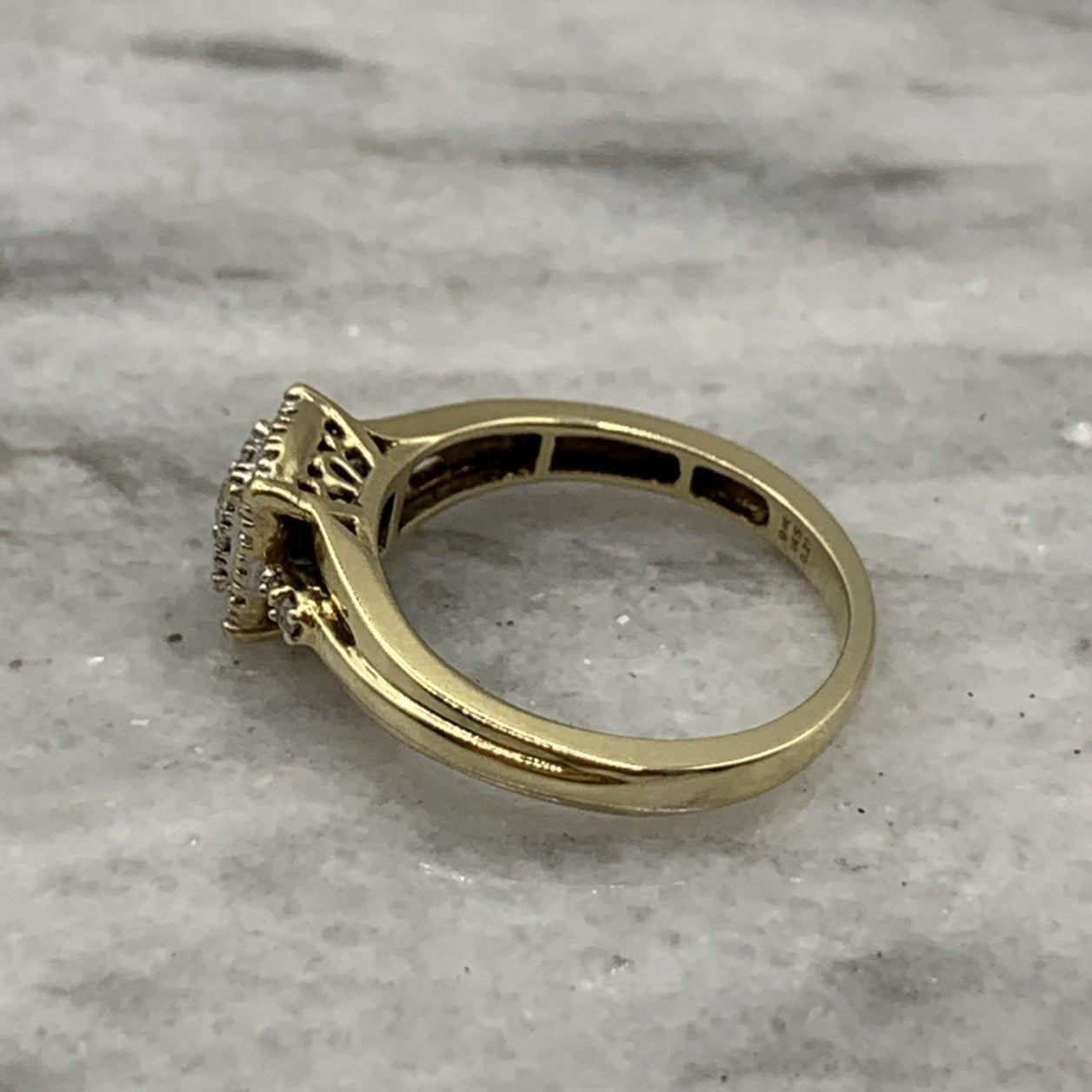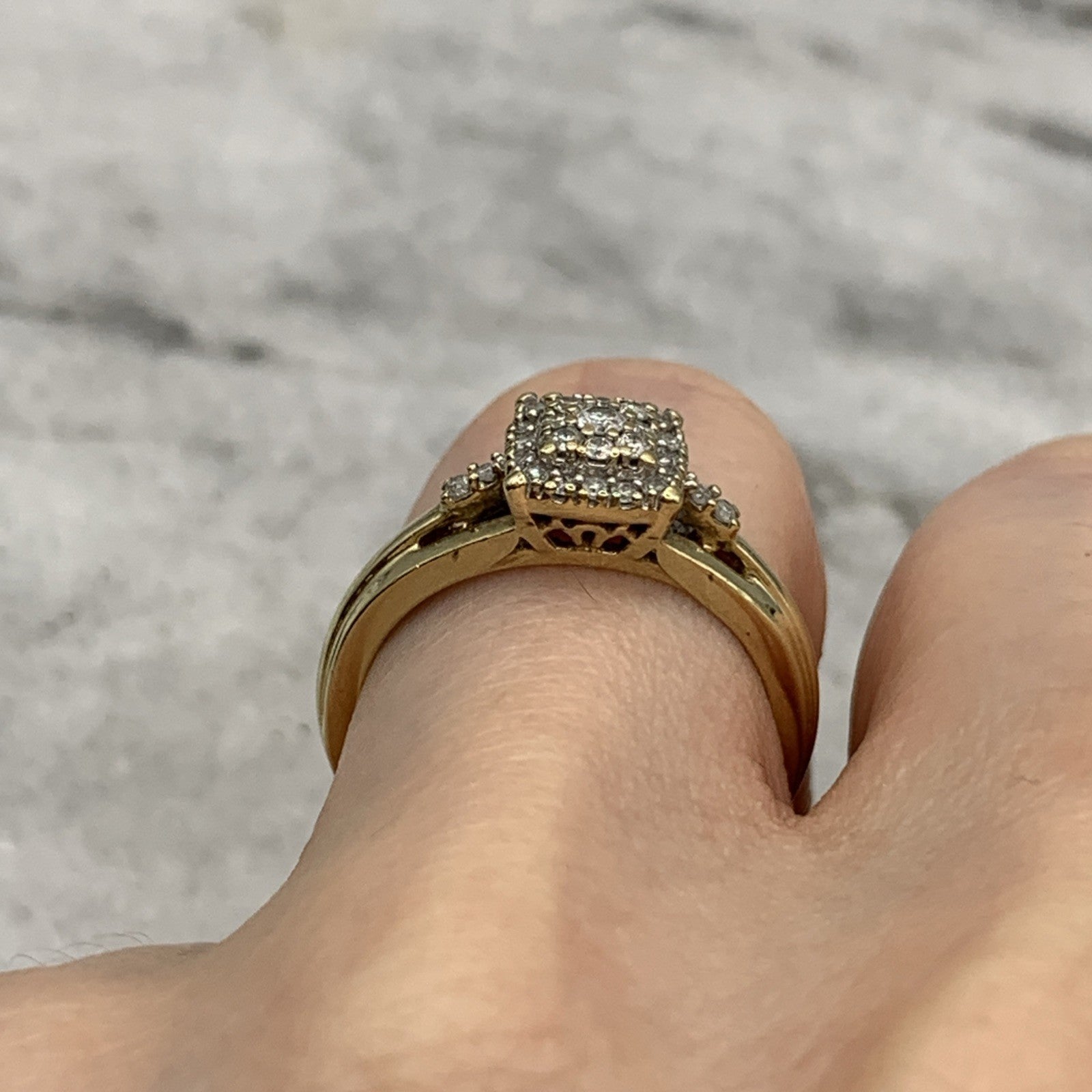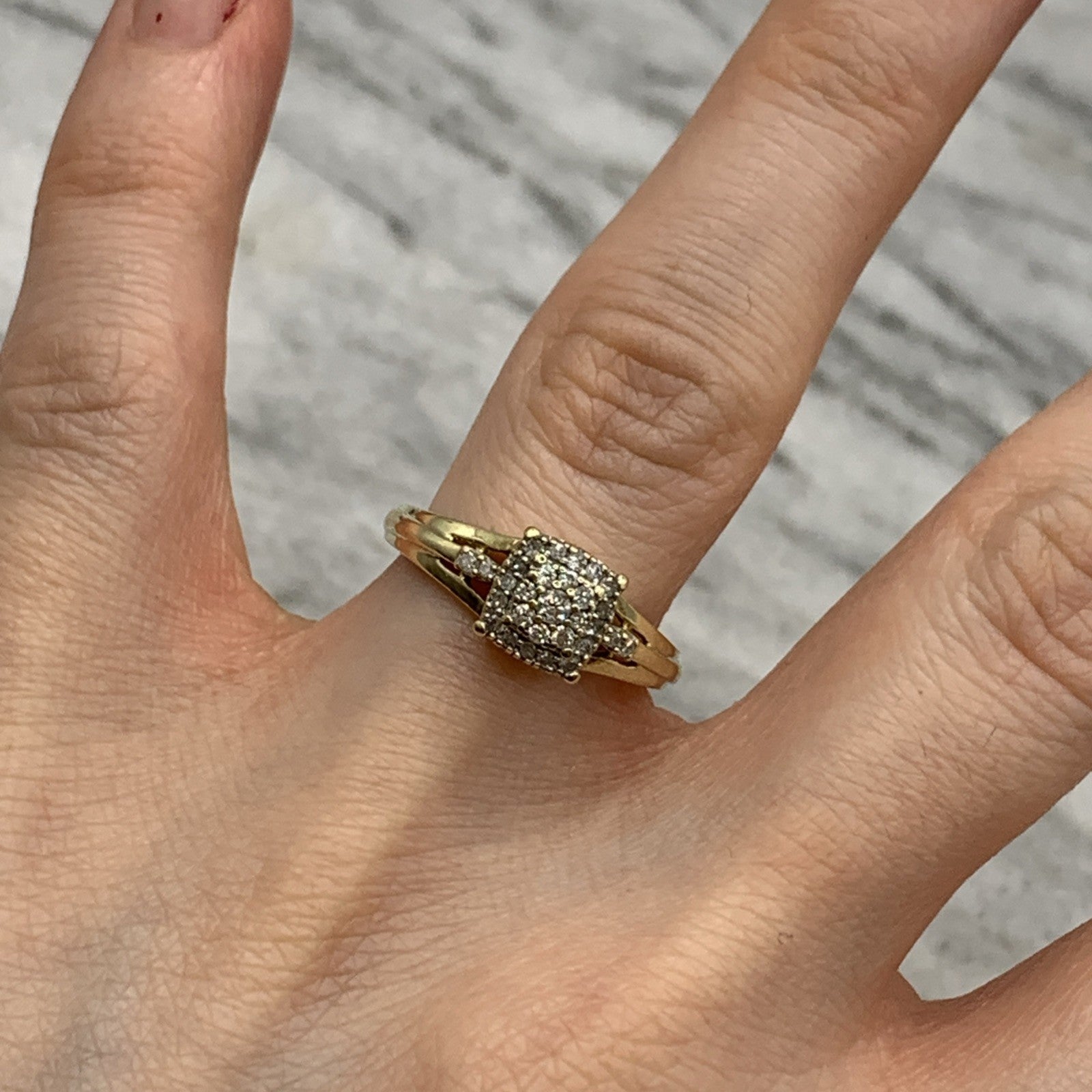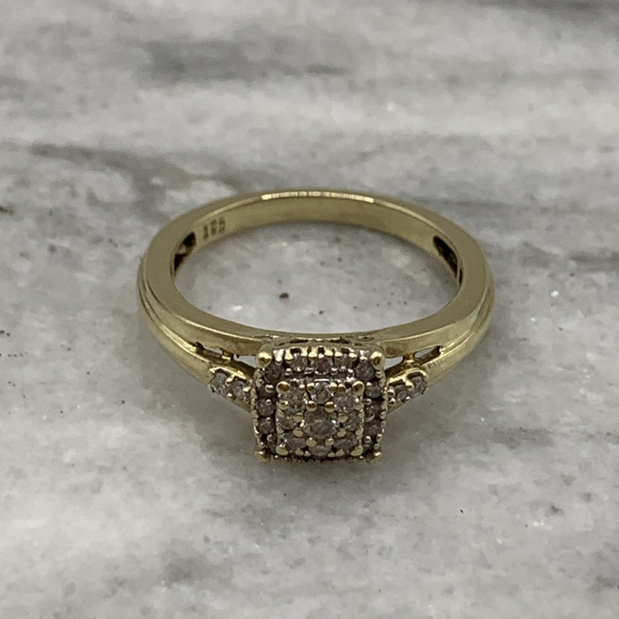 - A beautiful gold ring showcasing a square shaped cluster of petite diamonds. Stamped 9k and .21ct.