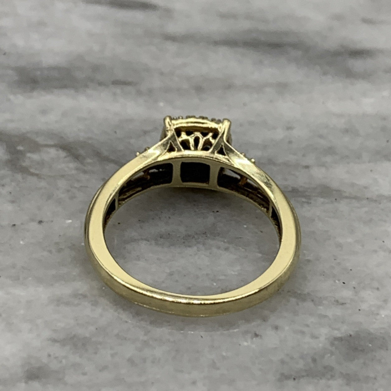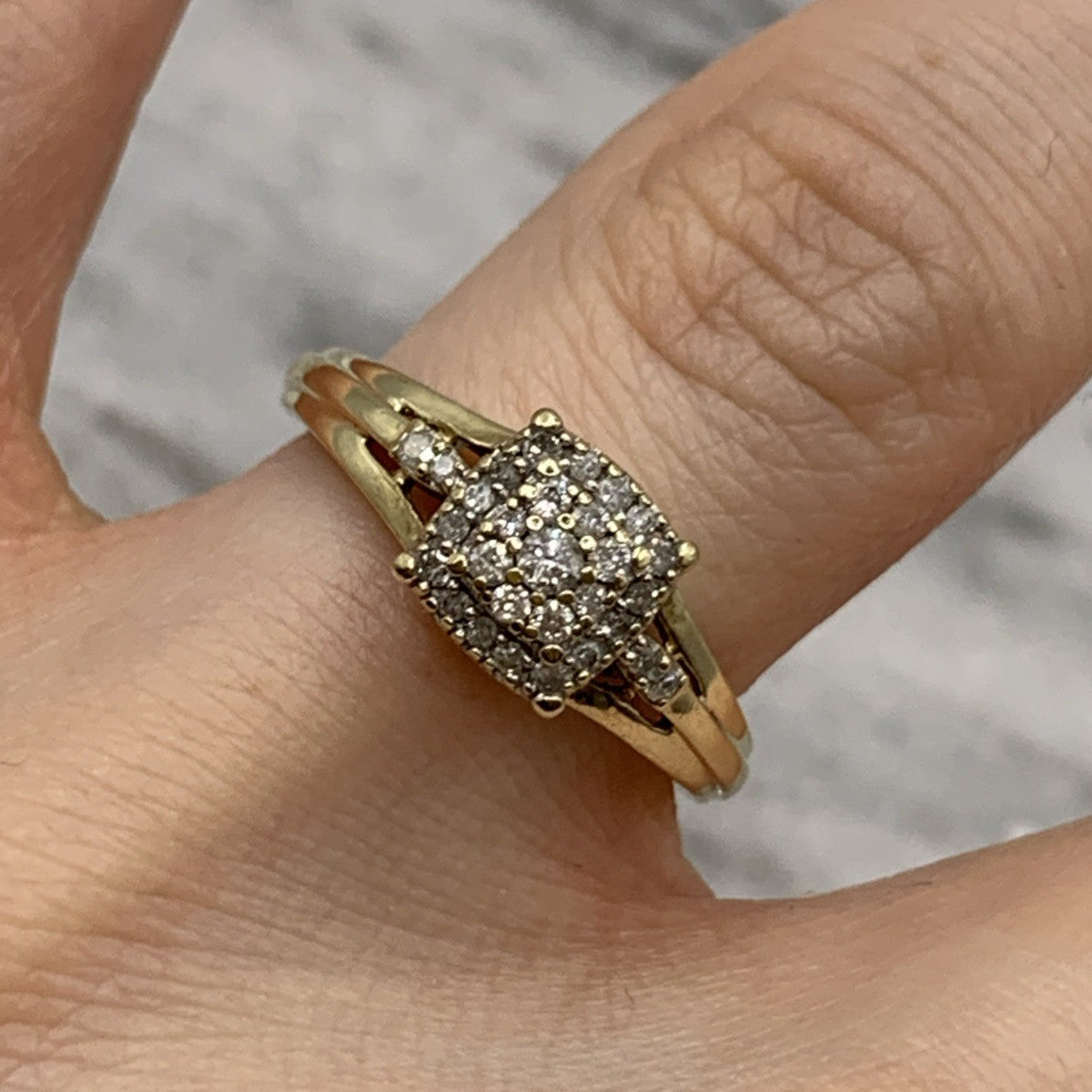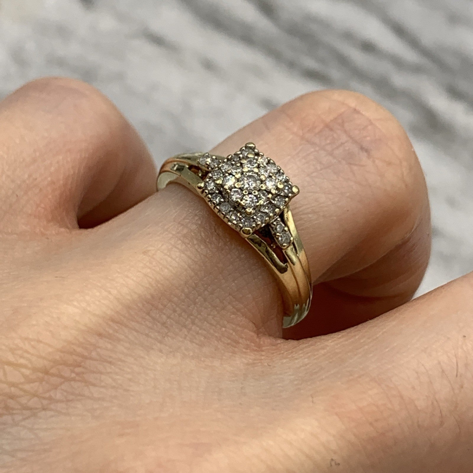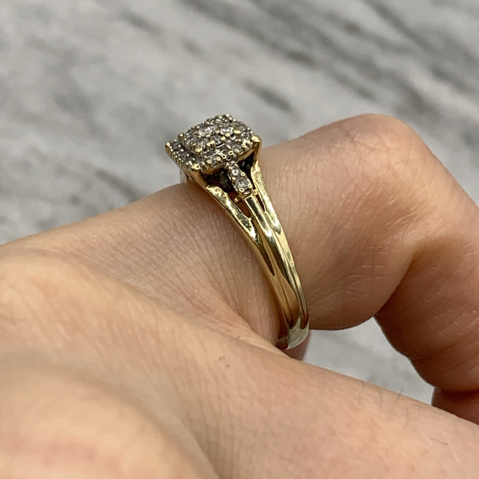 - A beautiful gold ring showcasing a square shaped cluster of petite diamonds. Stamped 9k and .21ct.