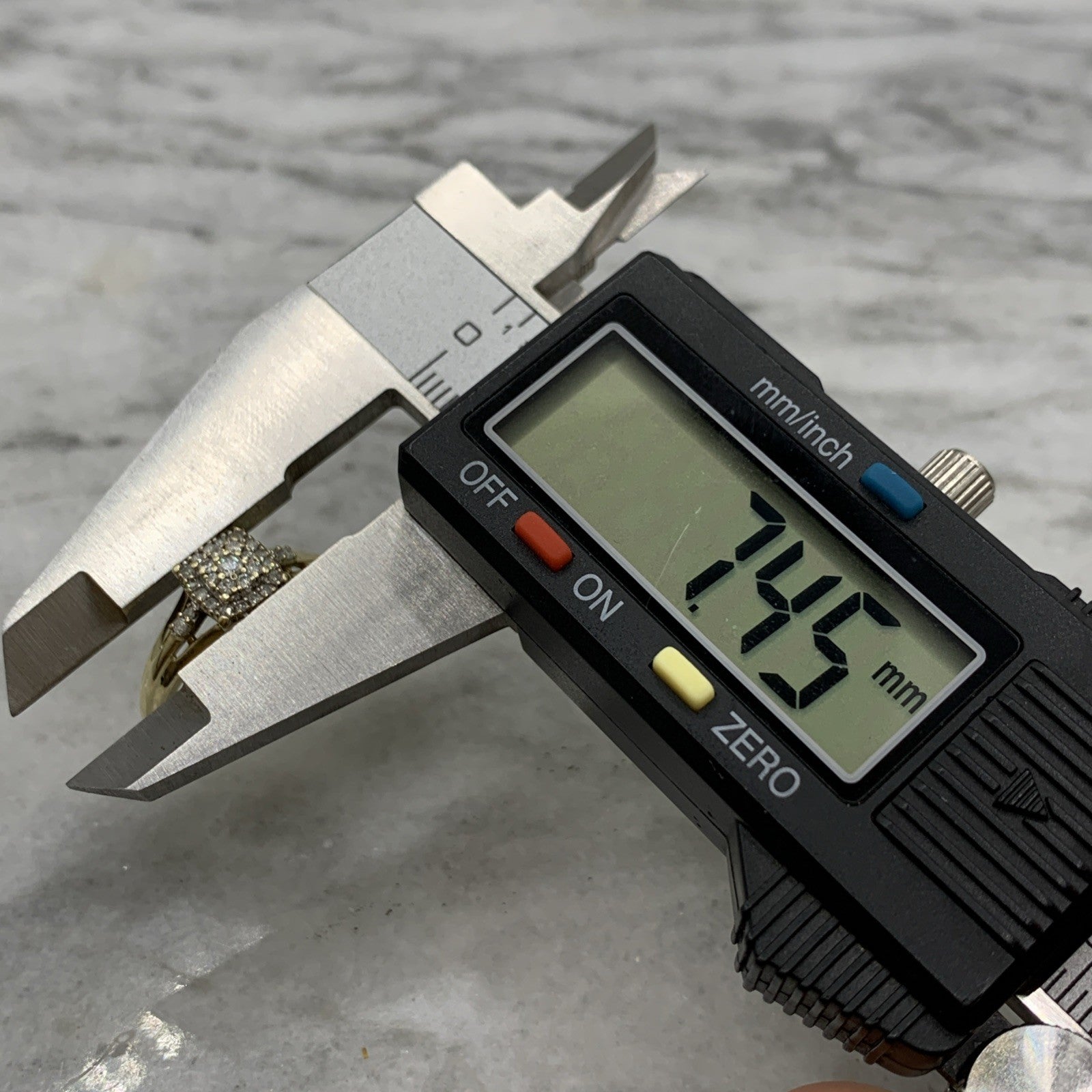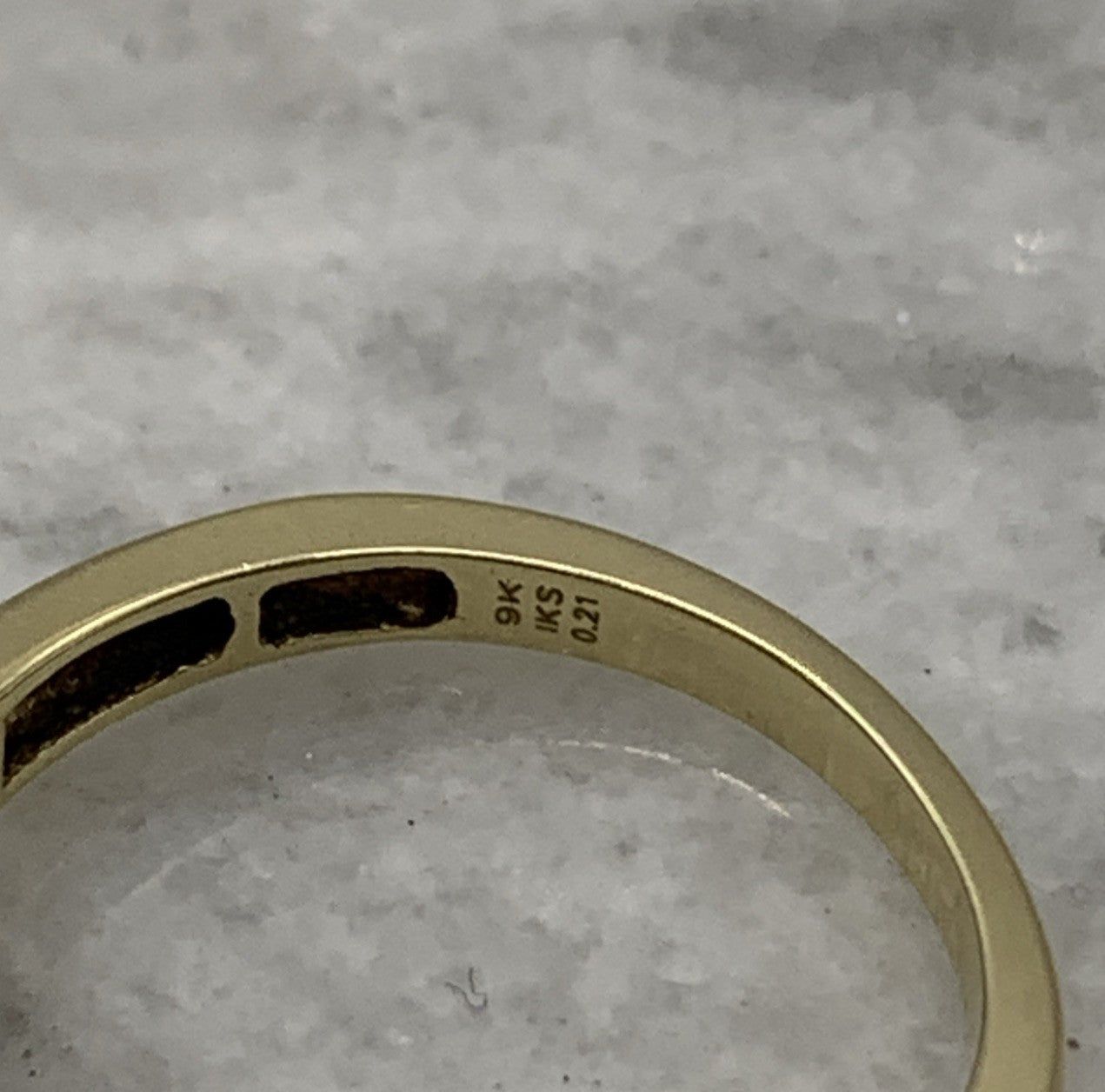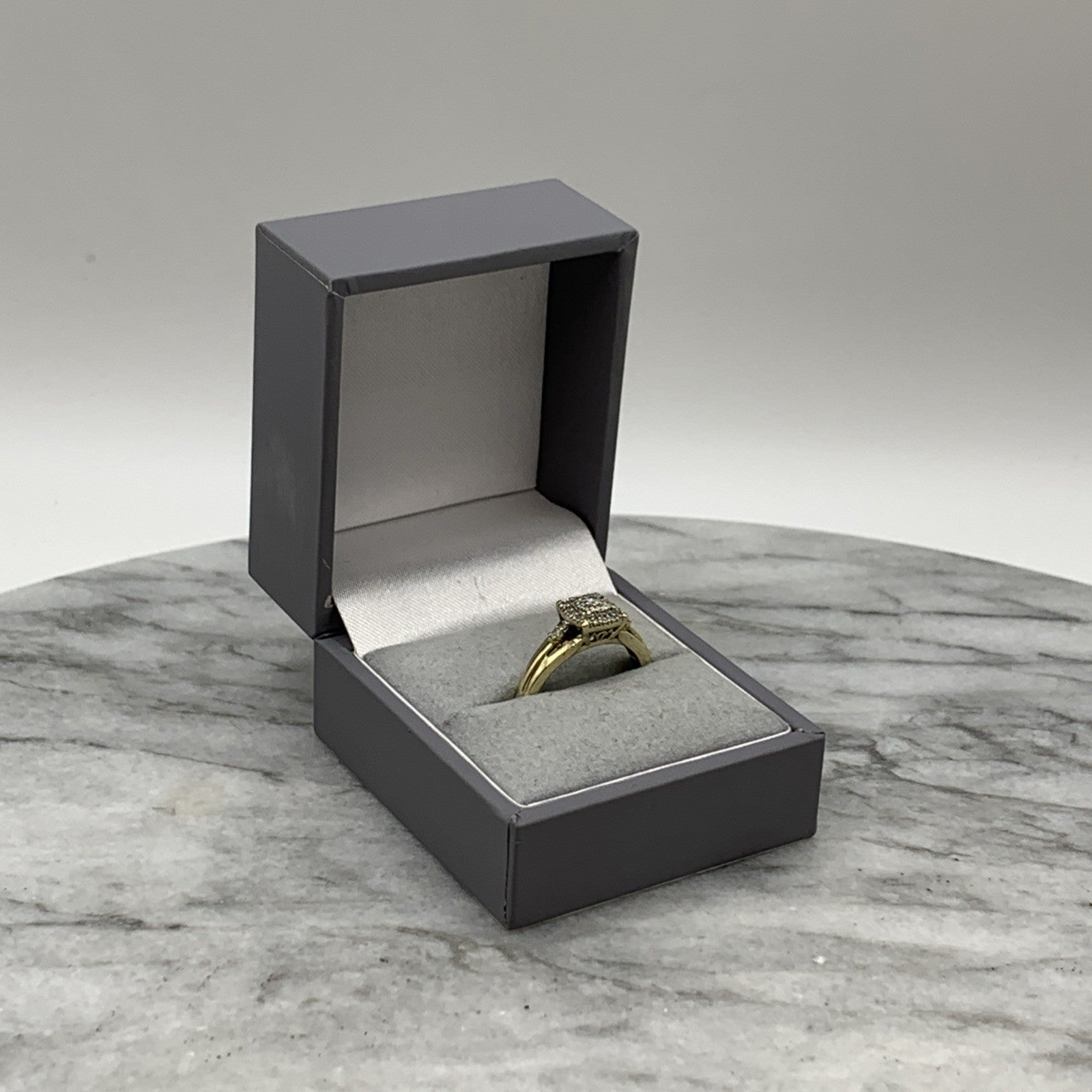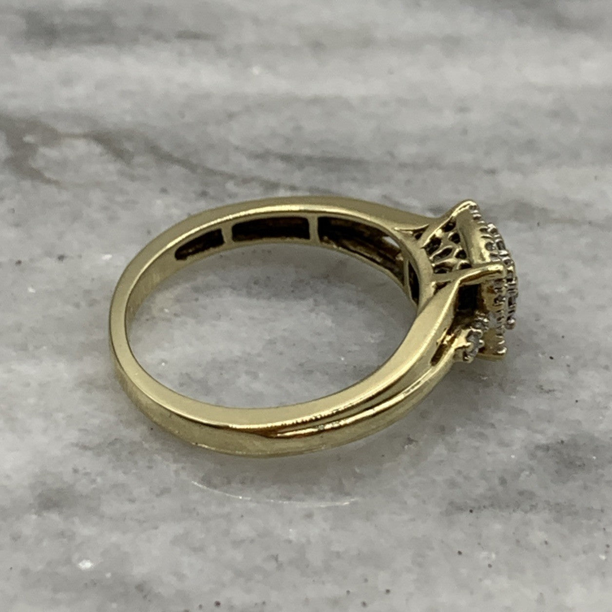 - A beautiful gold ring showcasing a square shaped cluster of petite diamonds. Stamped 9k and .21ct.