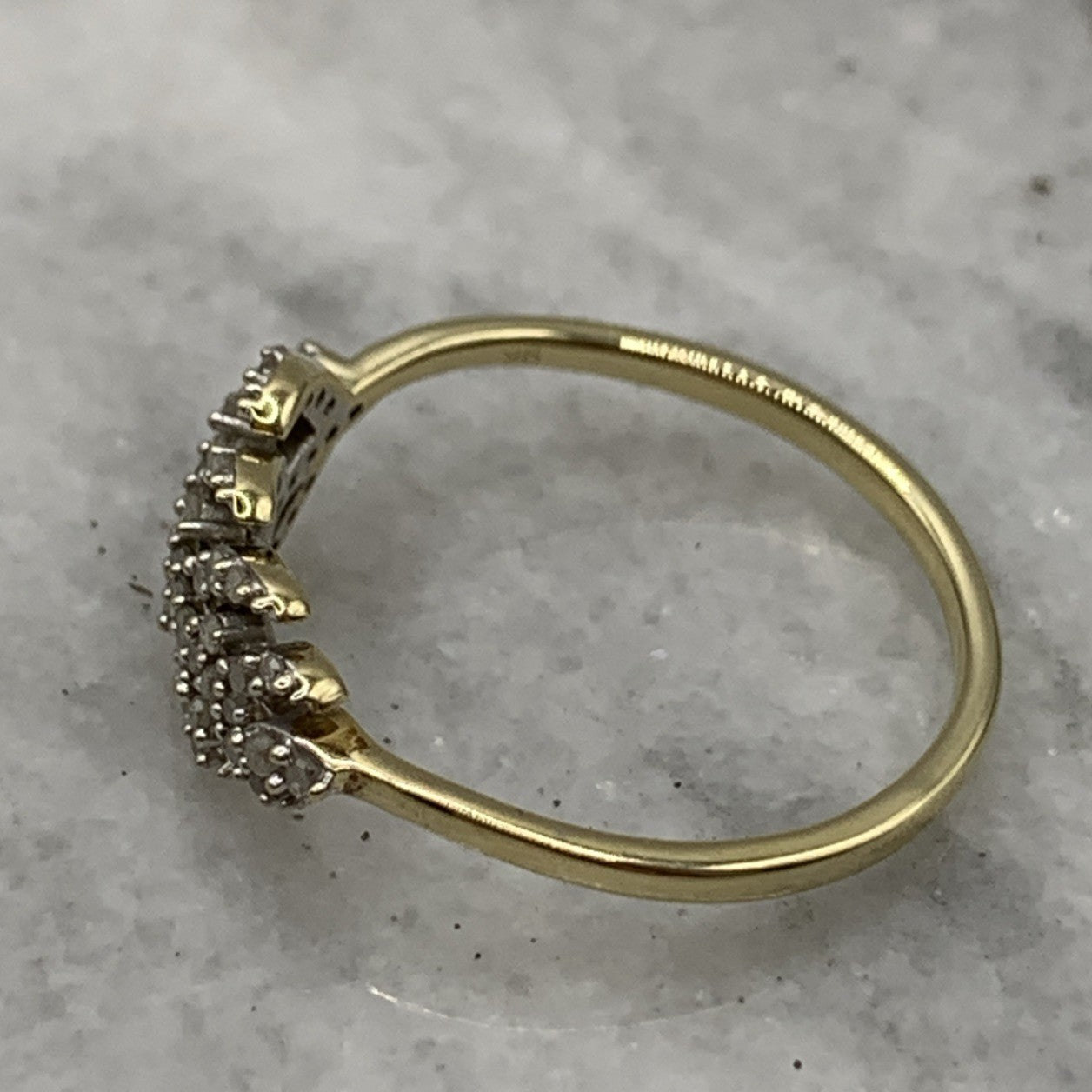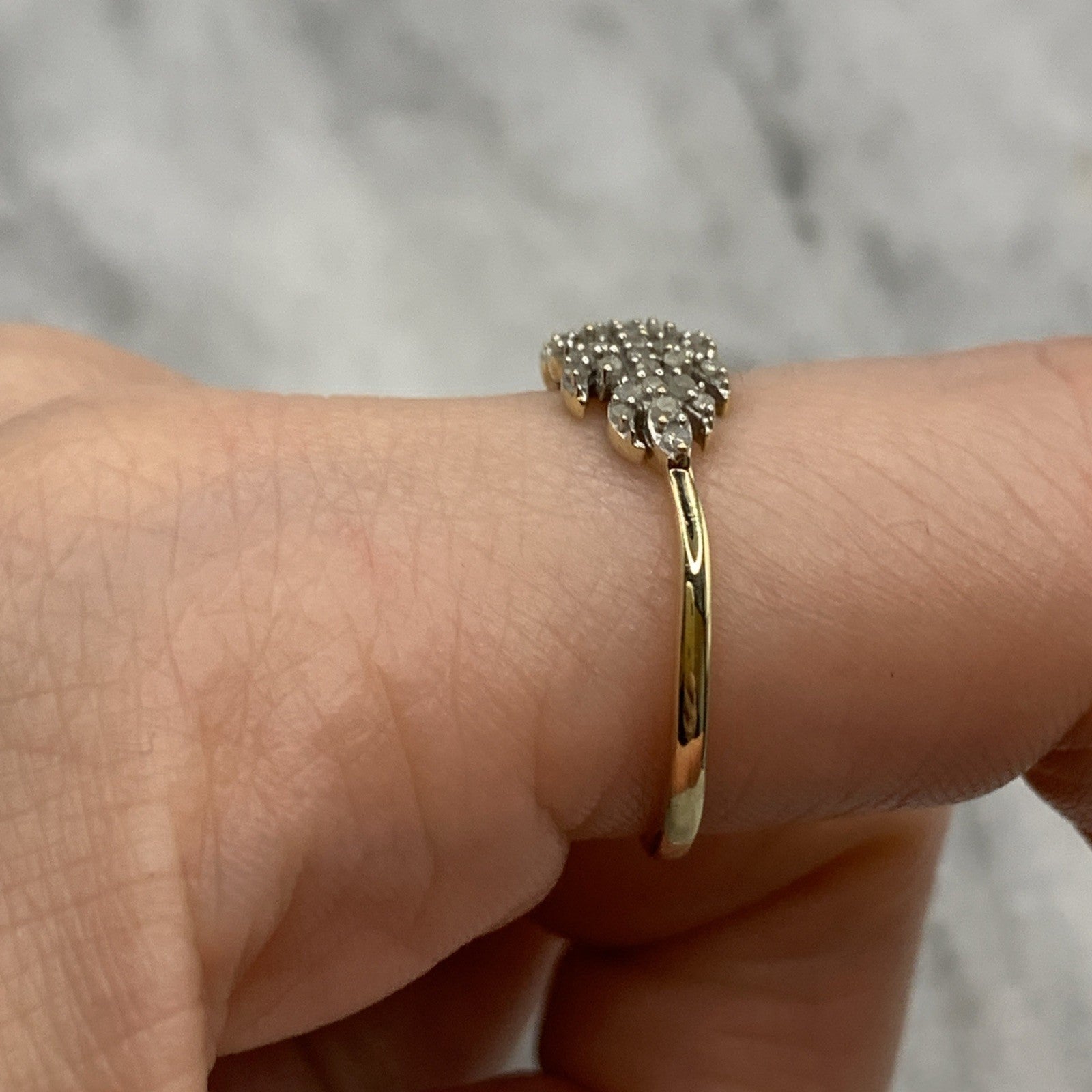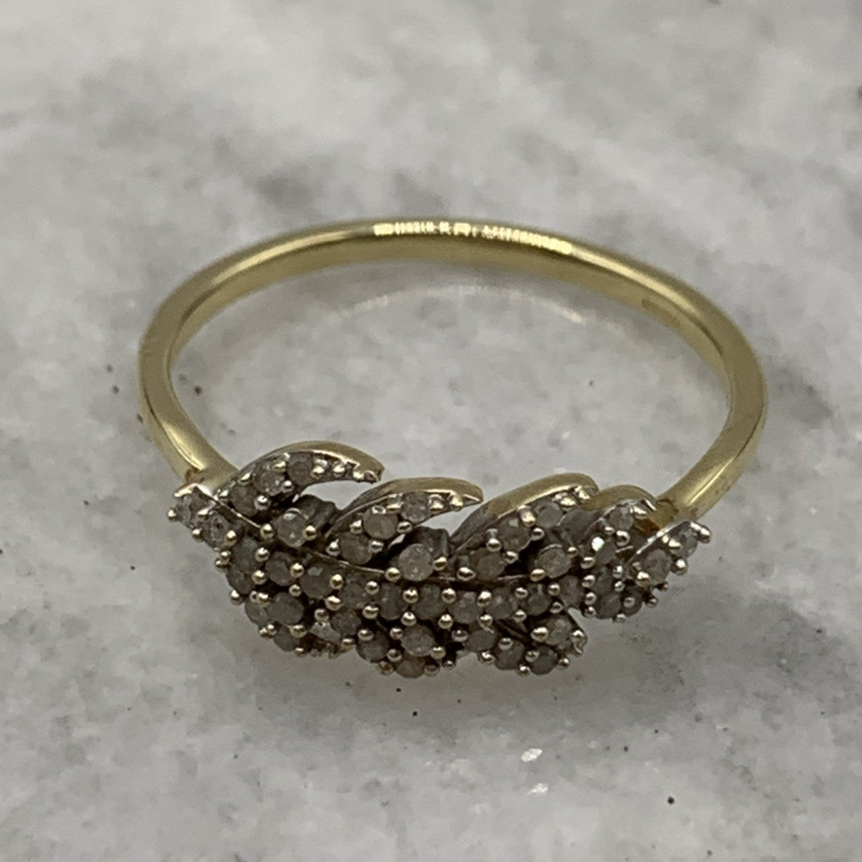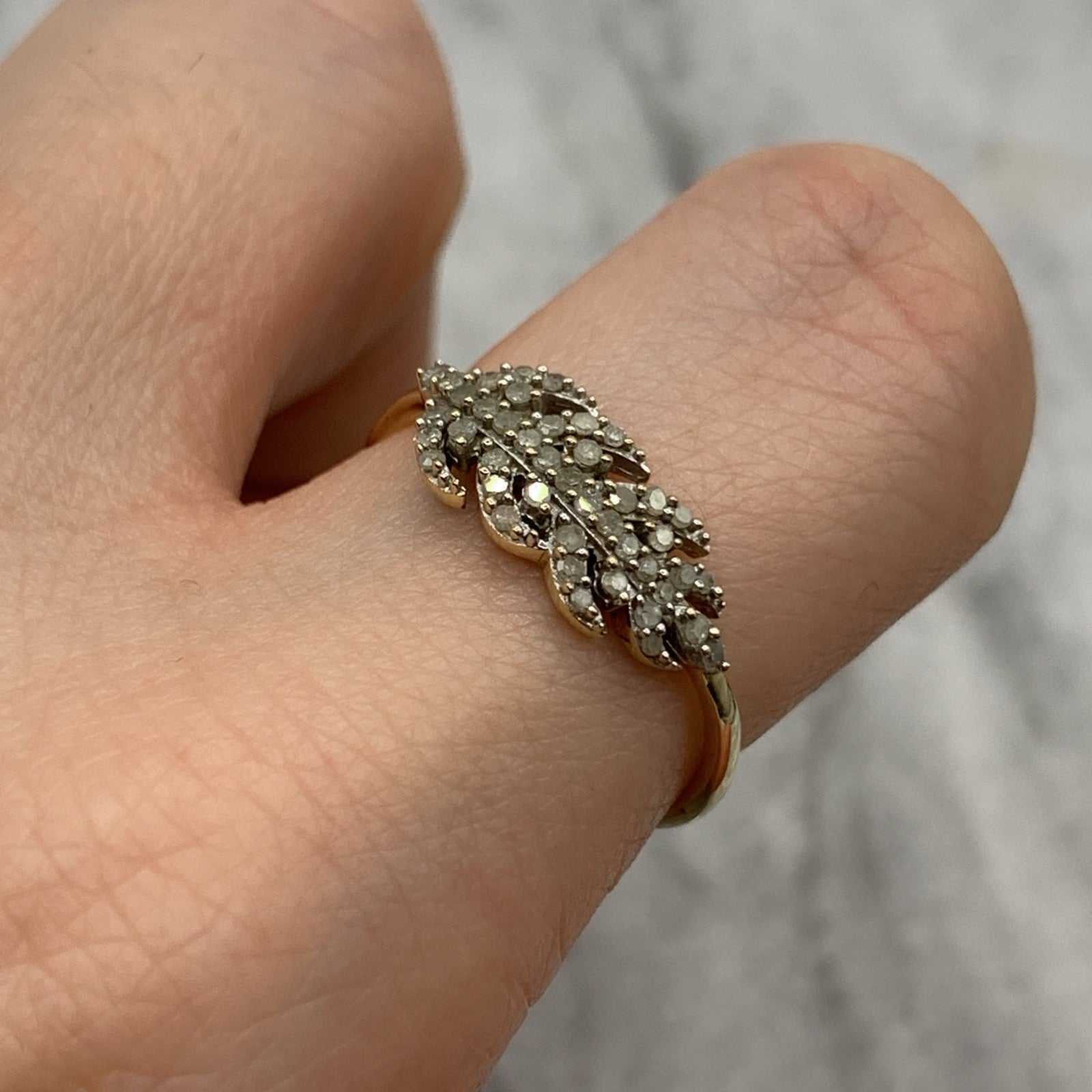 - A beautiful fine gold ring featuring a leaf shaped cluster of petite diamonds. Hallmarked.
