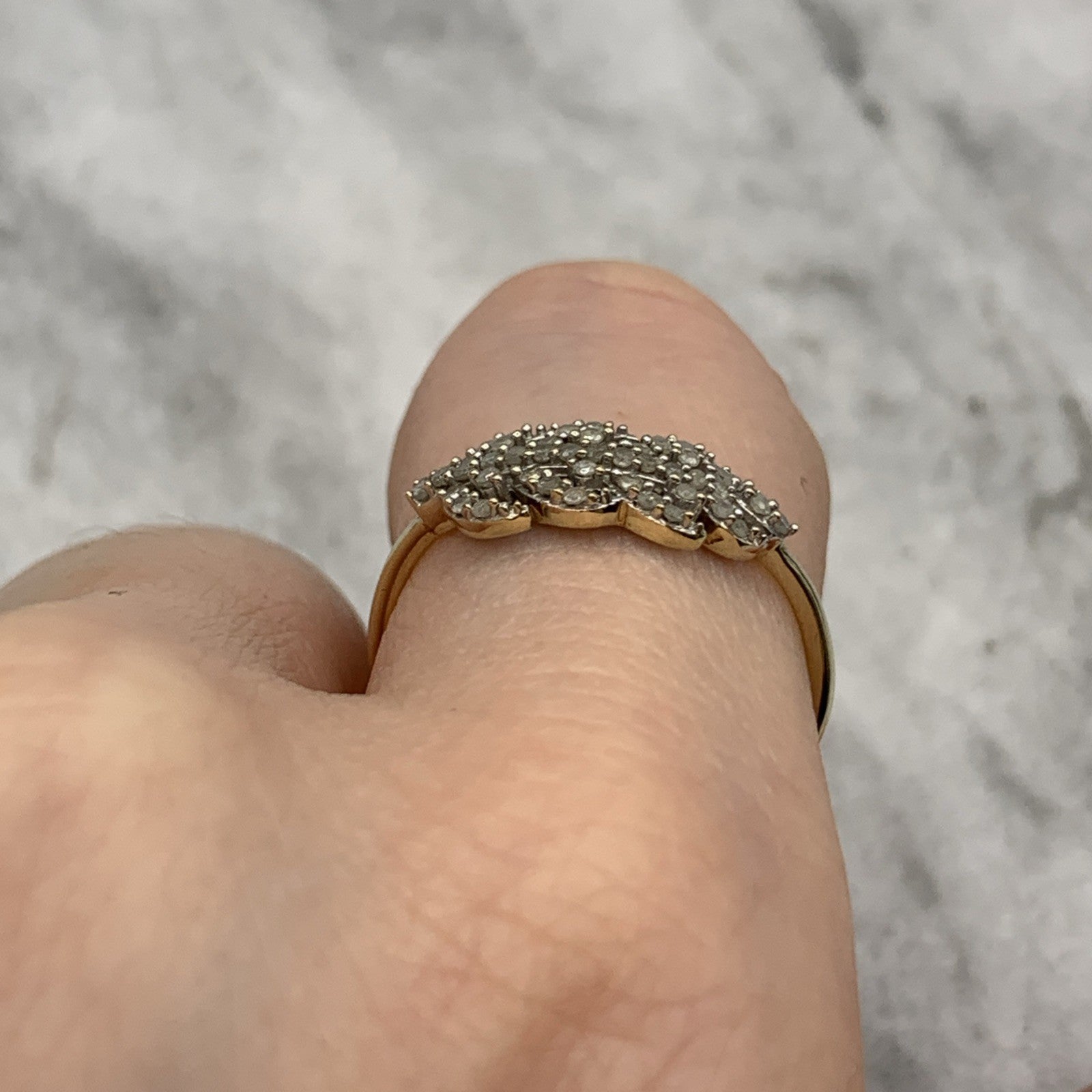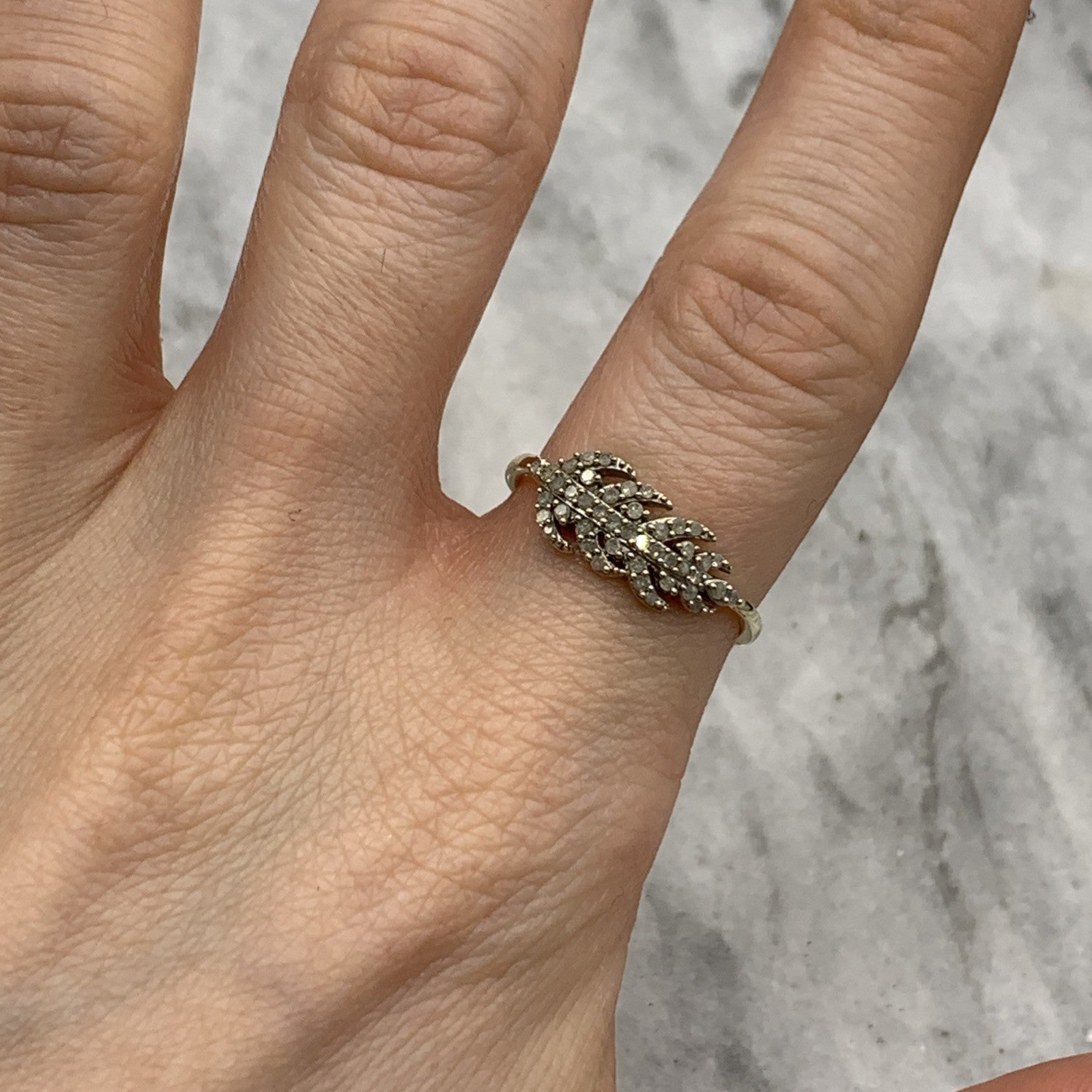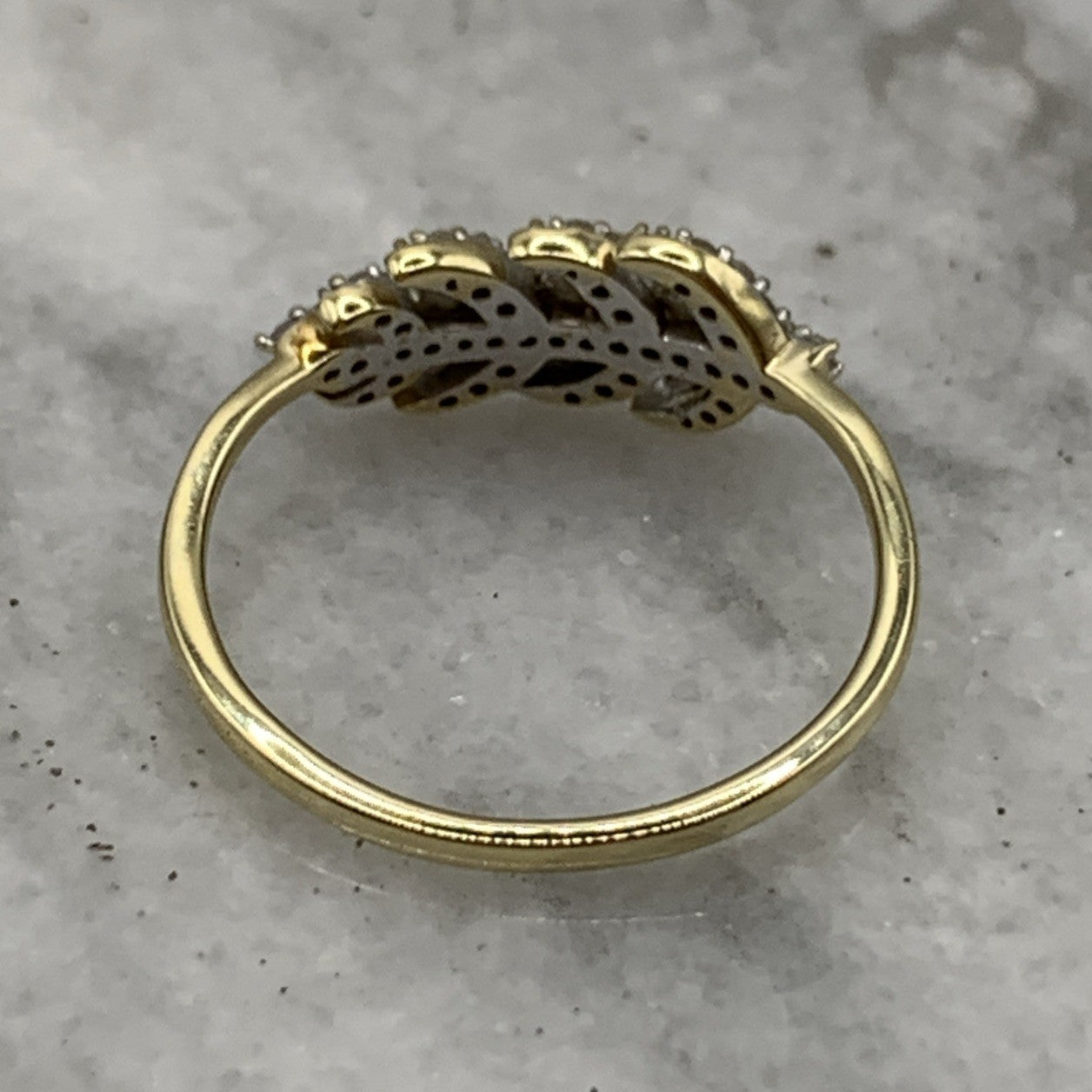 - A beautiful fine gold ring featuring a leaf shaped cluster of petite diamonds. Hallmarked.