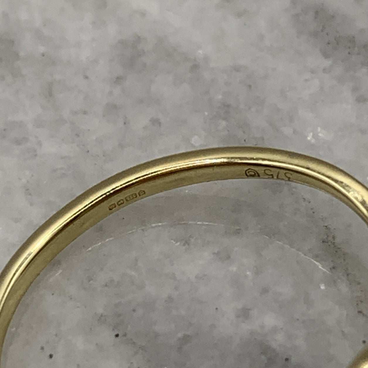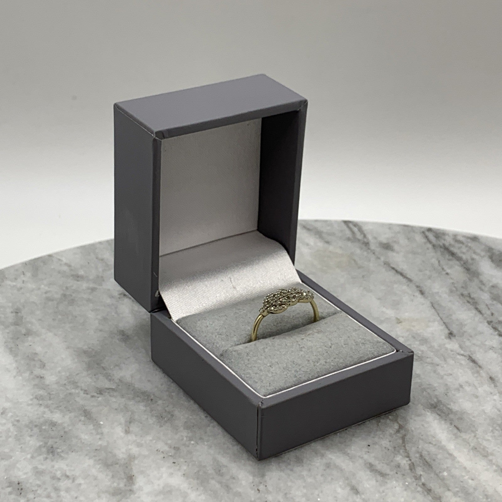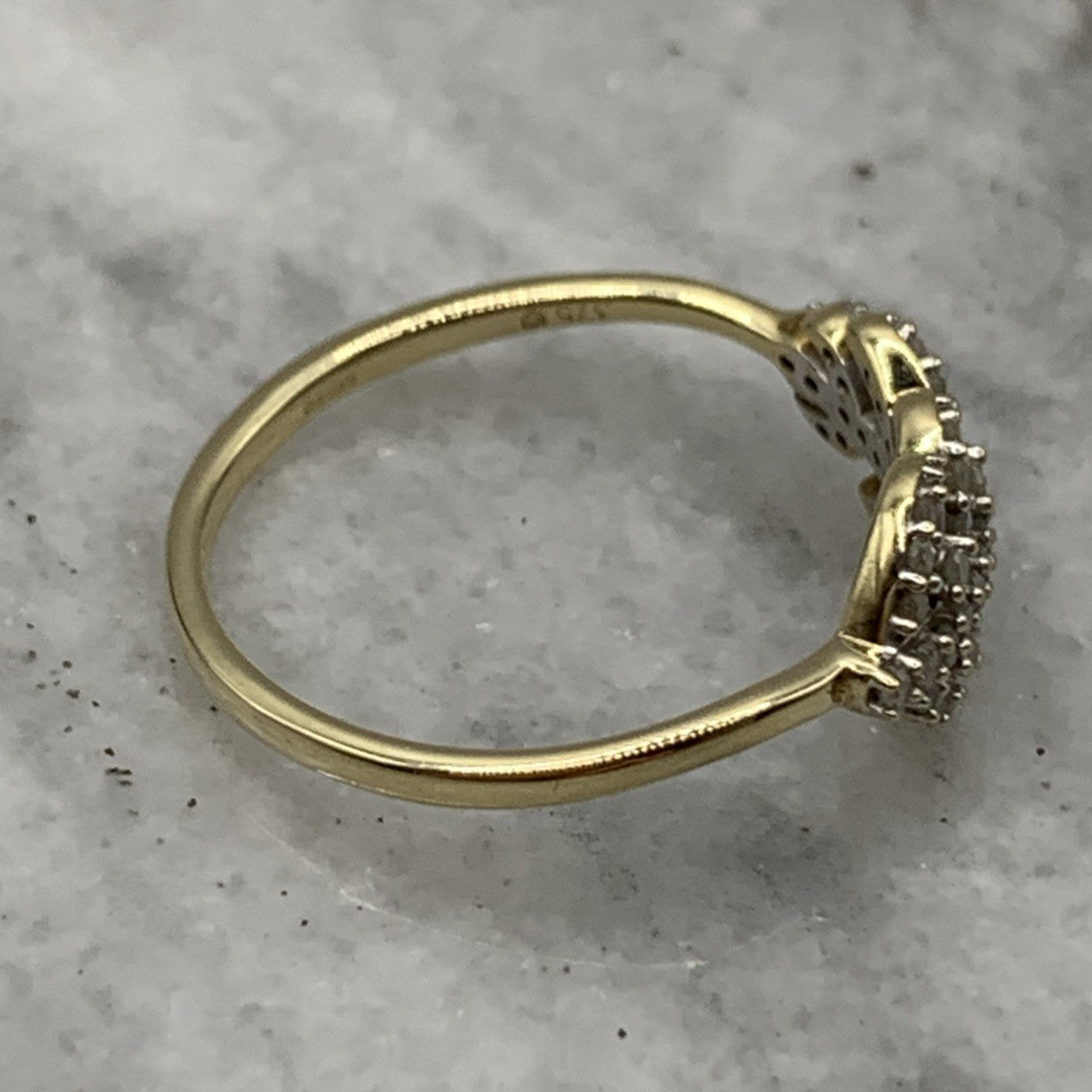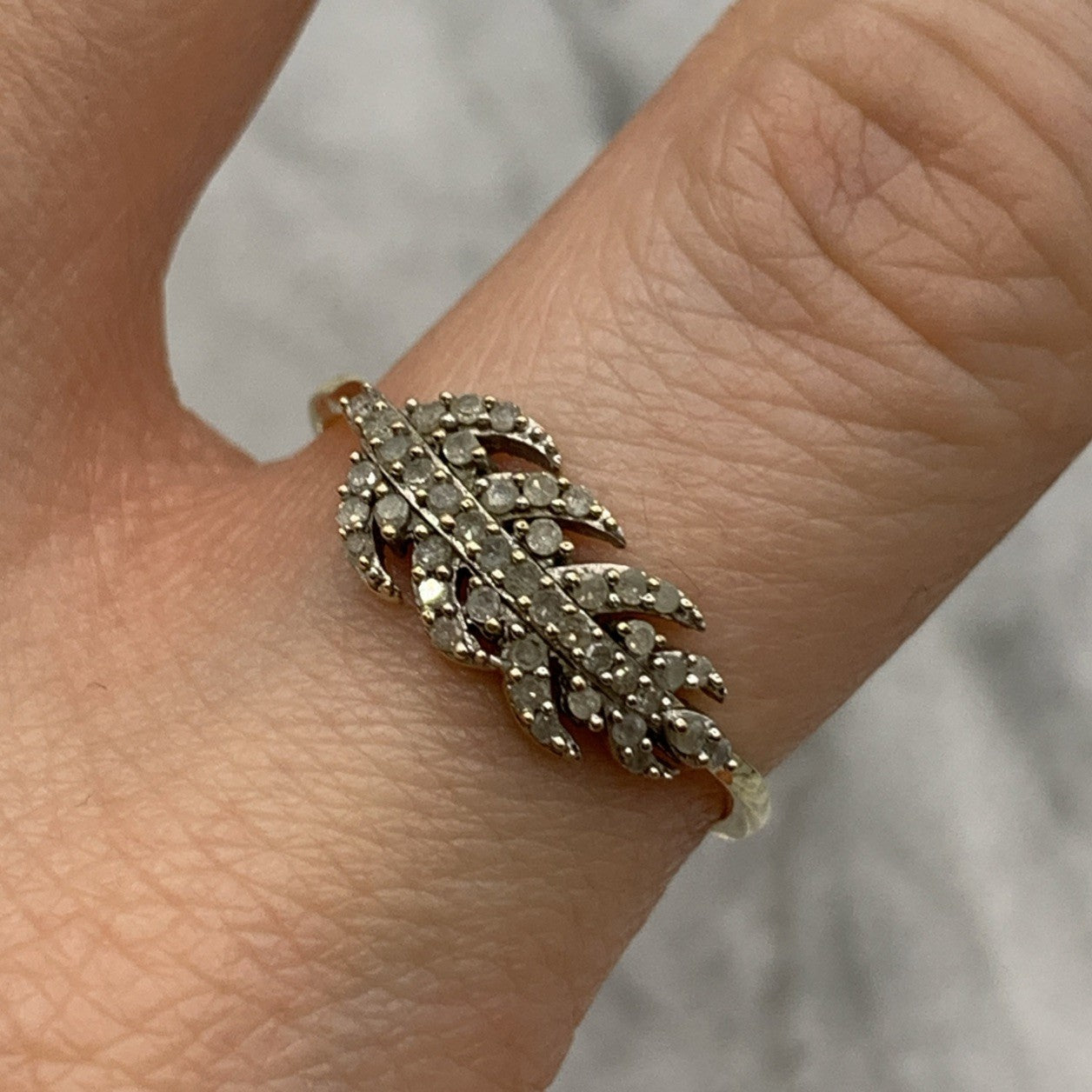 - A beautiful fine gold ring featuring a leaf shaped cluster of petite diamonds. Hallmarked.