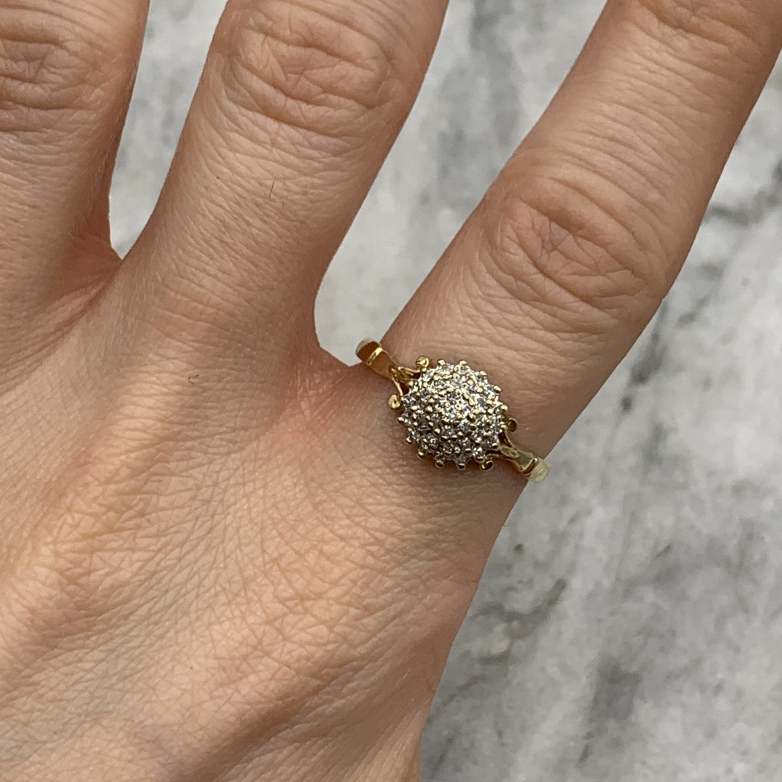 - A lovely gold ring showcasing a round cluster of petite diamonds. Hallmarked.