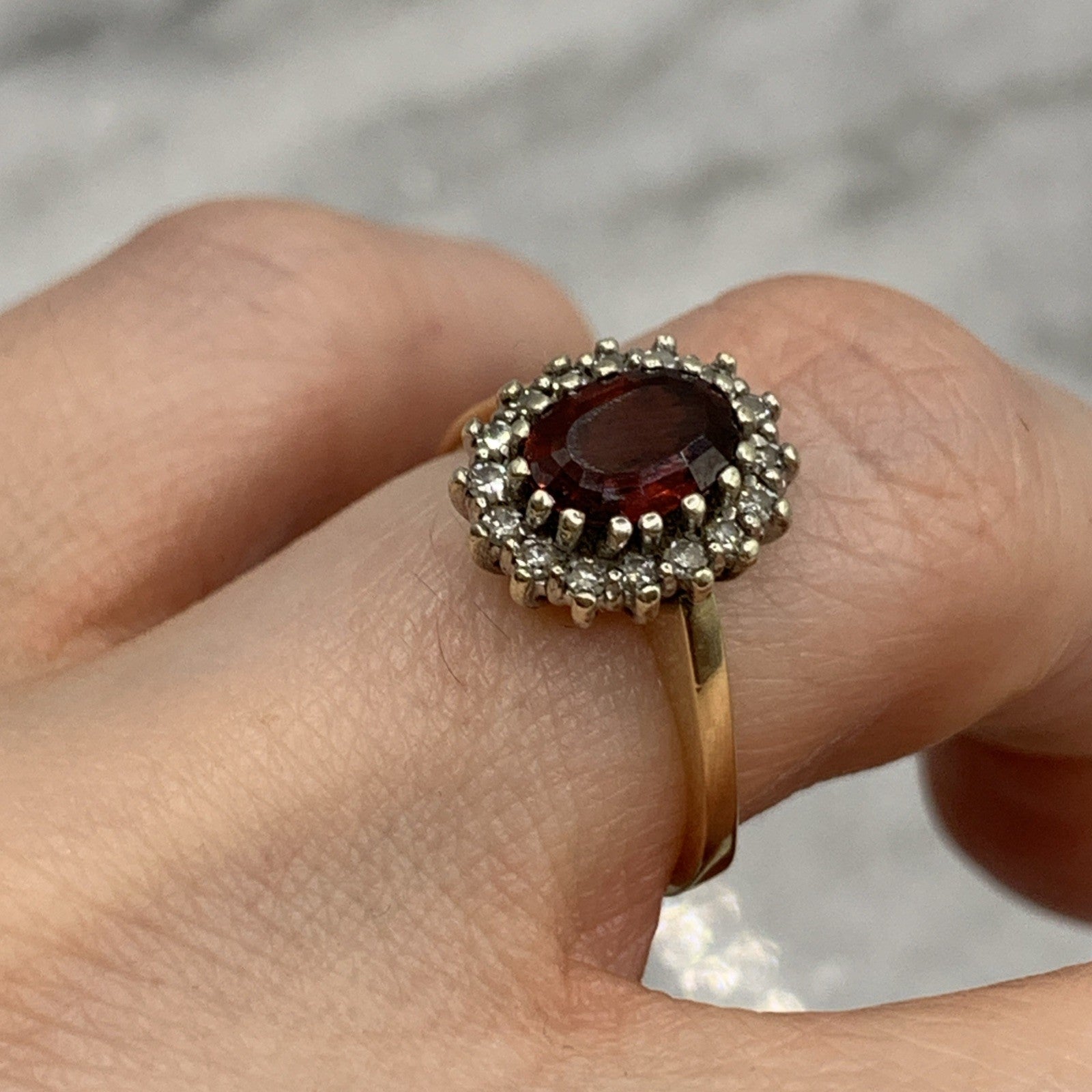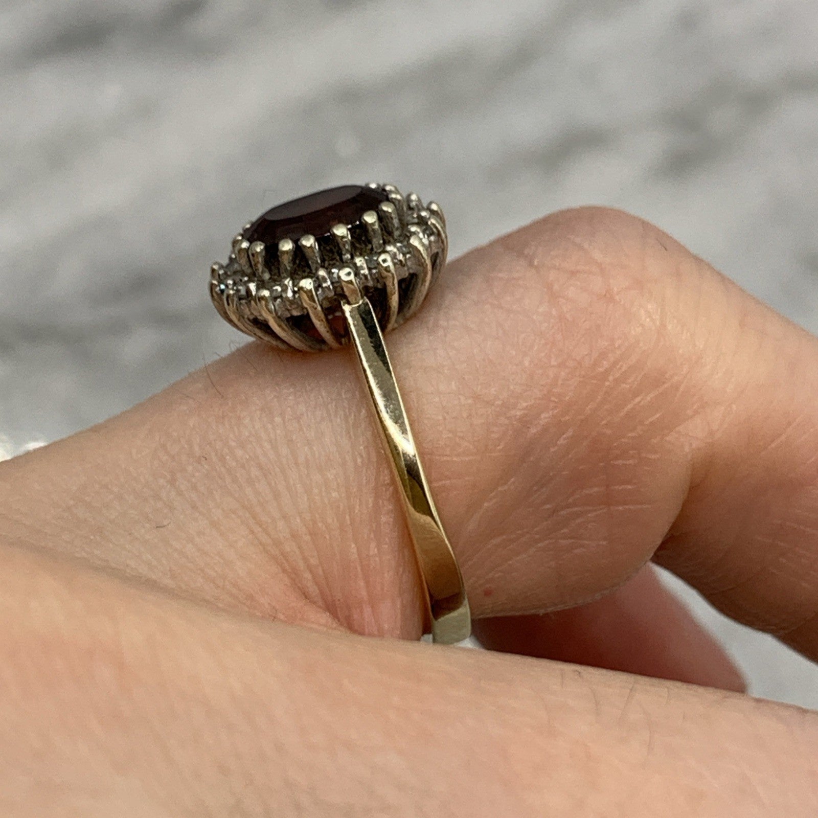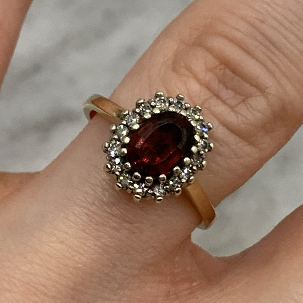 - A stunning gold ring showcasing an oval cut garnet accented by a halo of petite diamonds. Hallmarked.