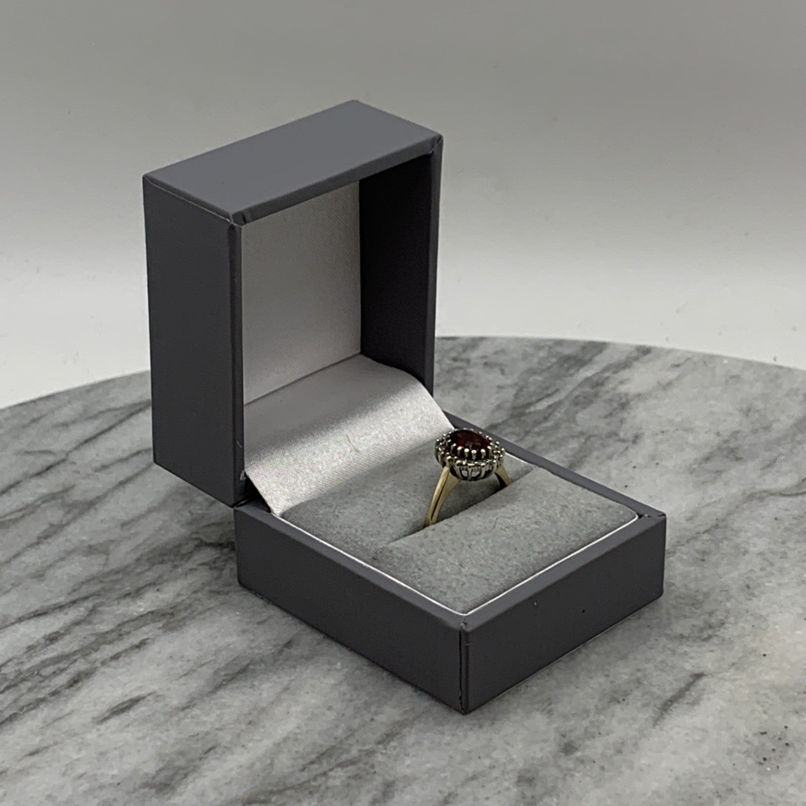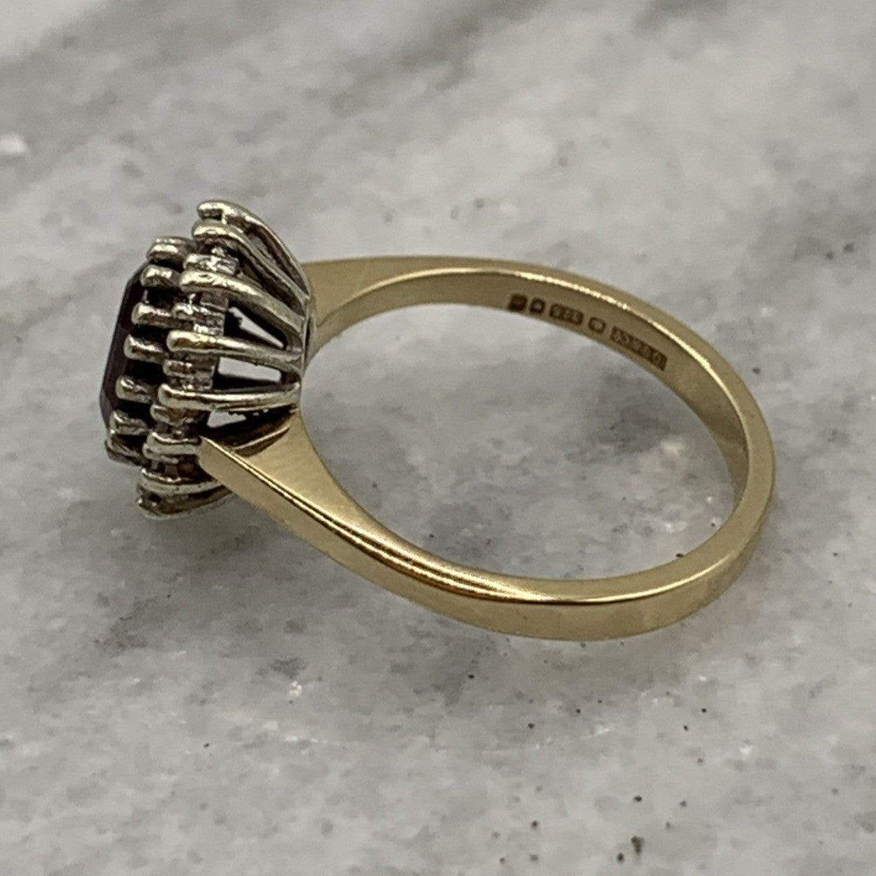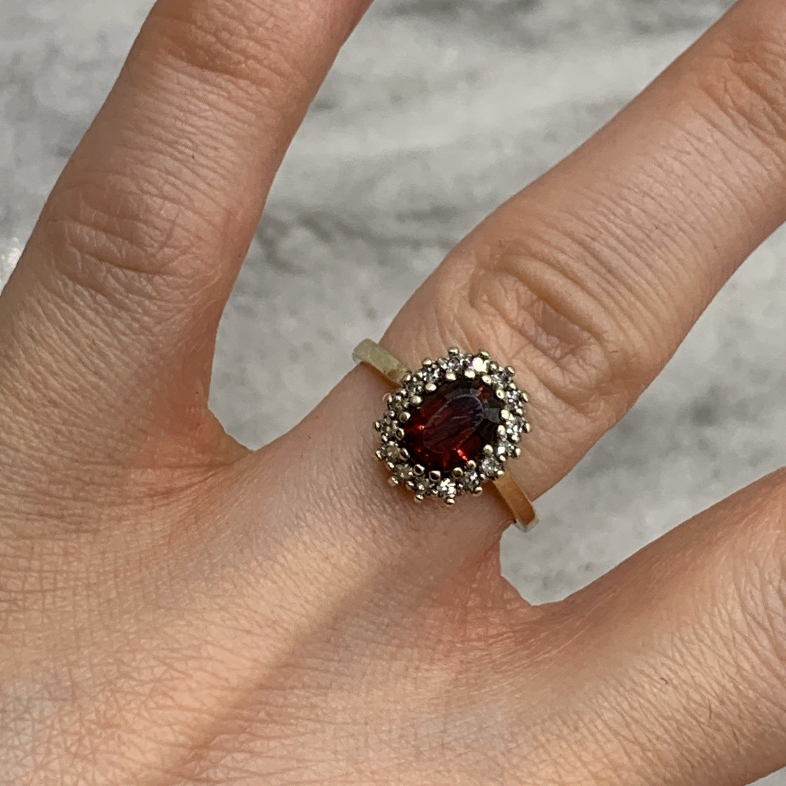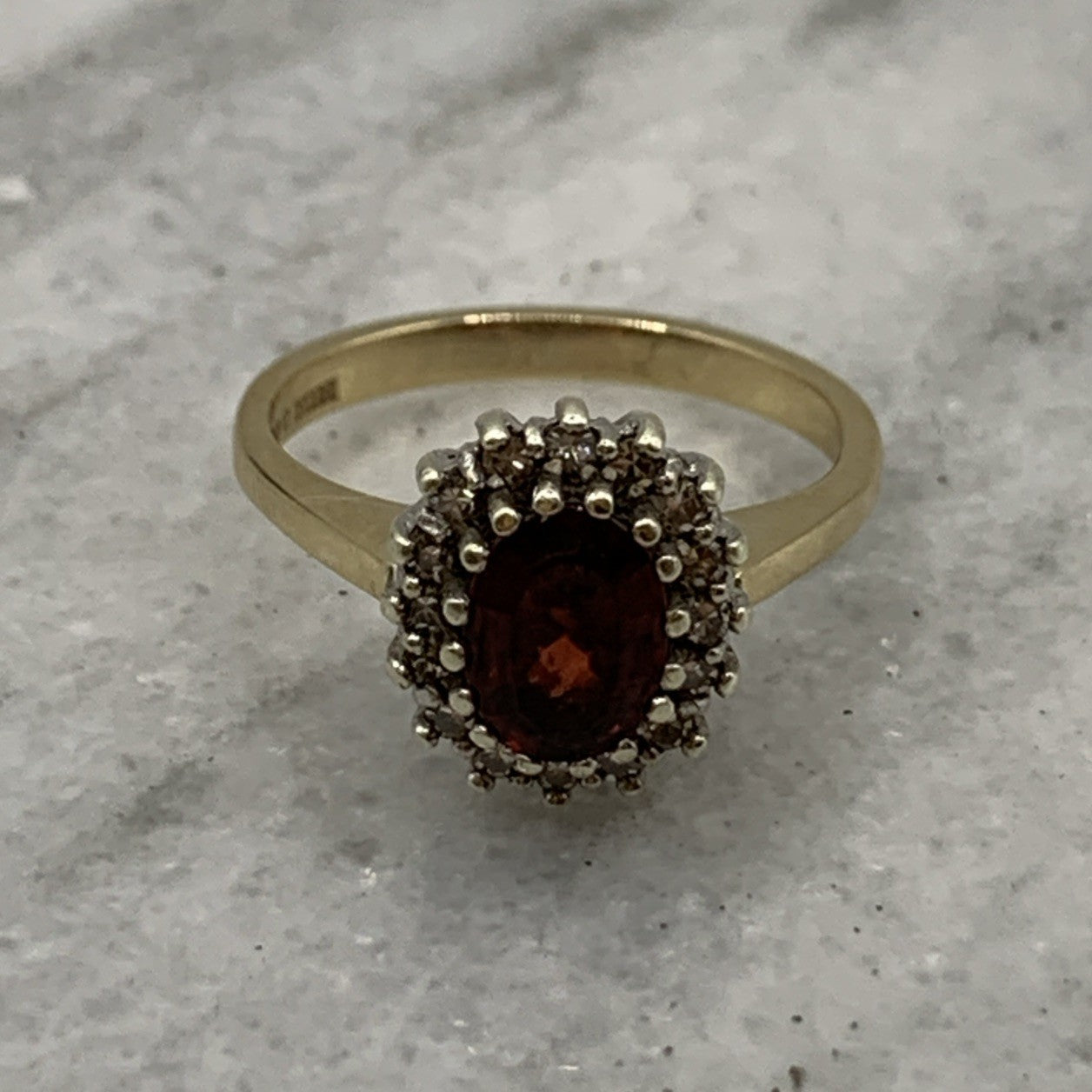 - A stunning gold ring showcasing an oval cut garnet accented by a halo of petite diamonds. Hallmarked.