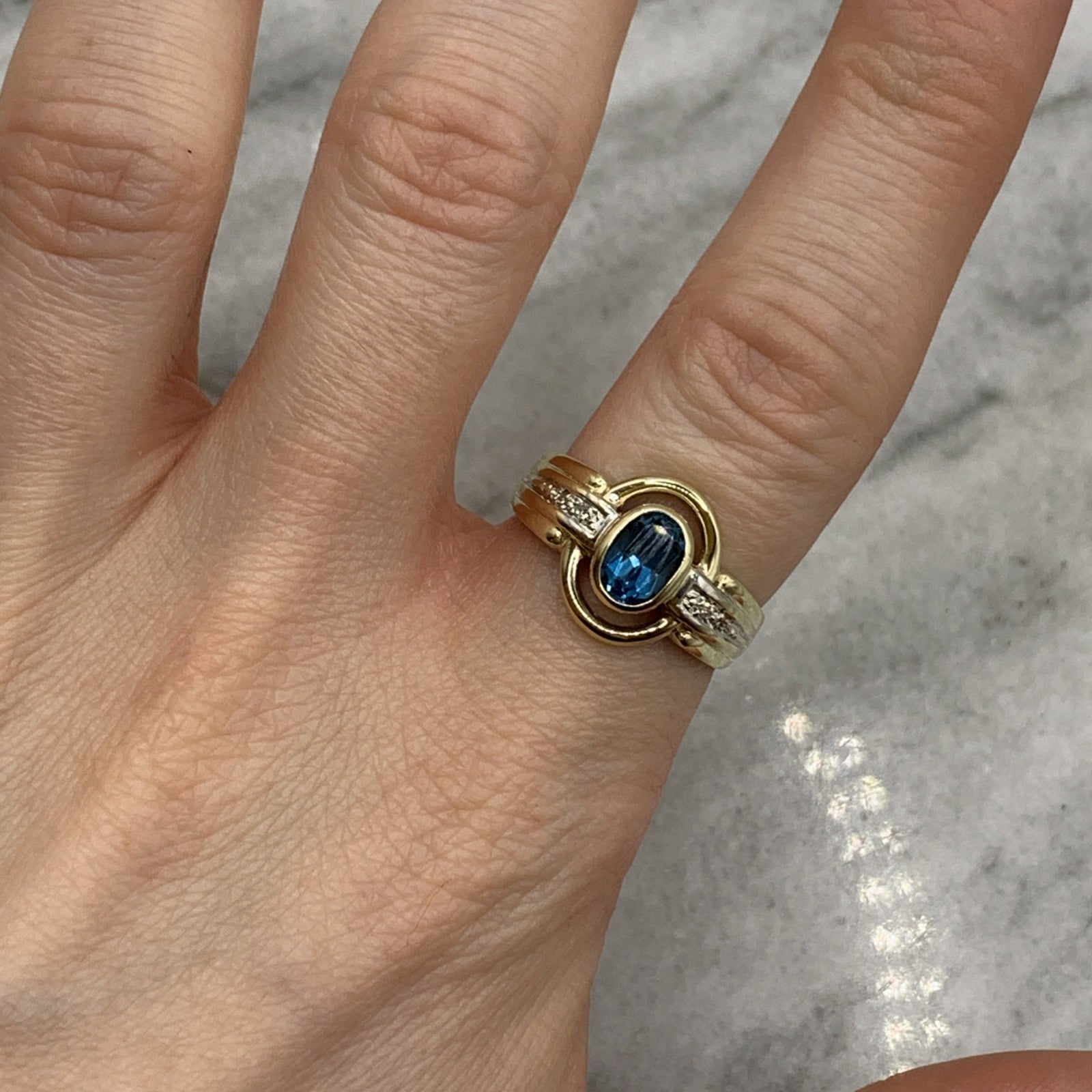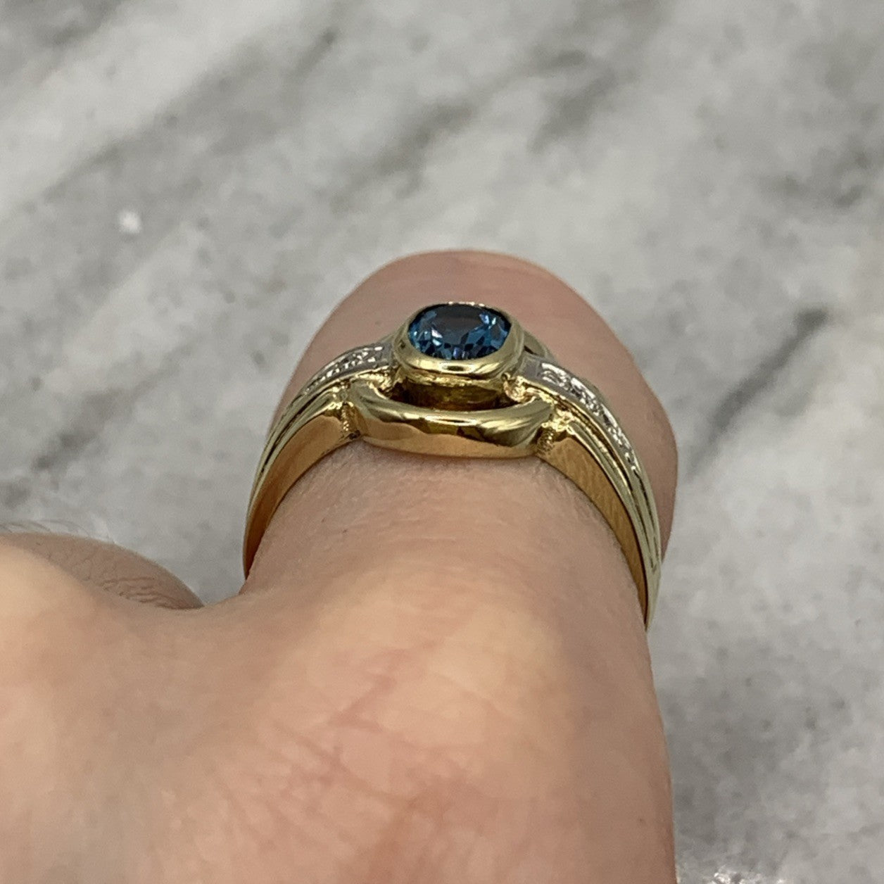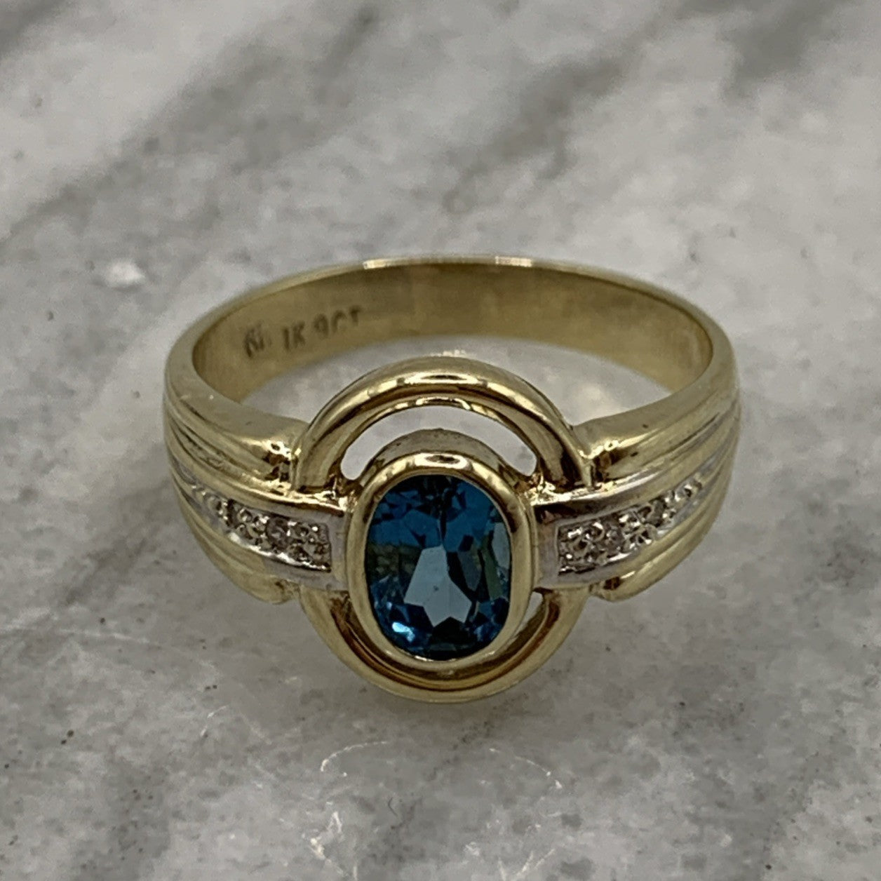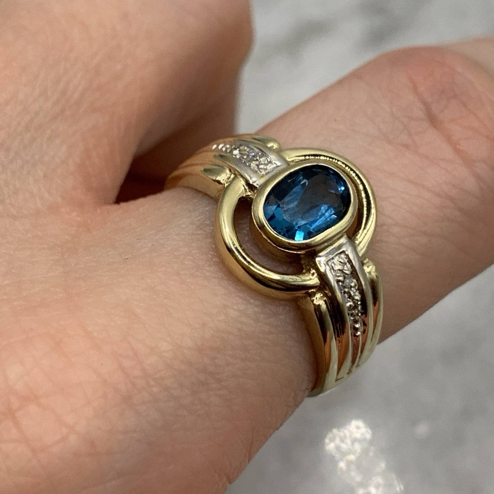 - A stunning gold ring showcasing a bezel set London blue topaz, accented by a cut out frame and petite pave set diamonds. Hallmarked.