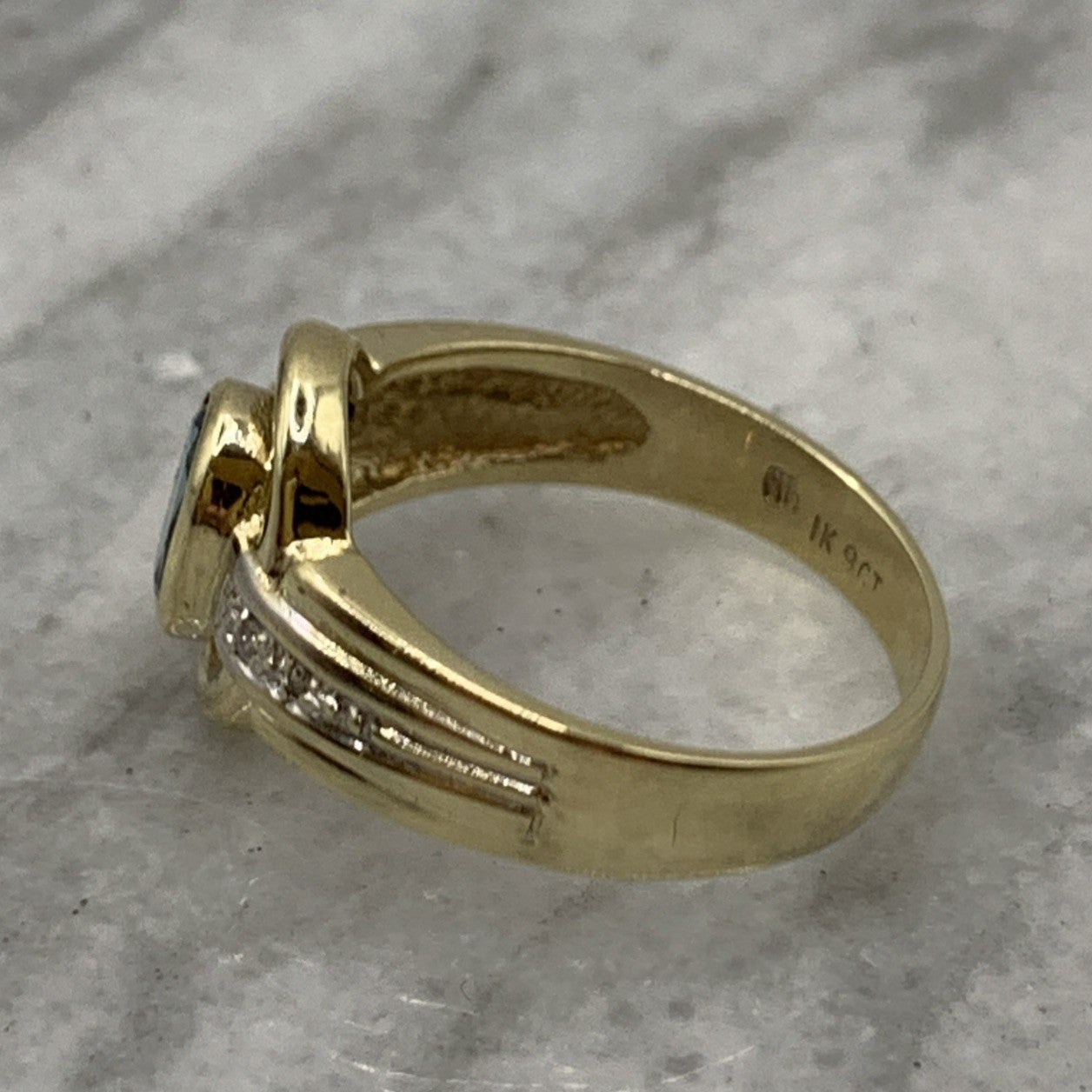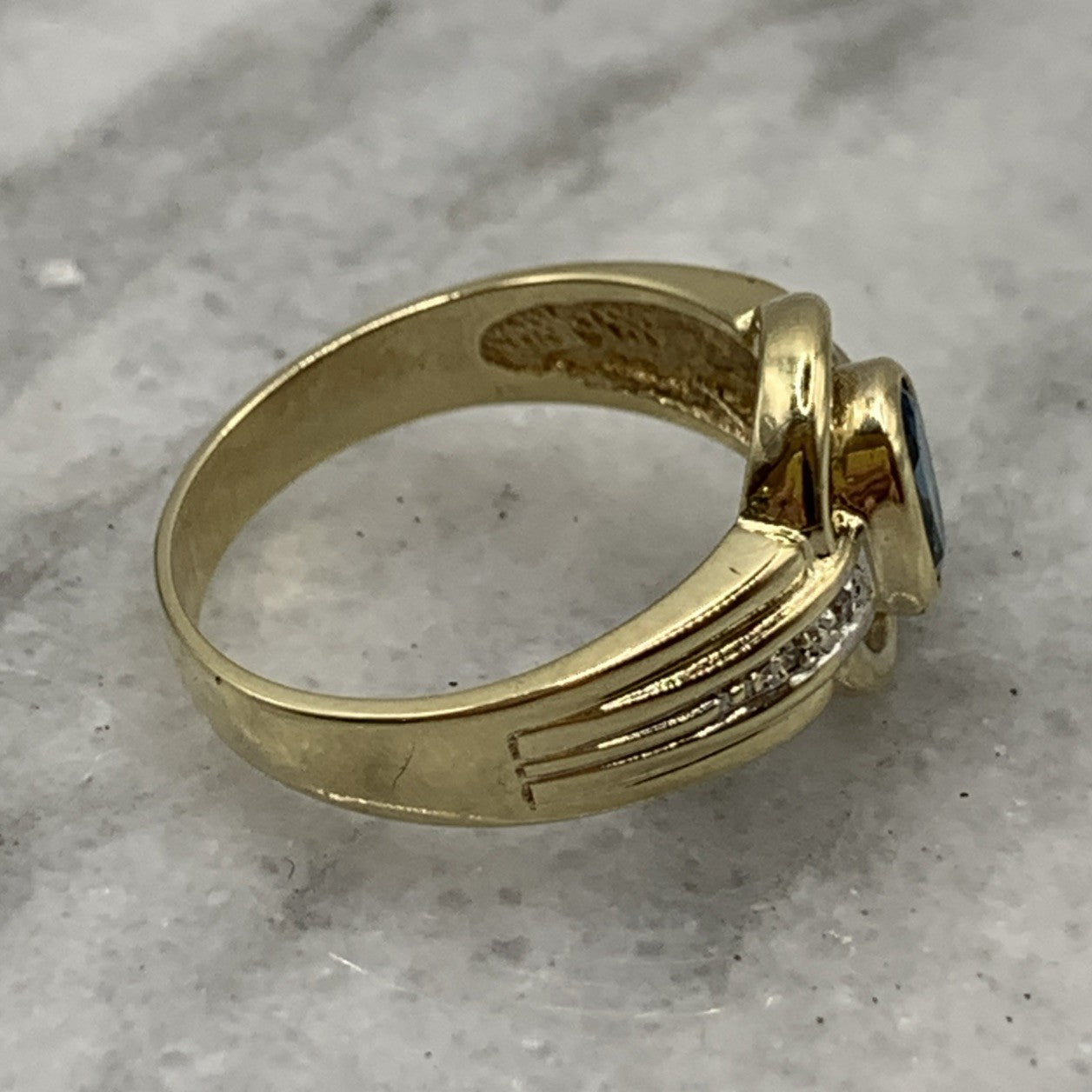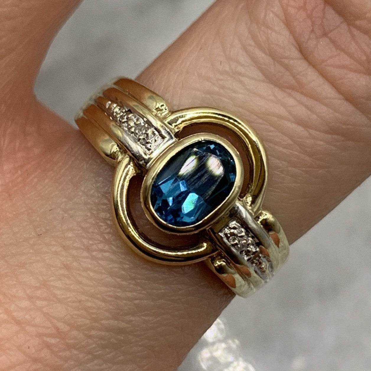- A stunning gold ring showcasing a bezel set London blue topaz, accented by a cut out frame and petite pave set diamonds. Hallmarked.