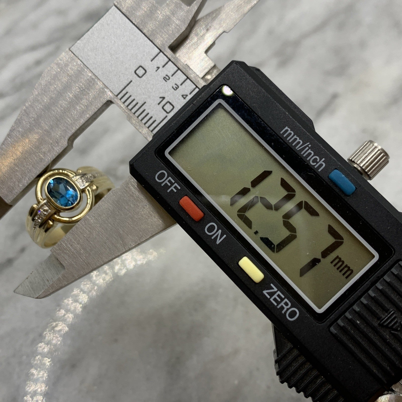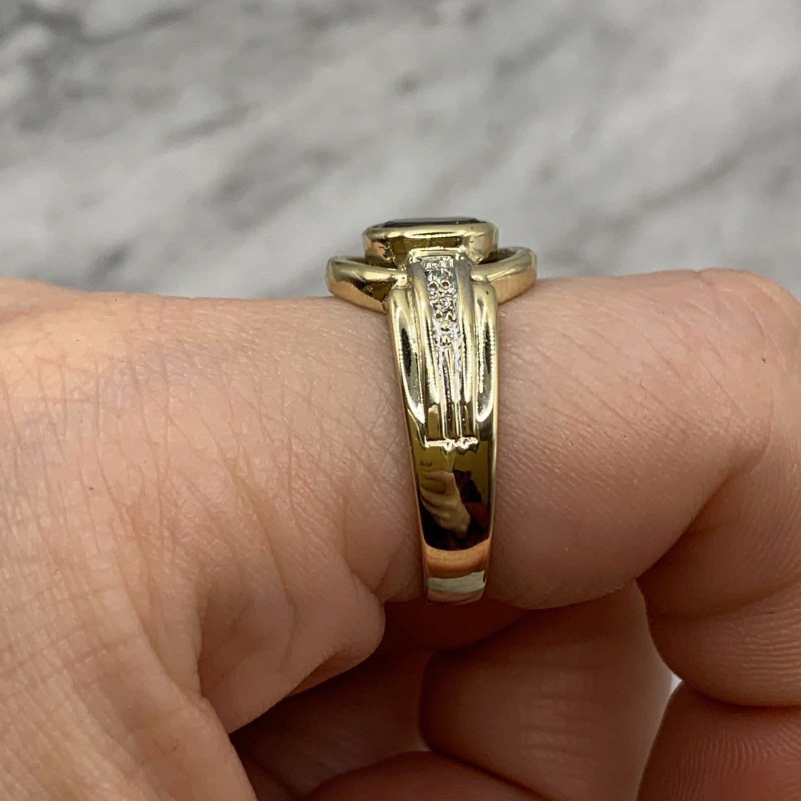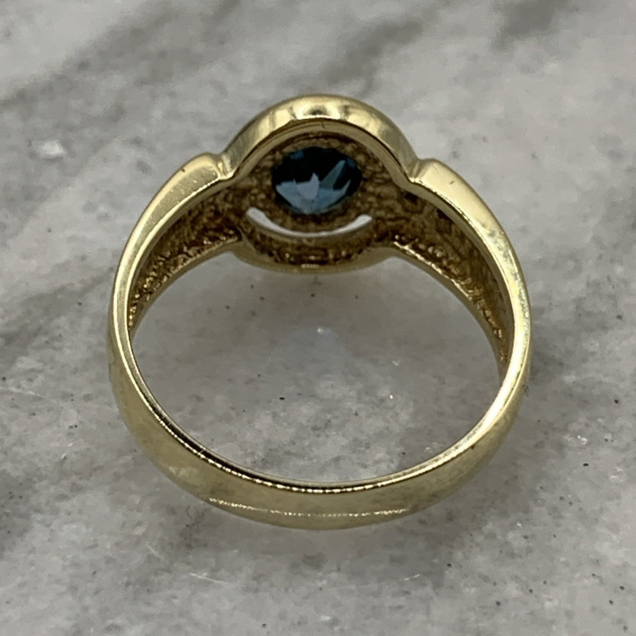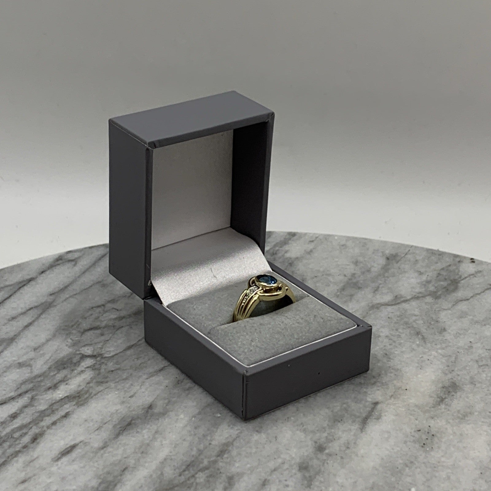 - A stunning gold ring showcasing a bezel set London blue topaz, accented by a cut out frame and petite pave set diamonds. Hallmarked.