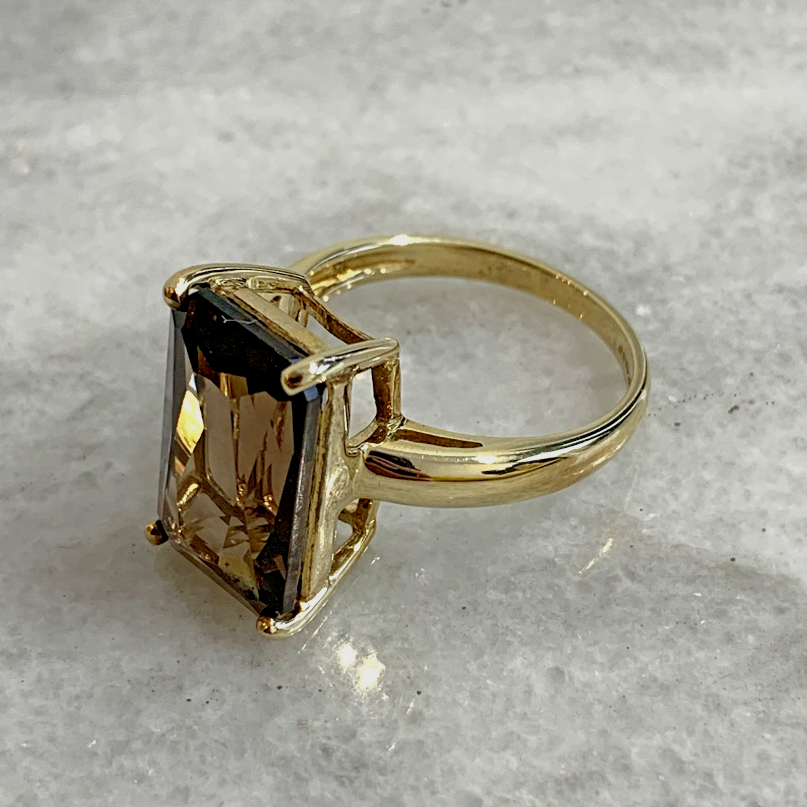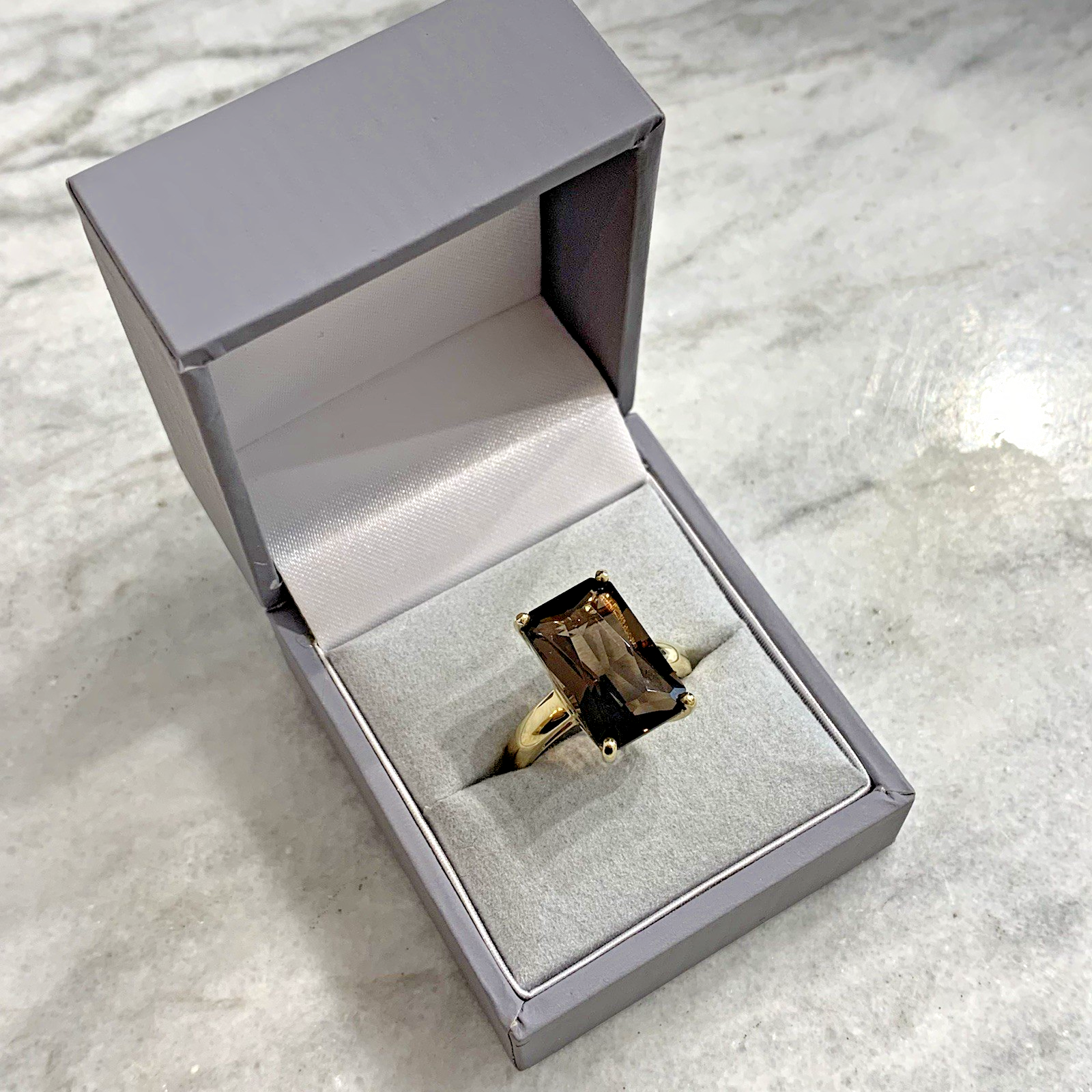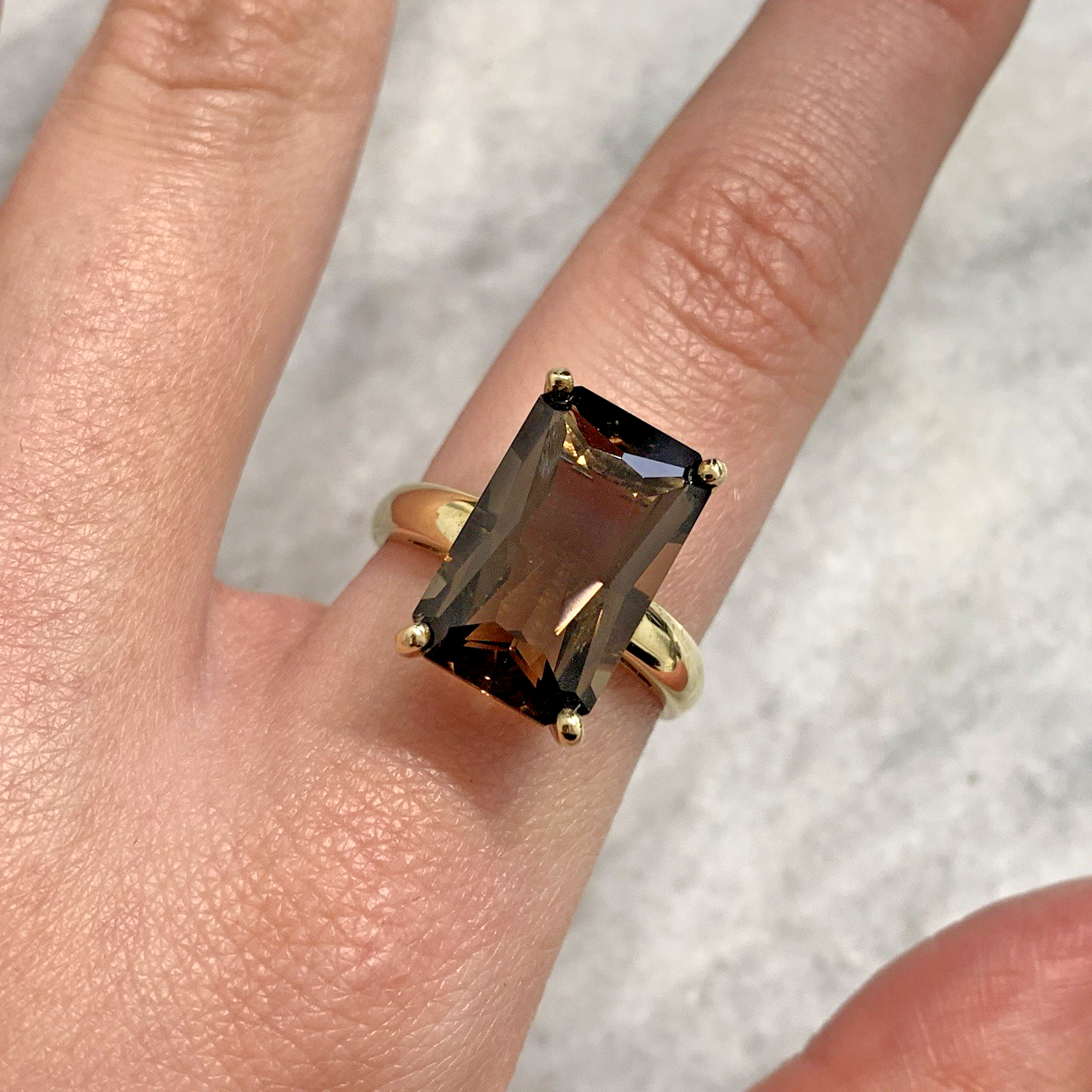 - A beautiful gold cocktail ring showcasing an elongated emerald cut smoky quartz gemstone.