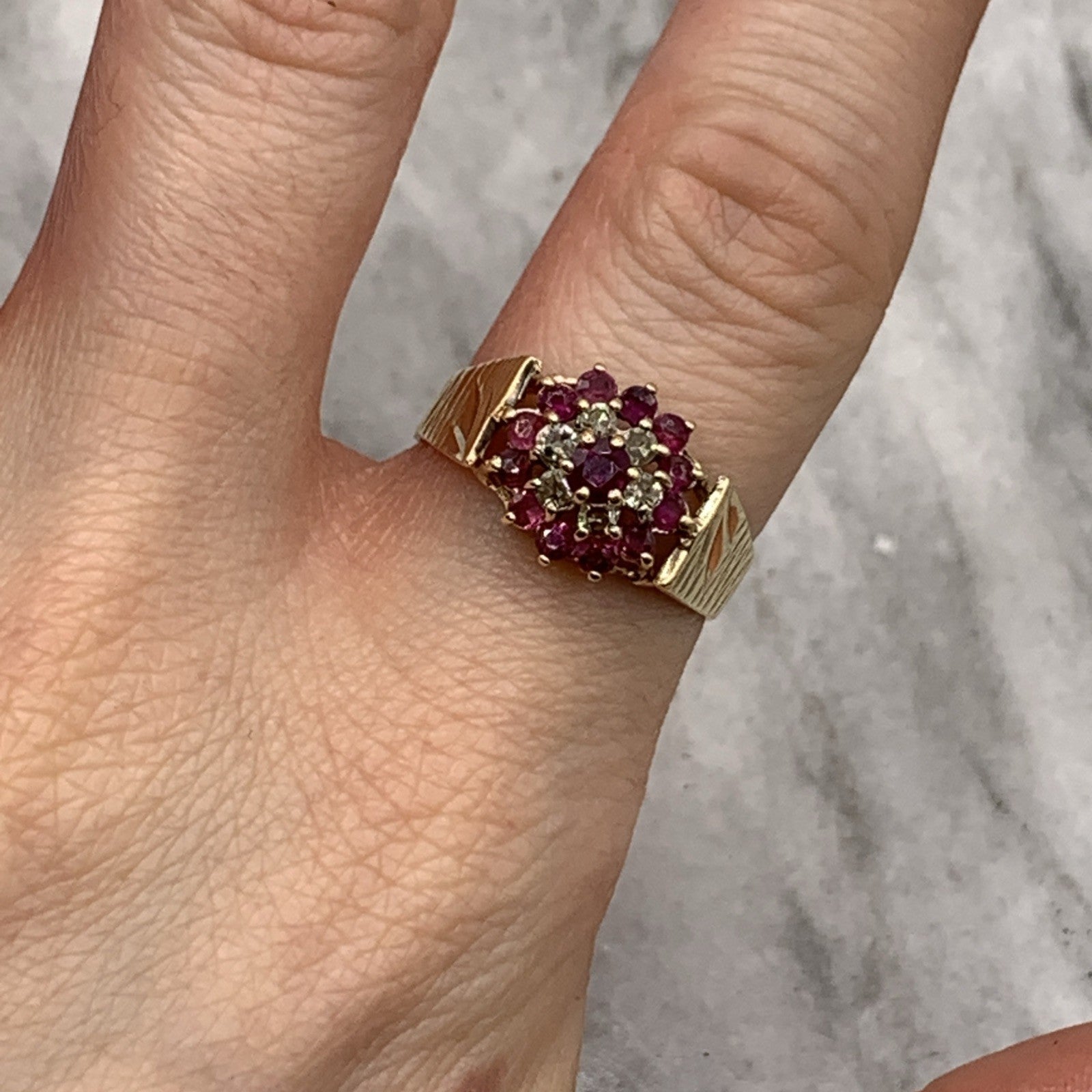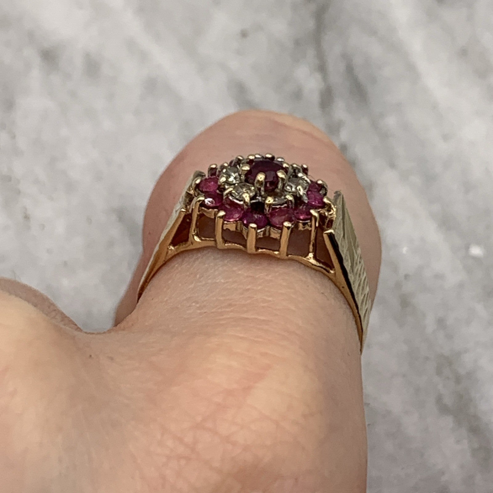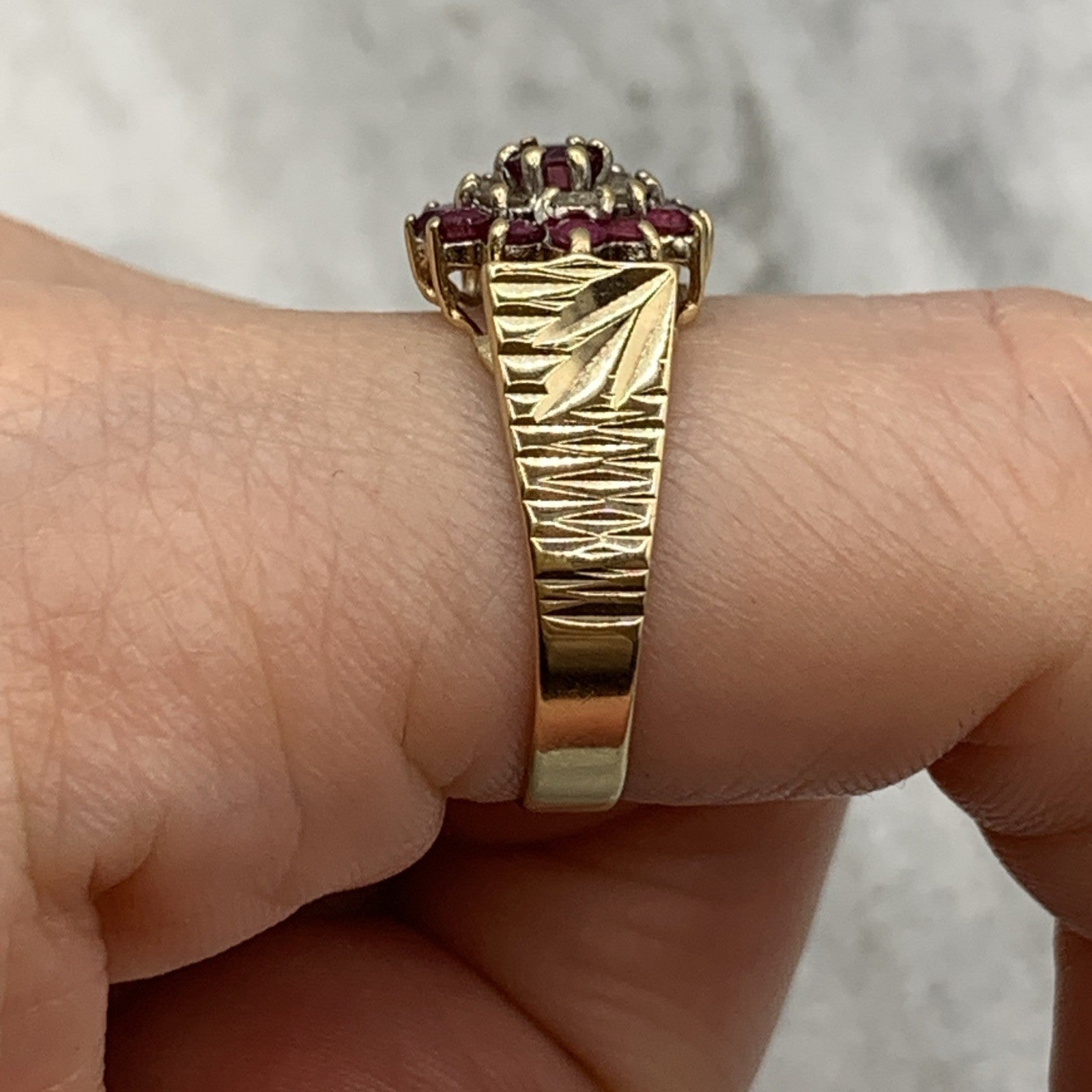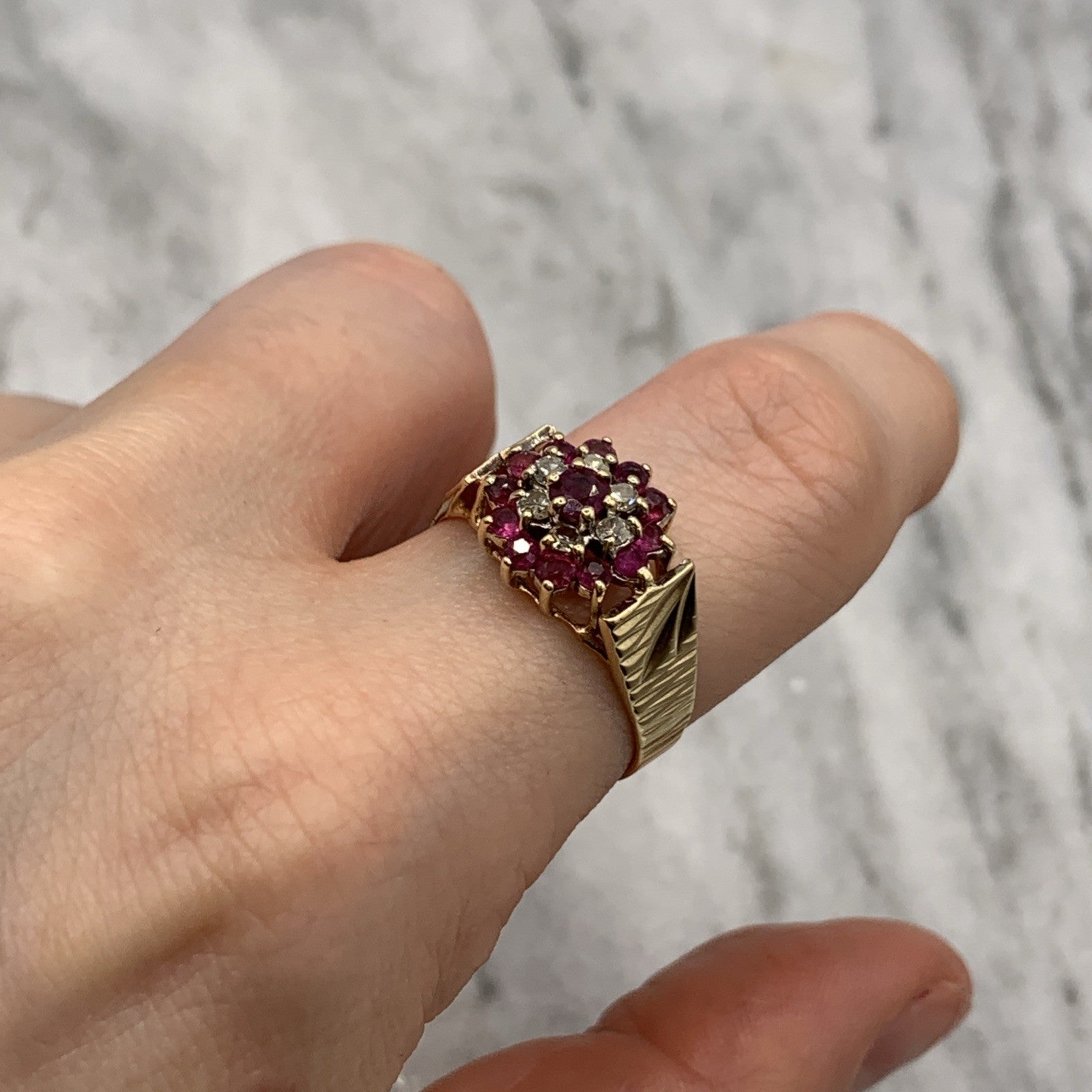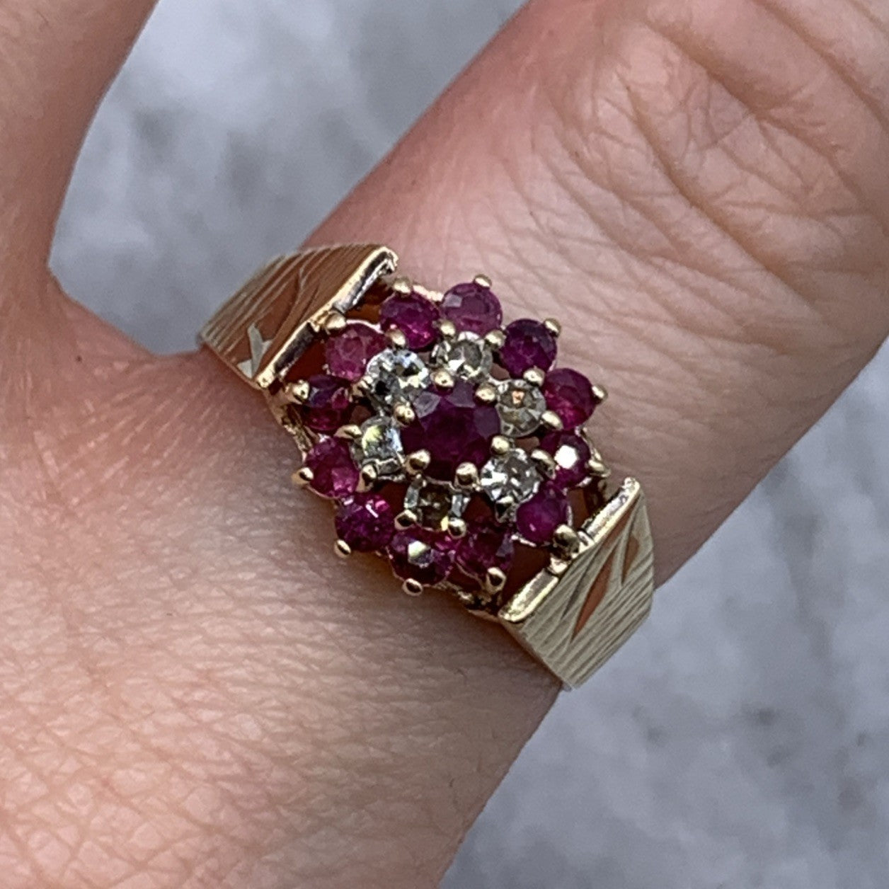 - A stunning gold ring featuring a floral cluster of round cut rubies and diamonds accented by textured shoulders.