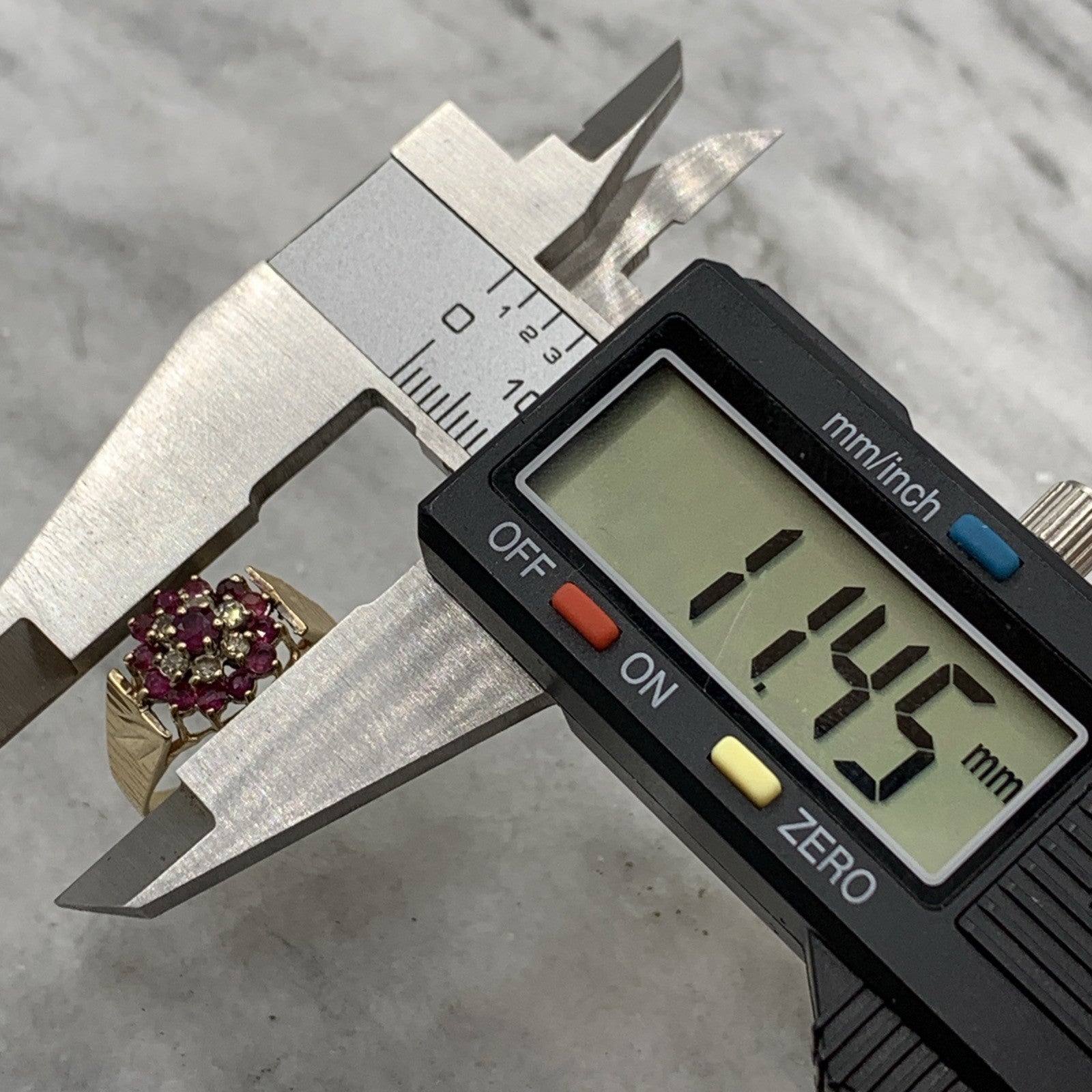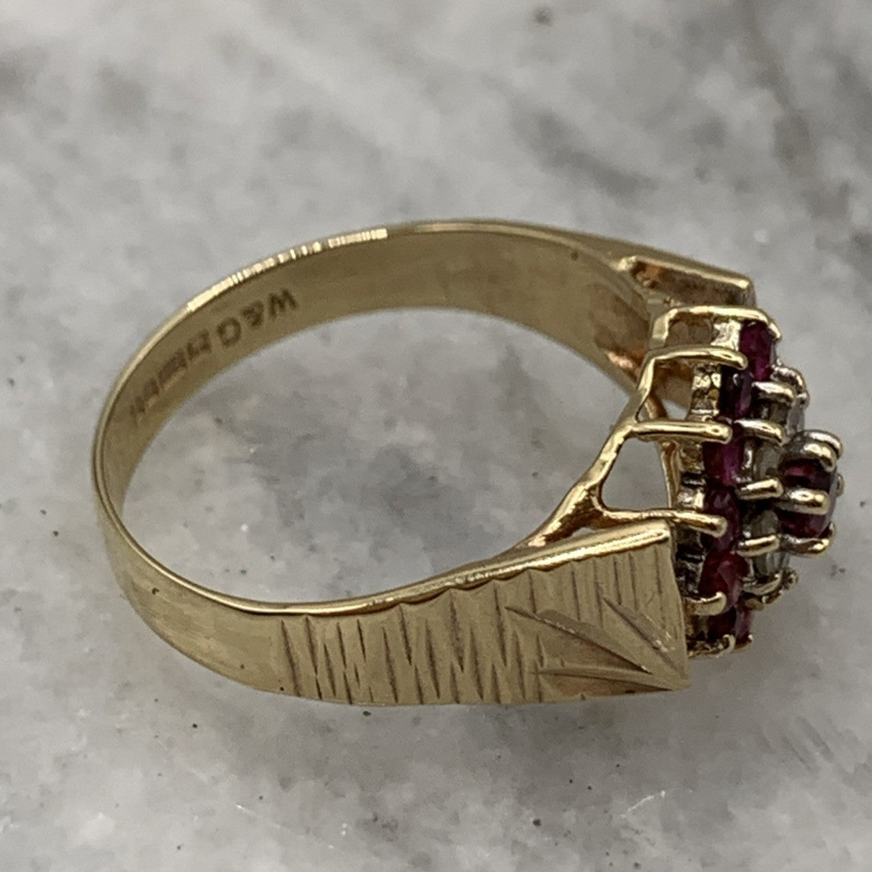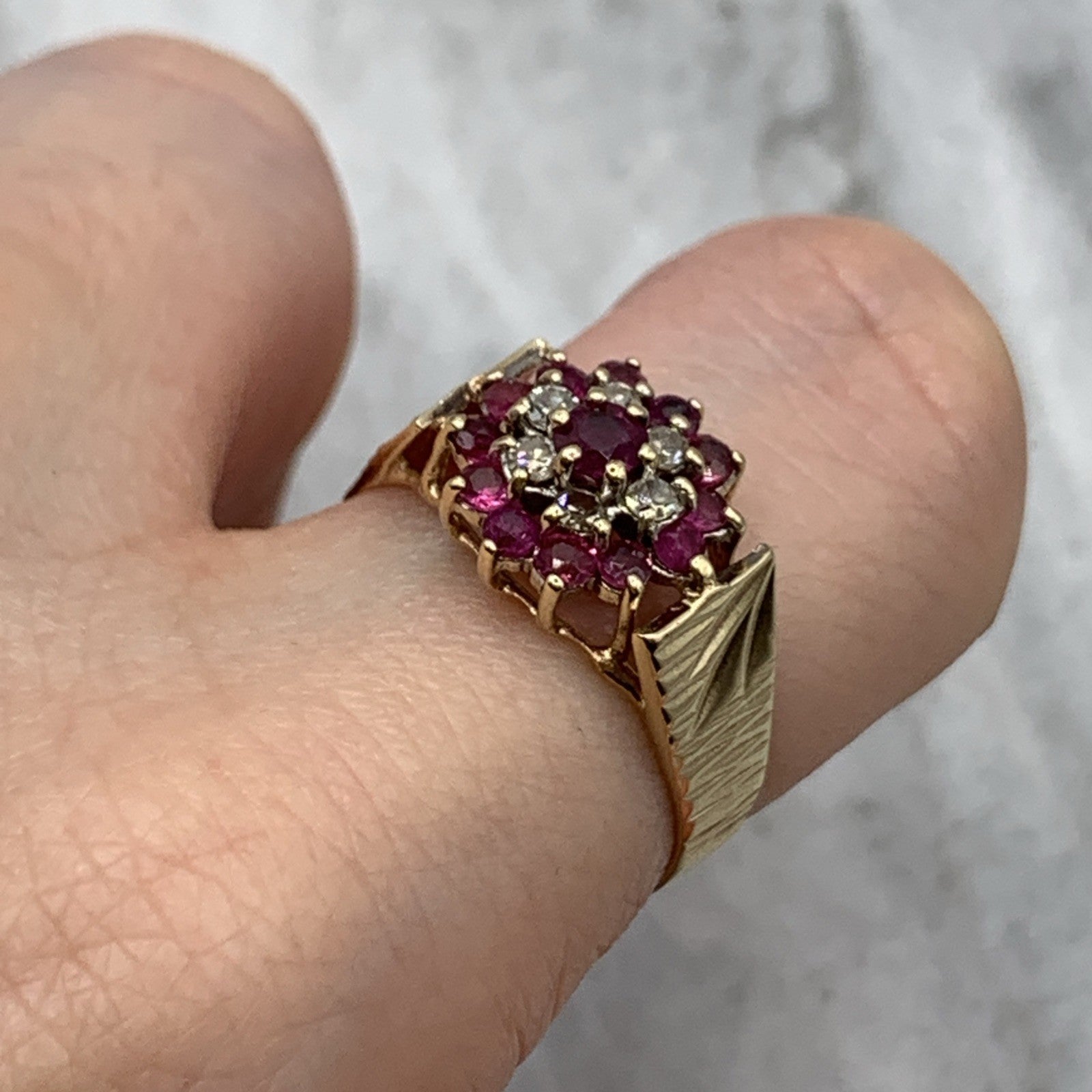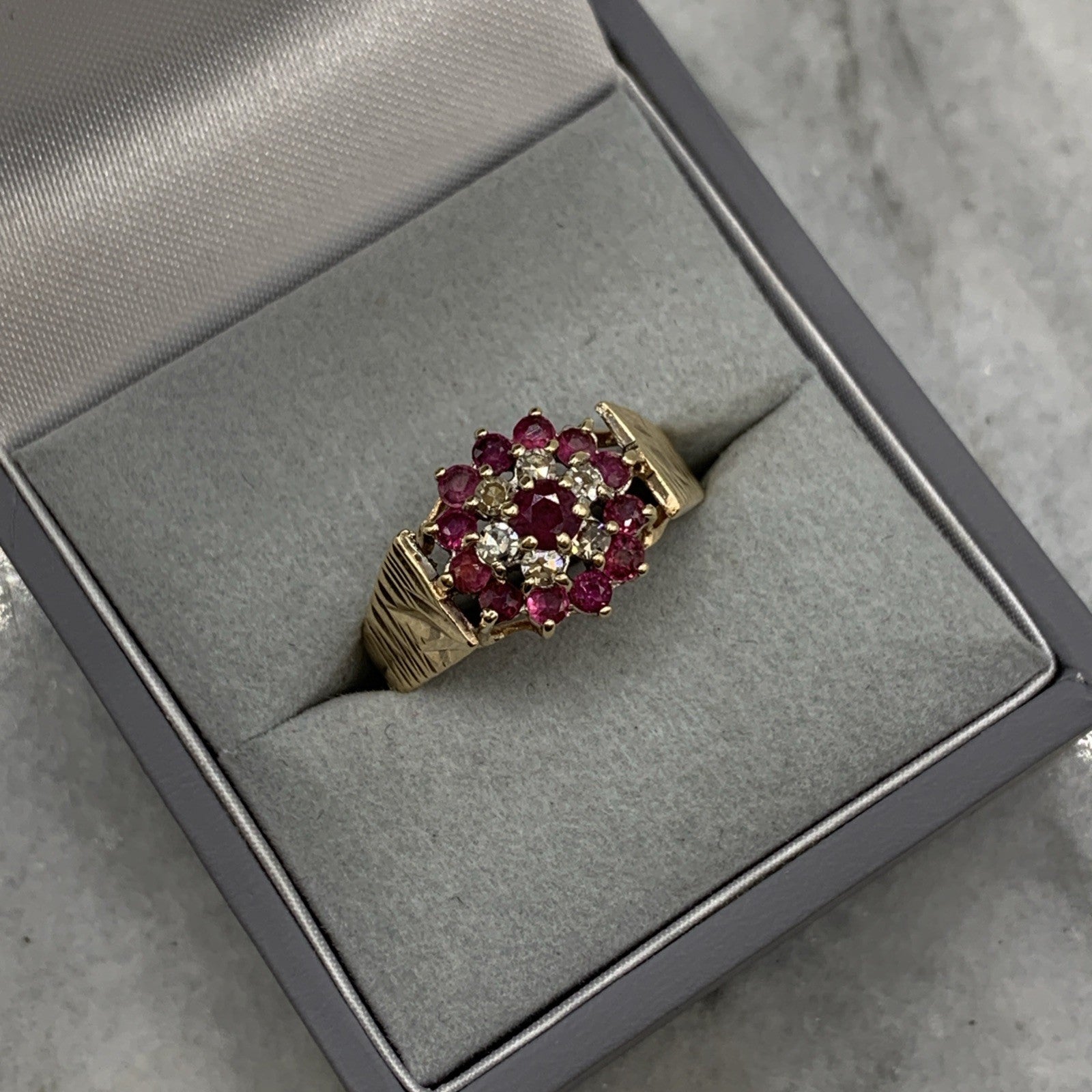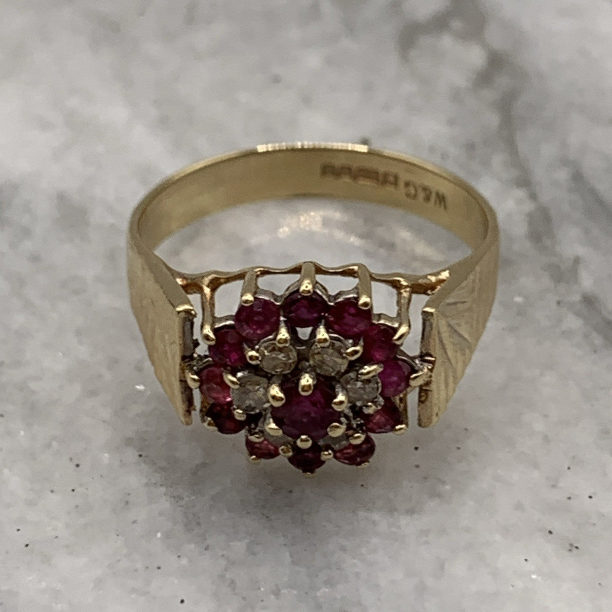 - A stunning gold ring featuring a floral cluster of round cut rubies and diamonds accented by textured shoulders.