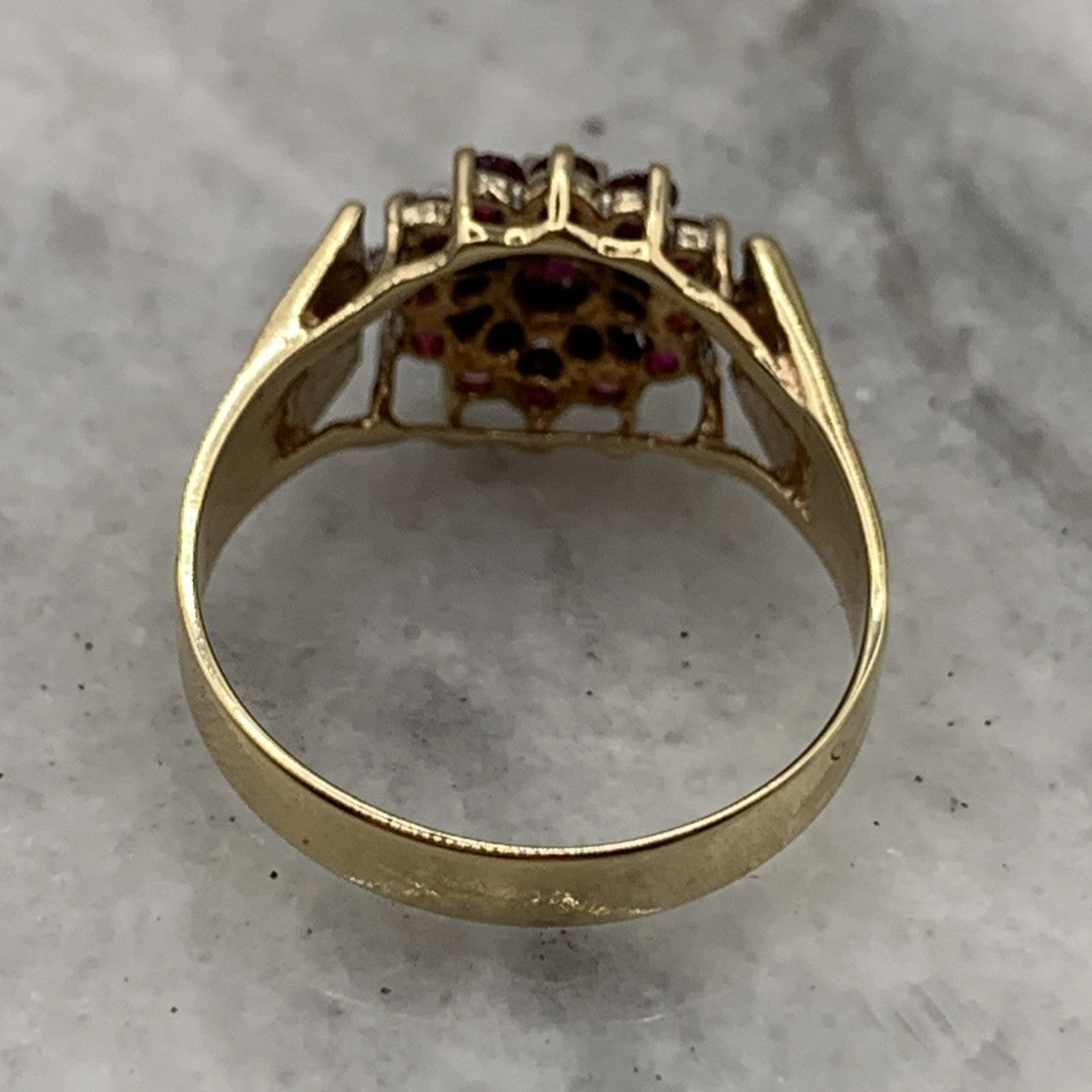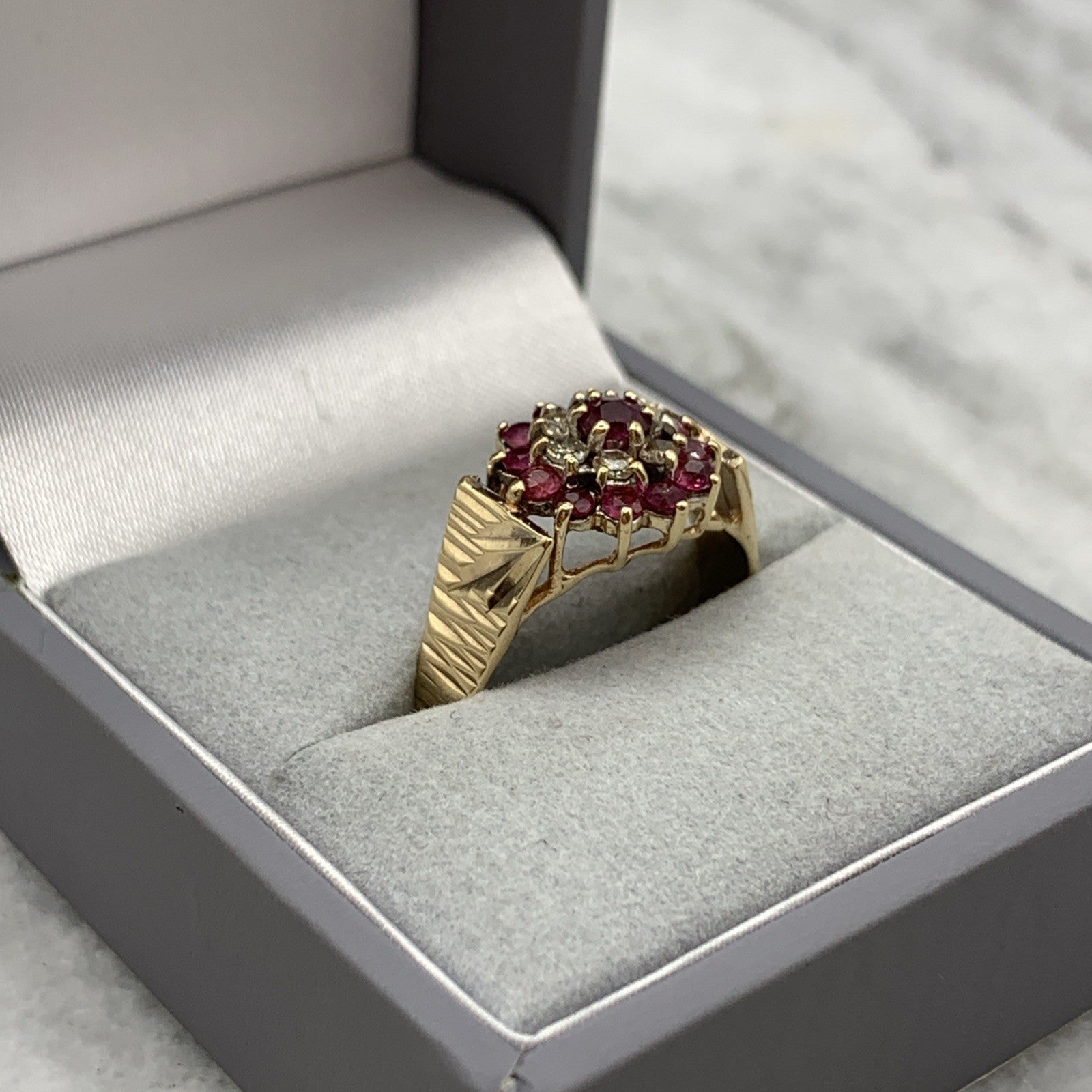 9 ct Gold Ruby & Diamond Floral Cluster Ring 375 9k Yellow Gold- Size P 1/2