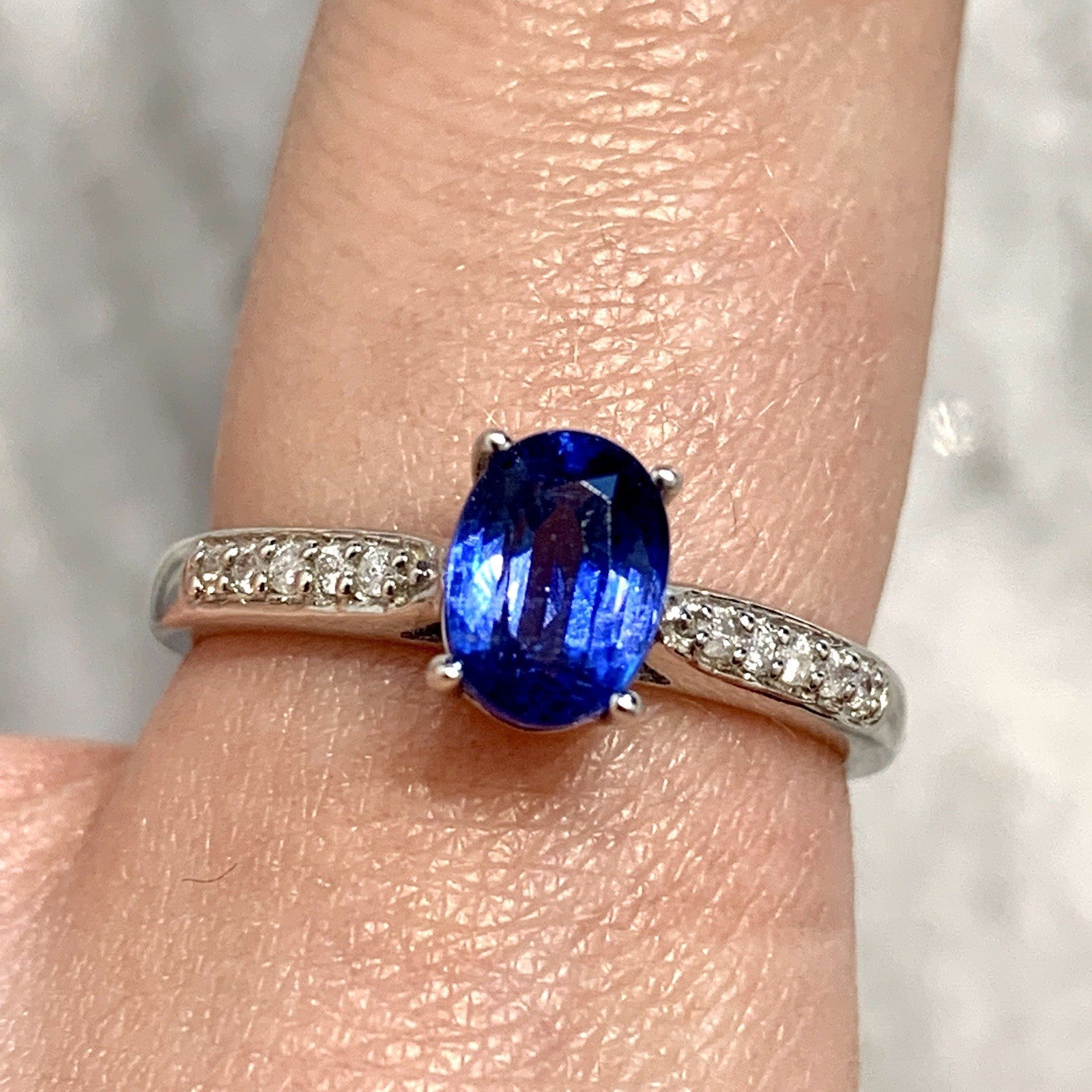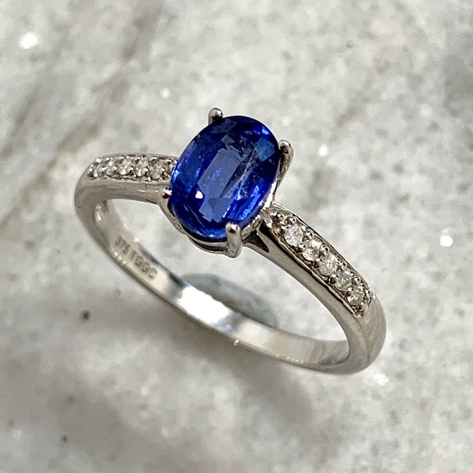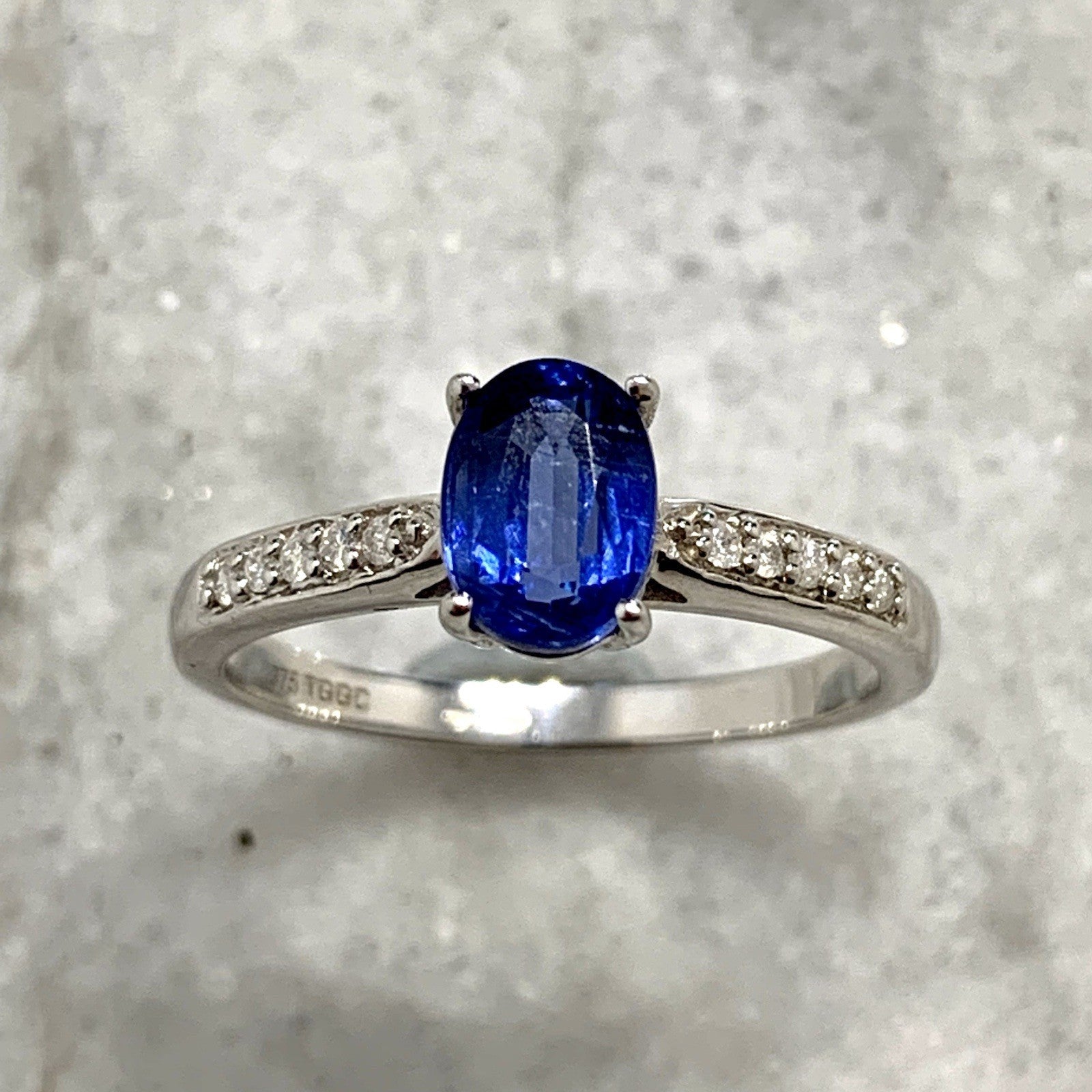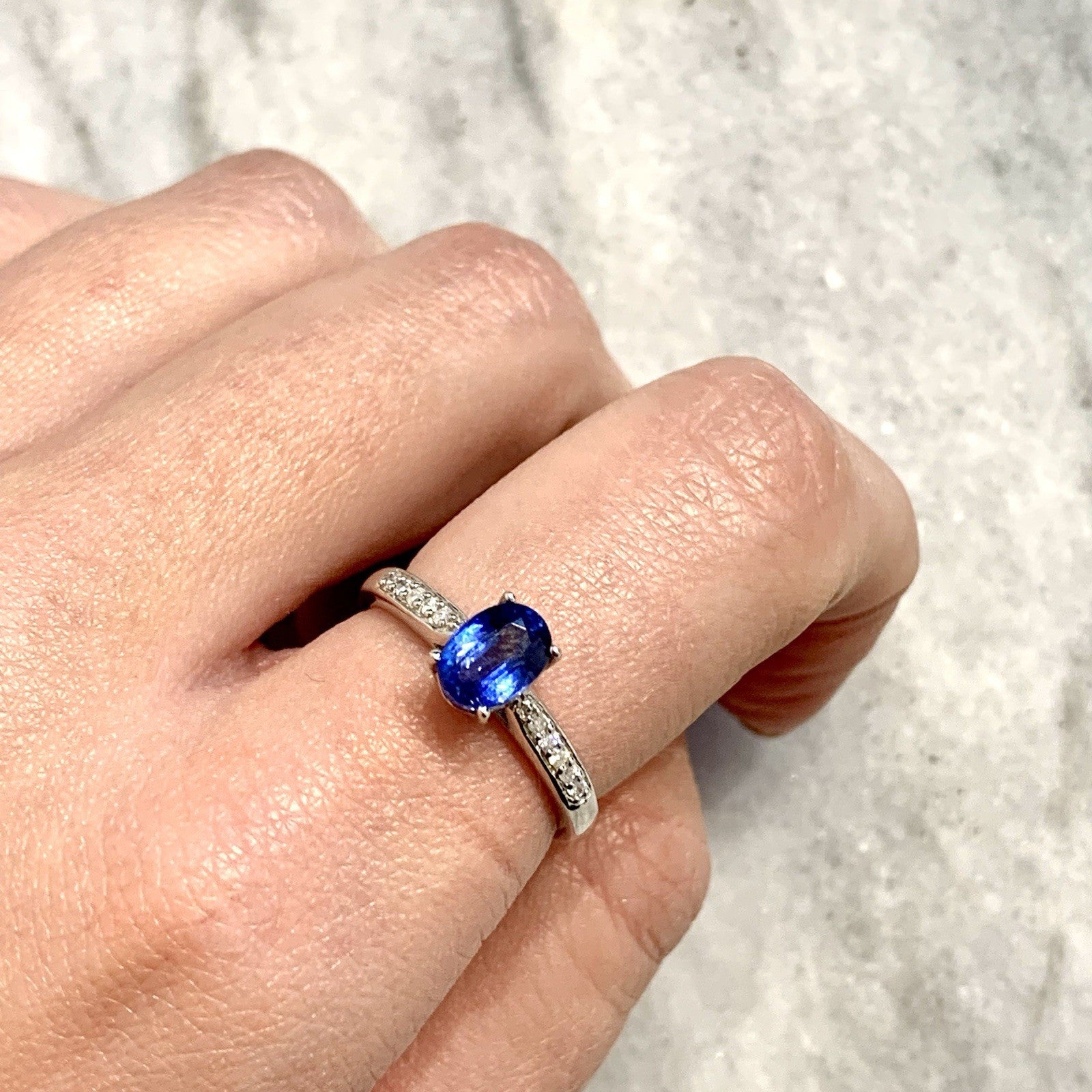 - A lovely white gold ring showcasing an oval cut kyanite gemstone, accented by petite diamonds on the shoulders.