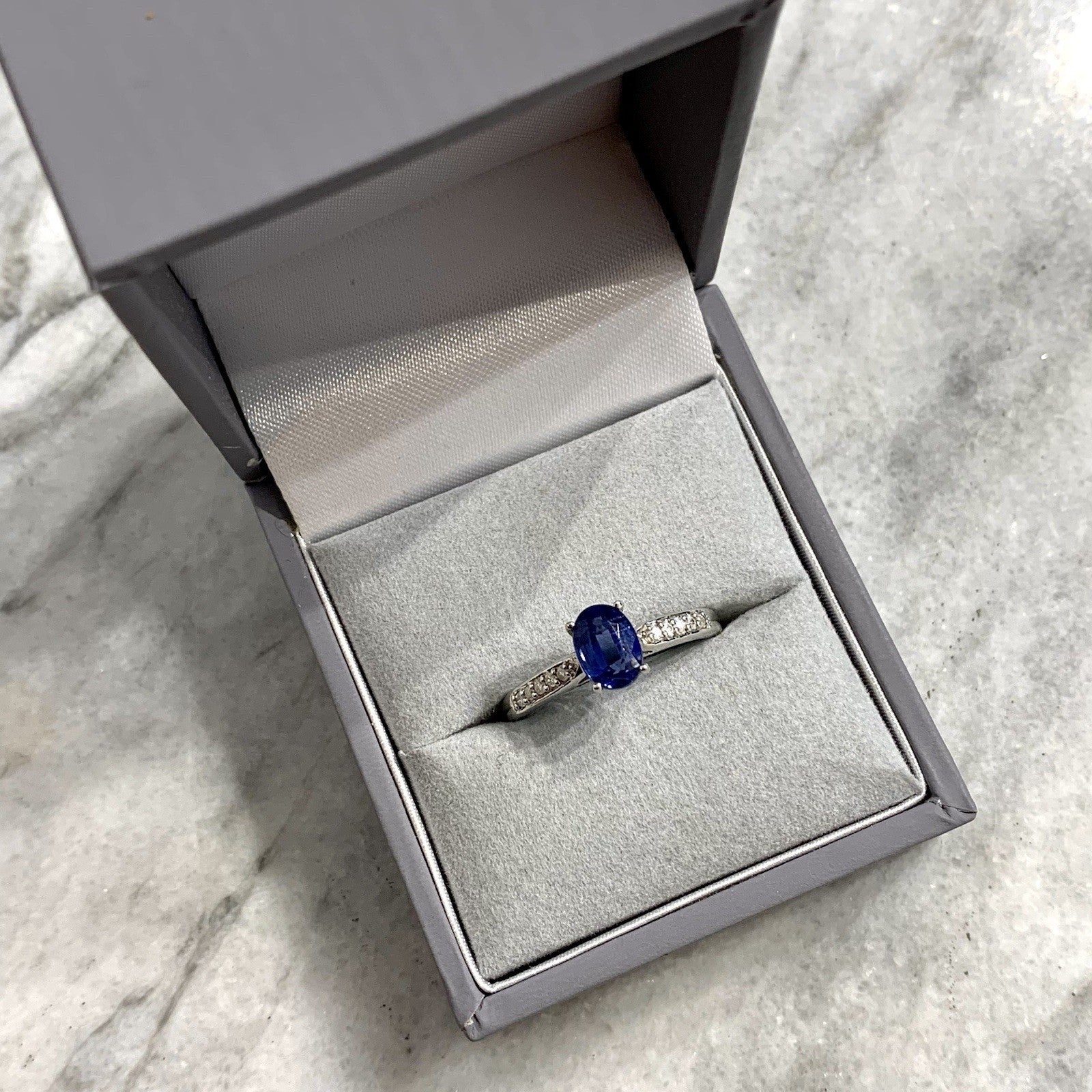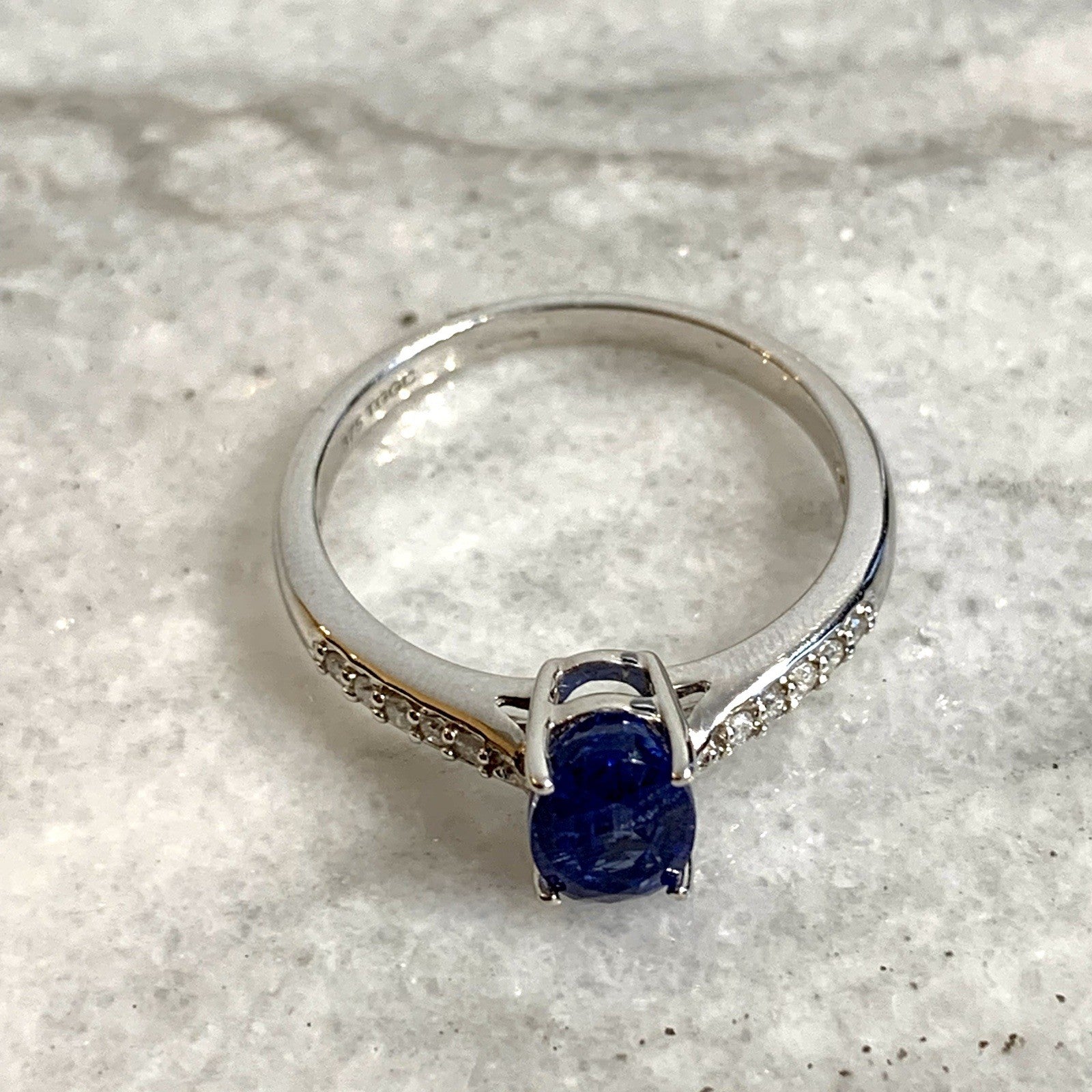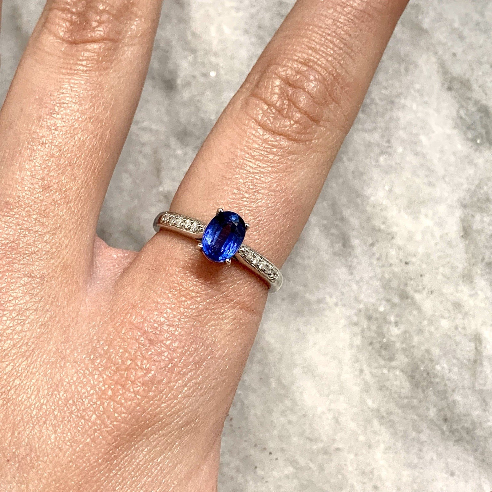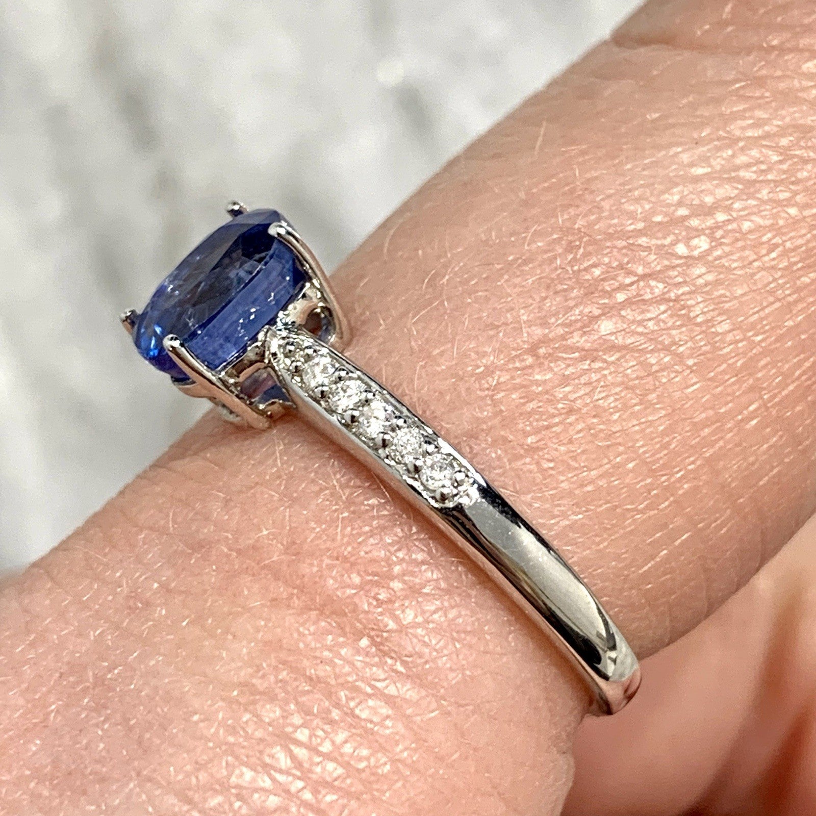 - A lovely white gold ring showcasing an oval cut kyanite gemstone, accented by petite diamonds on the shoulders.