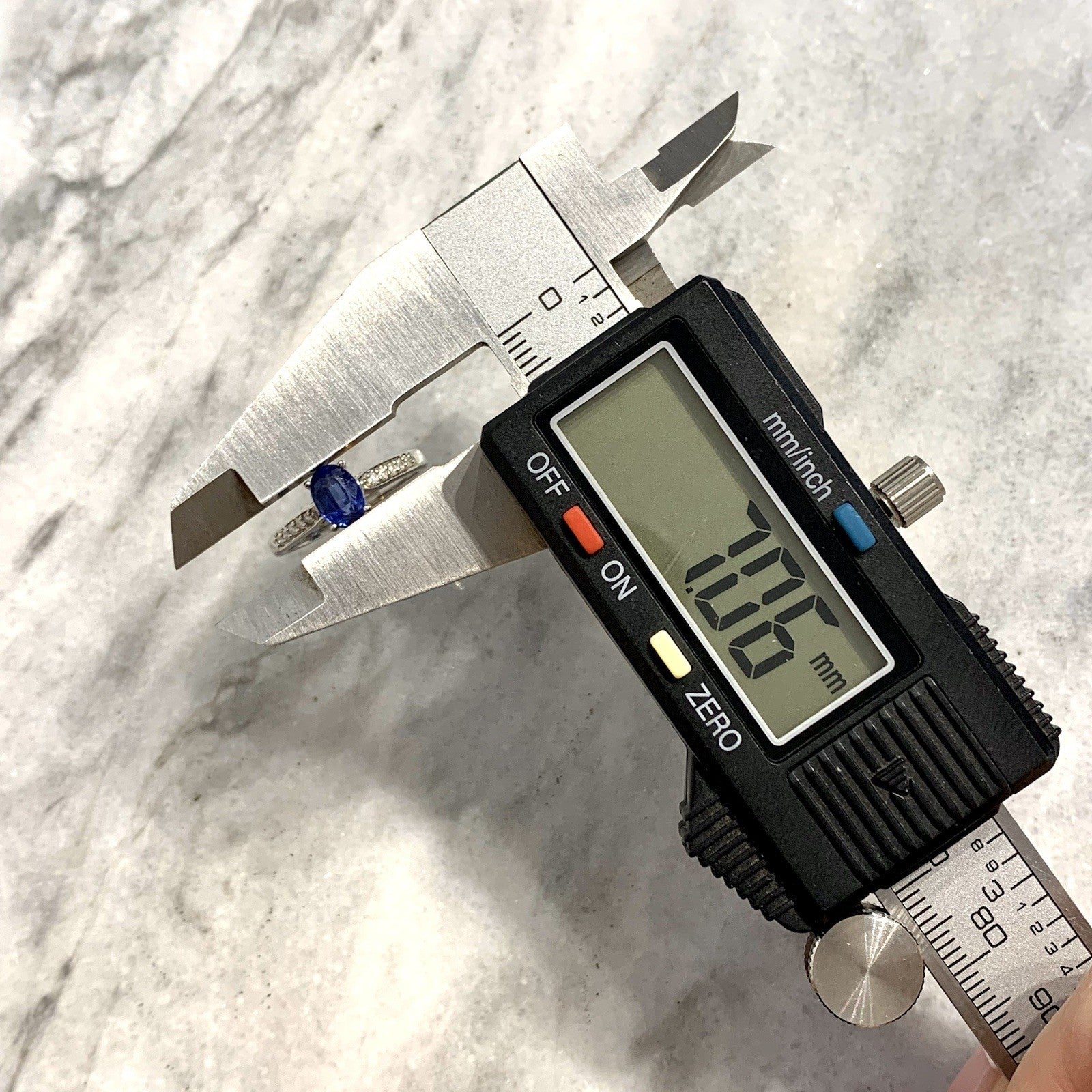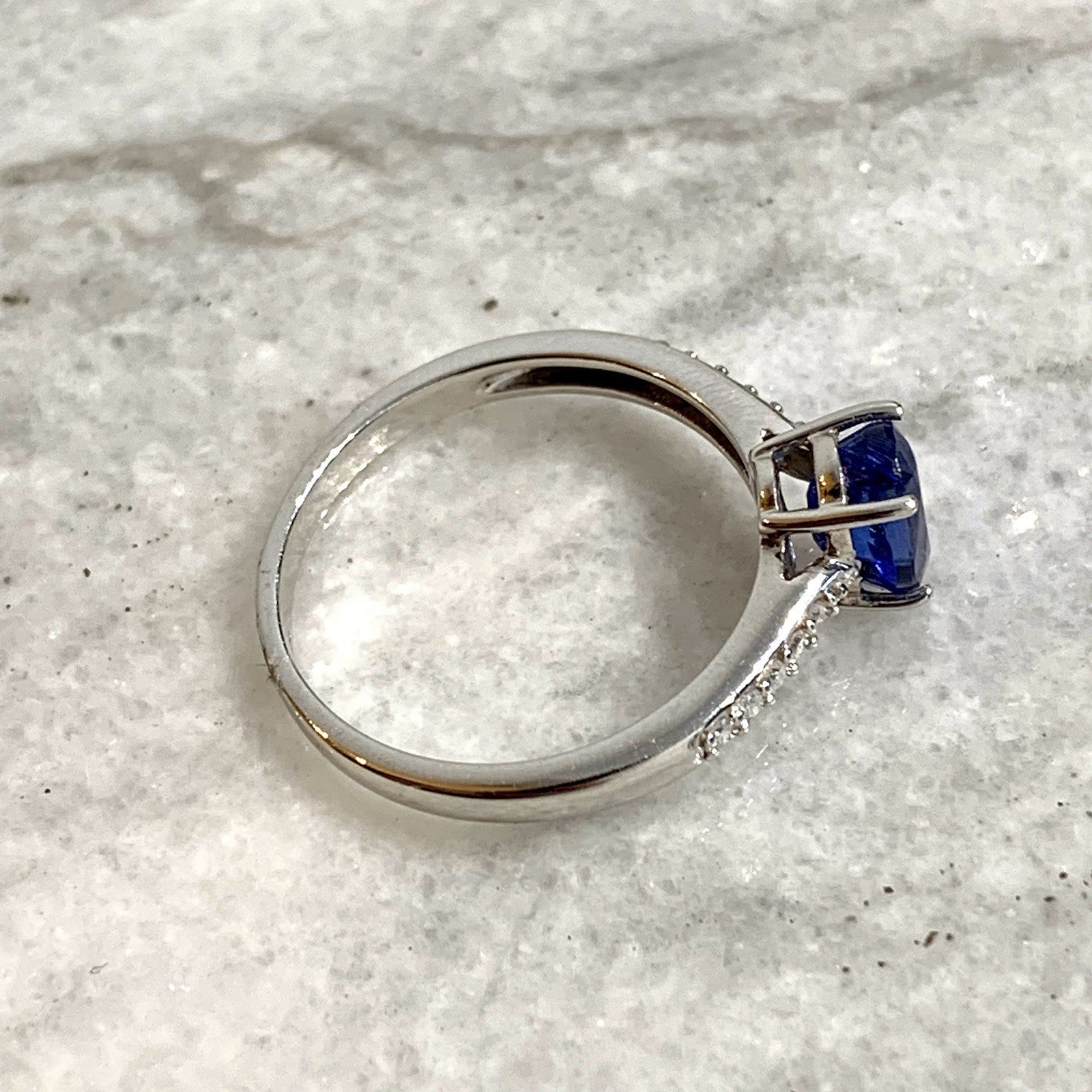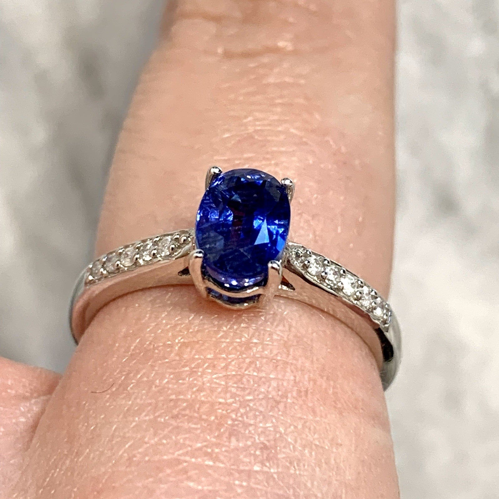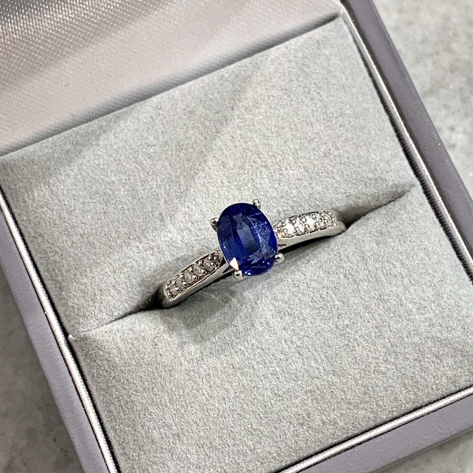 - A lovely white gold ring showcasing an oval cut kyanite gemstone, accented by petite diamonds on the shoulders.