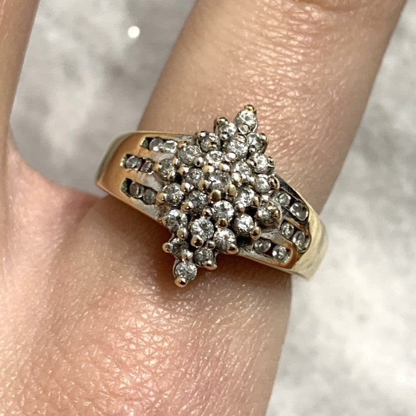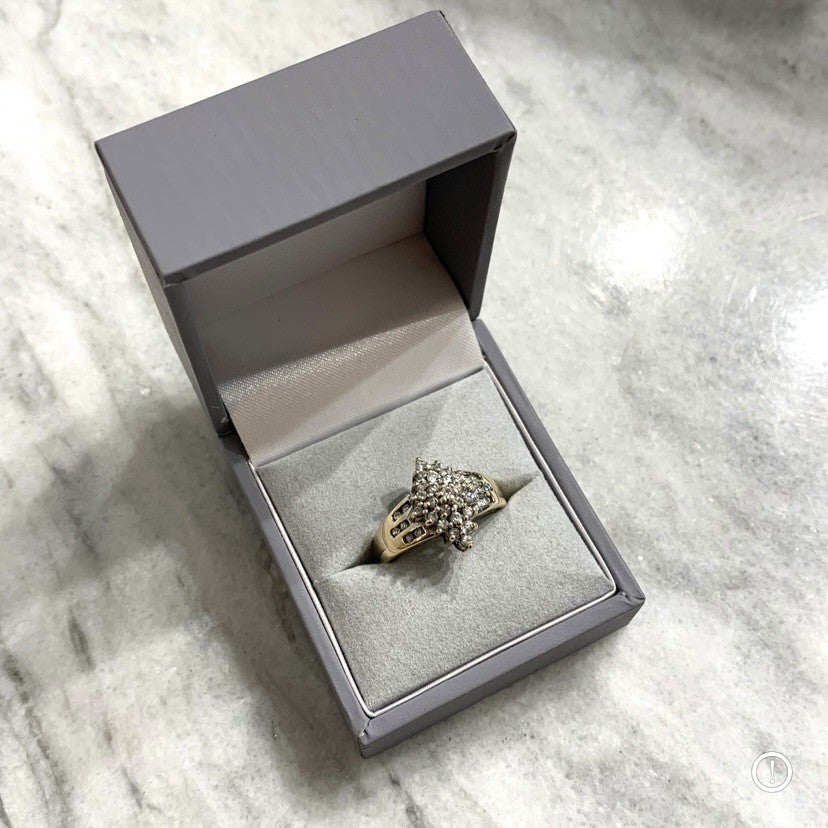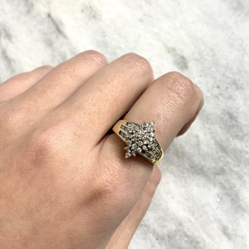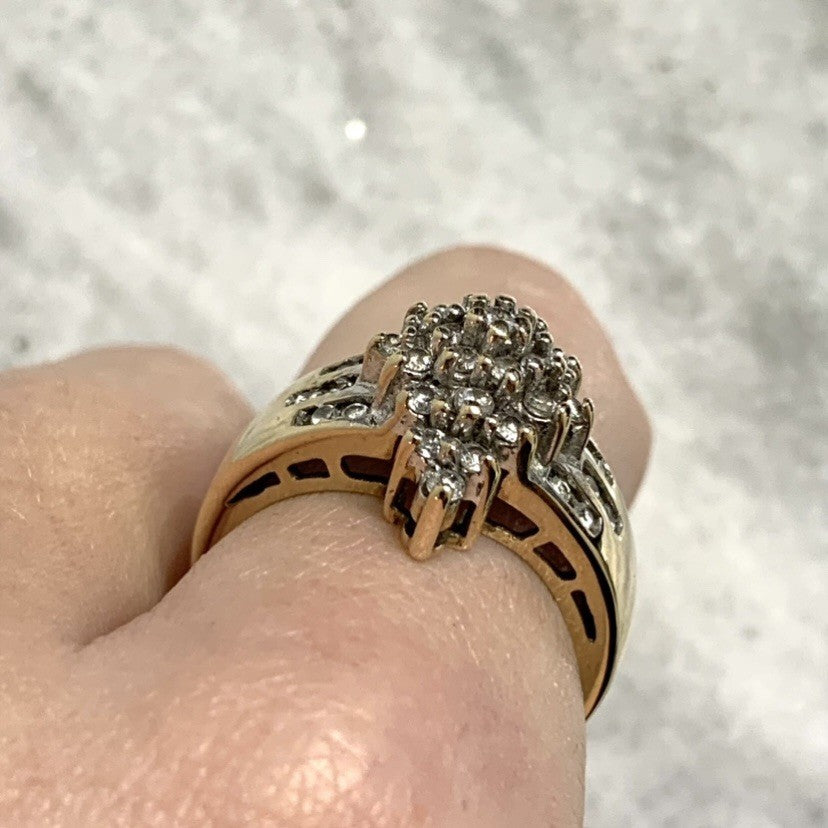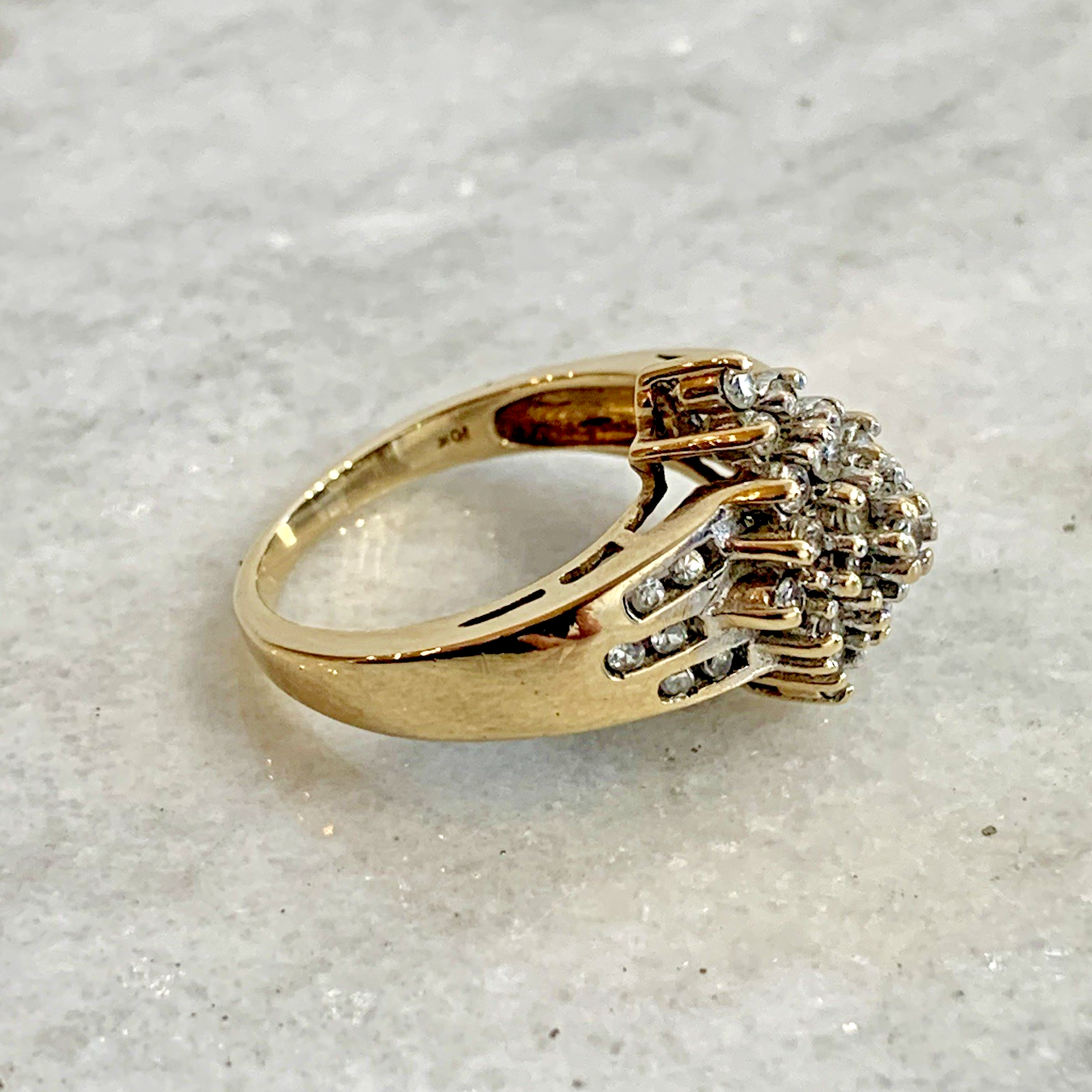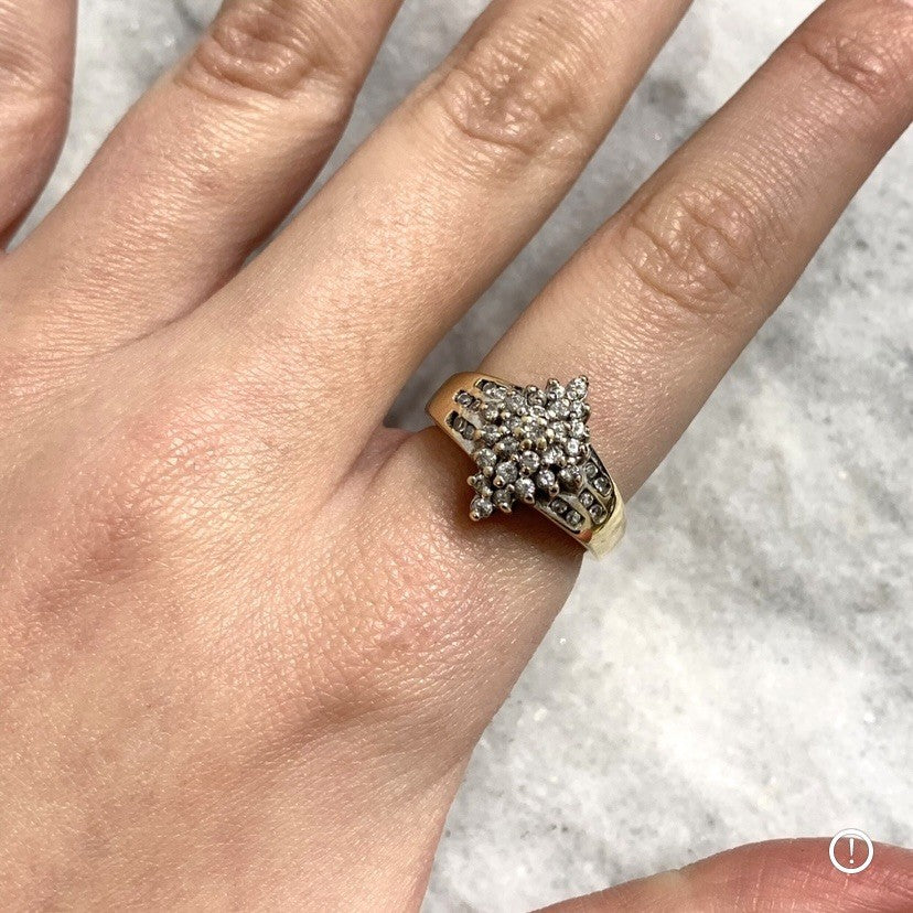 - A beautiful chunky gold ring showcasing an ornate cluster of round cut cubic zirconia gemstones, further accented by additional CZ on the shoulders in a channel setting.