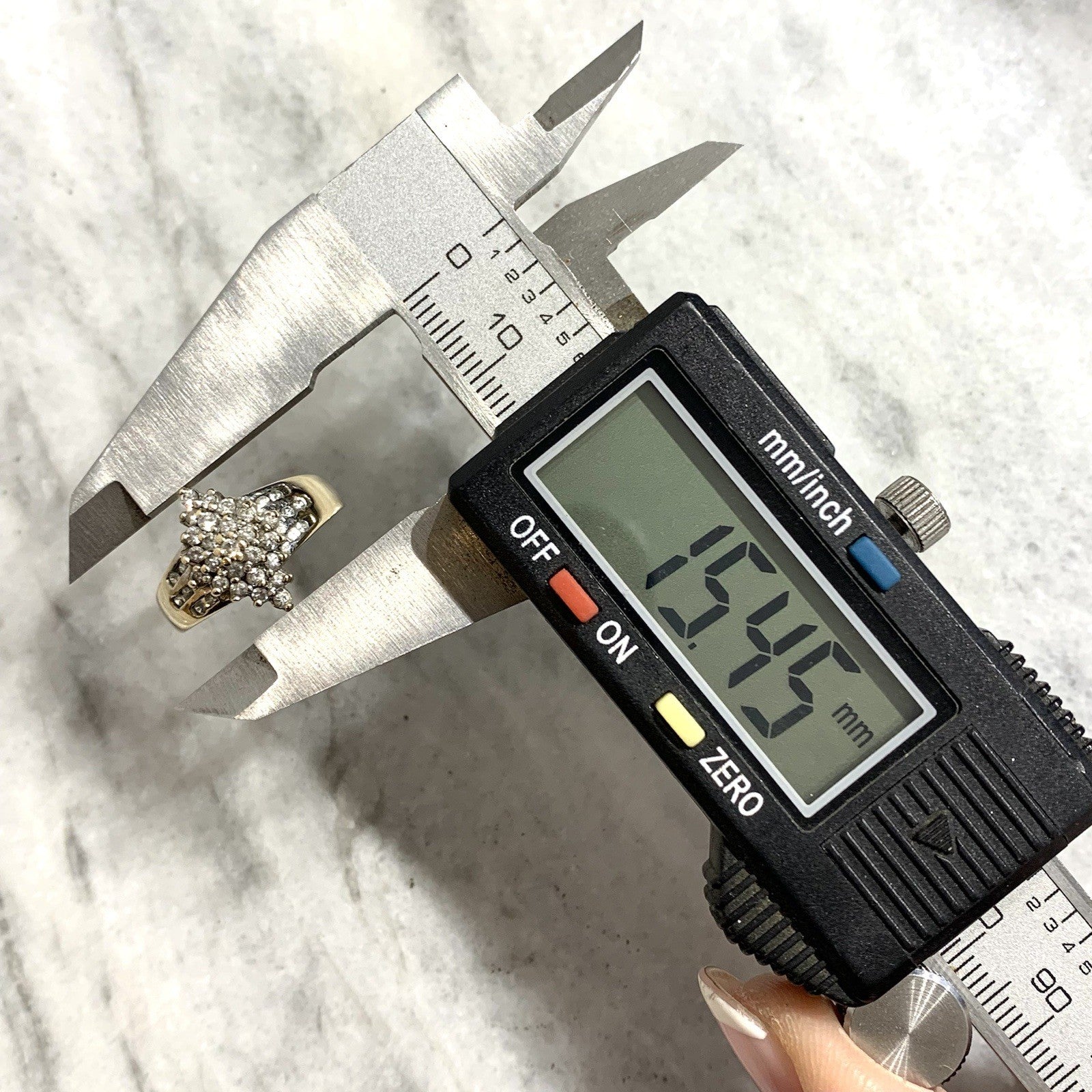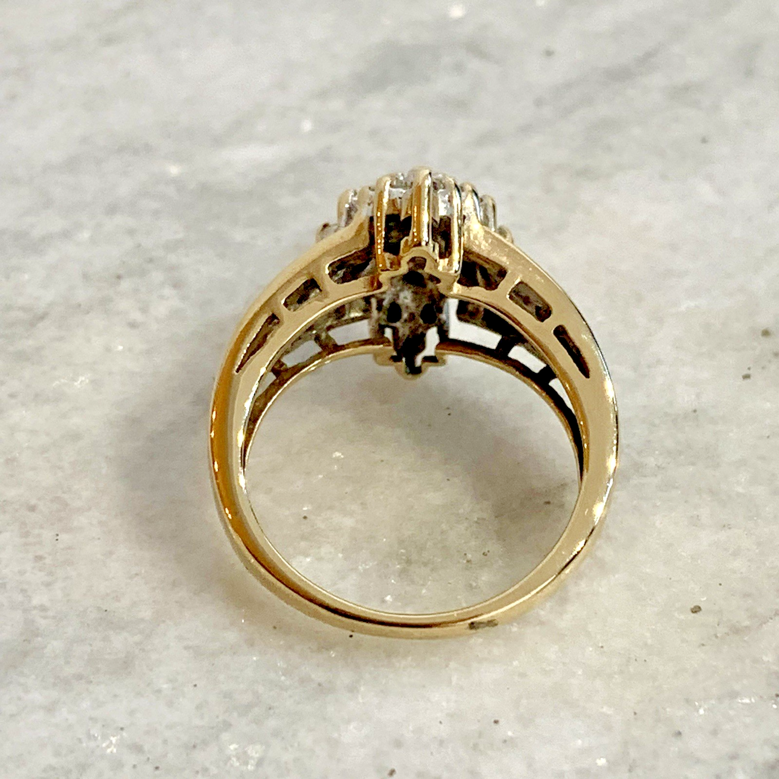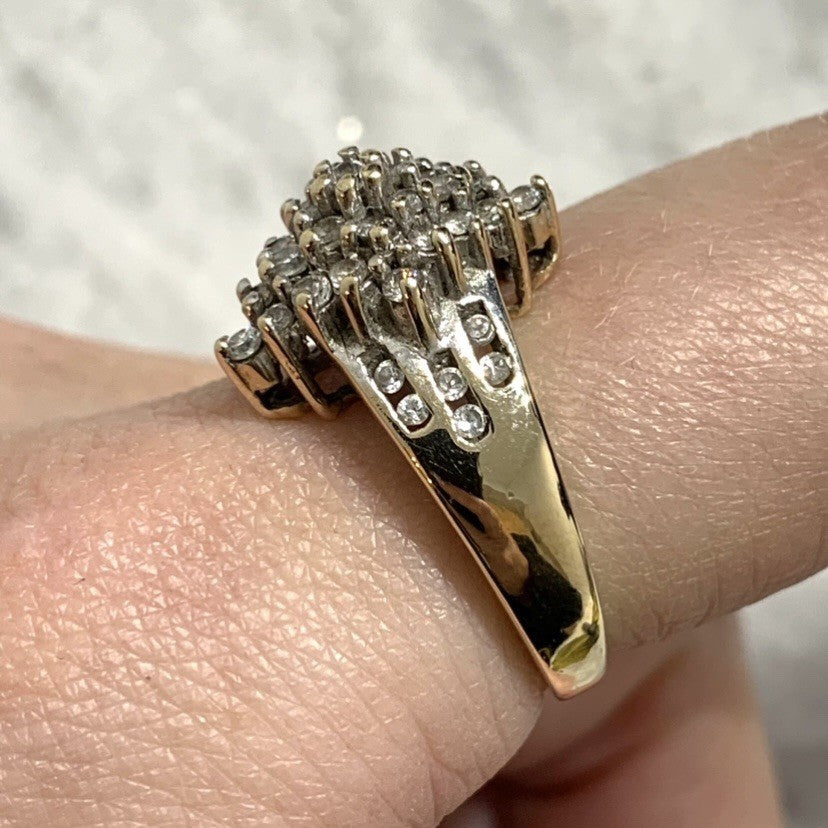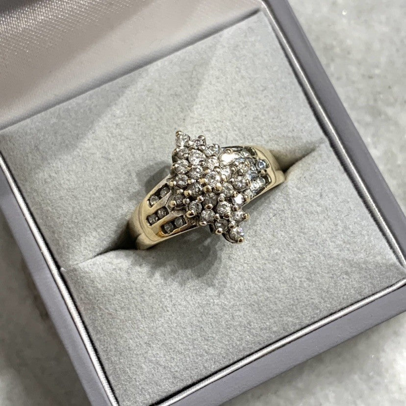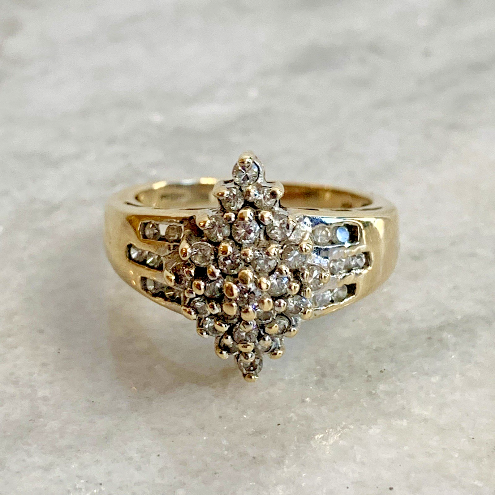 - A beautiful chunky gold ring showcasing an ornate cluster of round cut cubic zirconia gemstones, further accented by additional CZ on the shoulders in a channel setting.