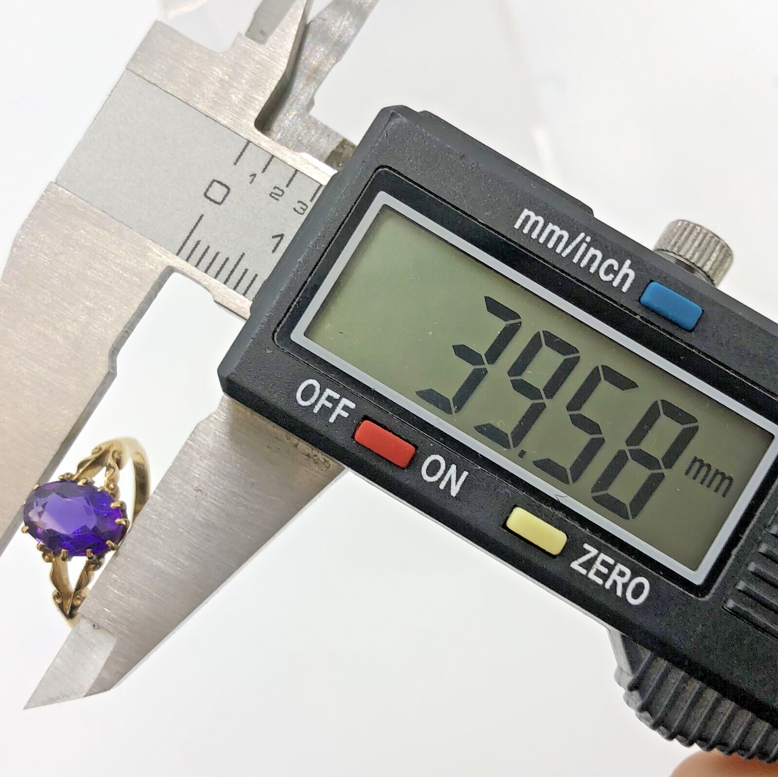 A gorgeous gold solitaire ring showcasing a vibrant oval cut amethyst, accented by split shank detailing.