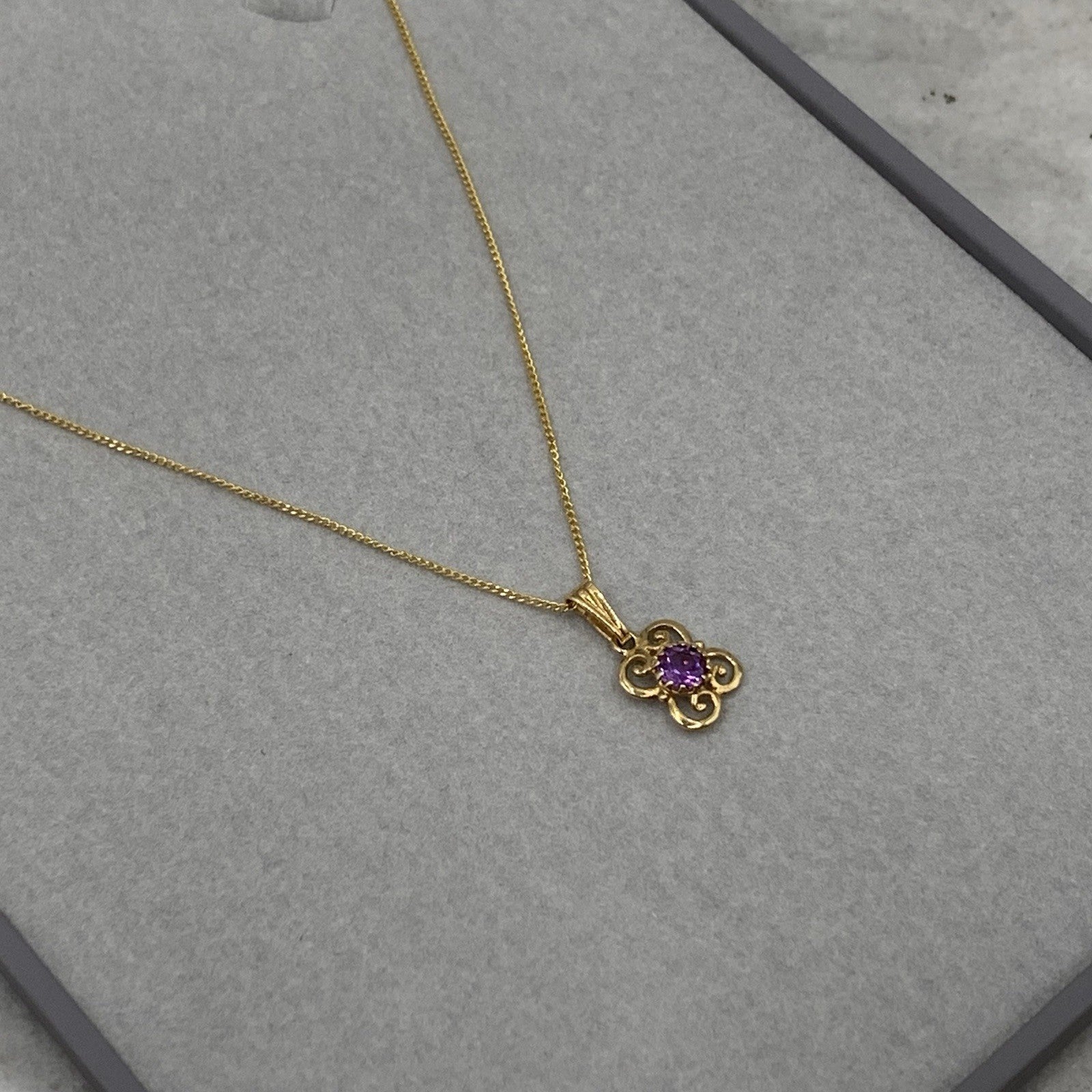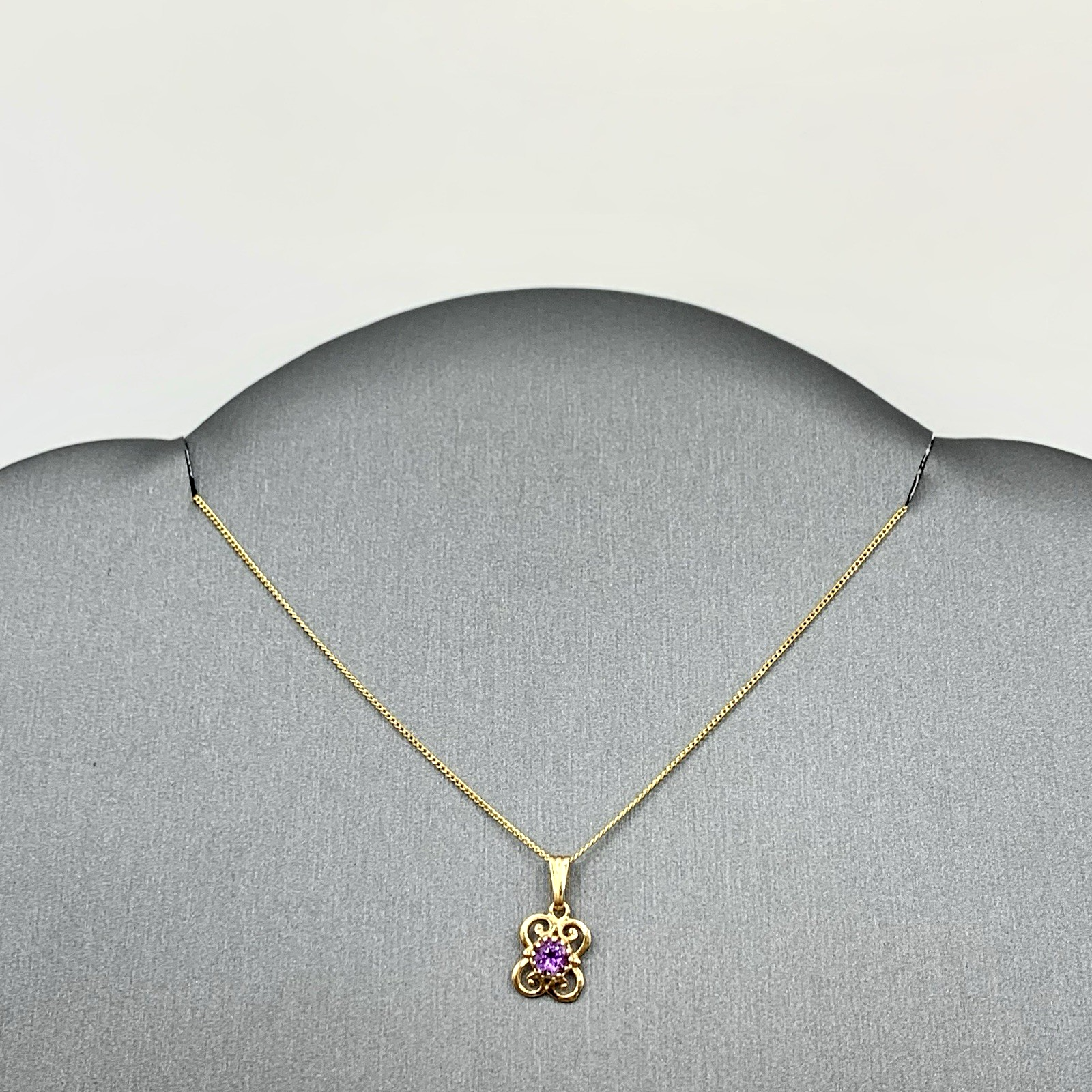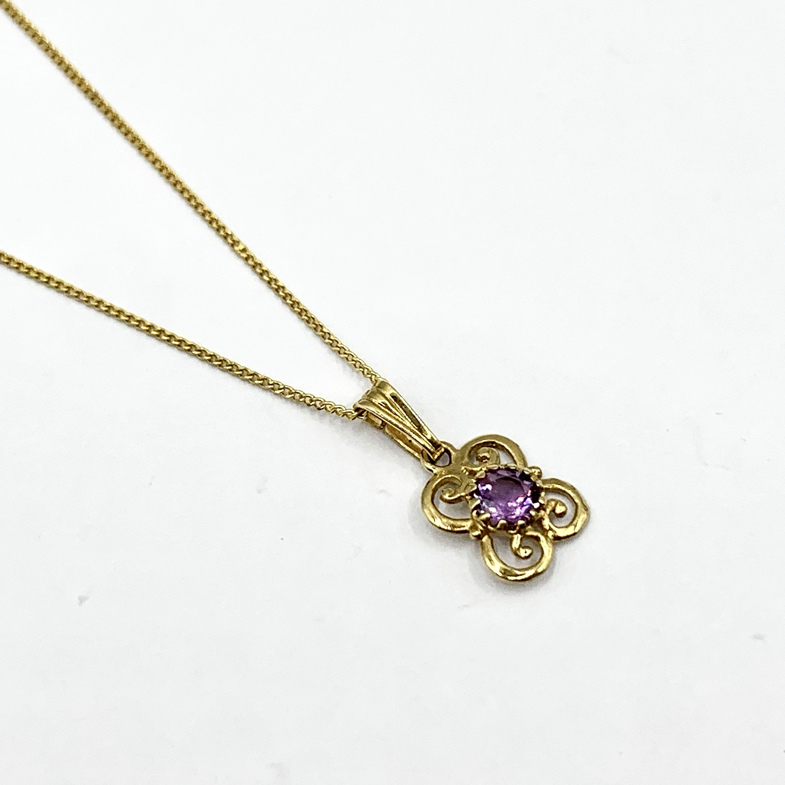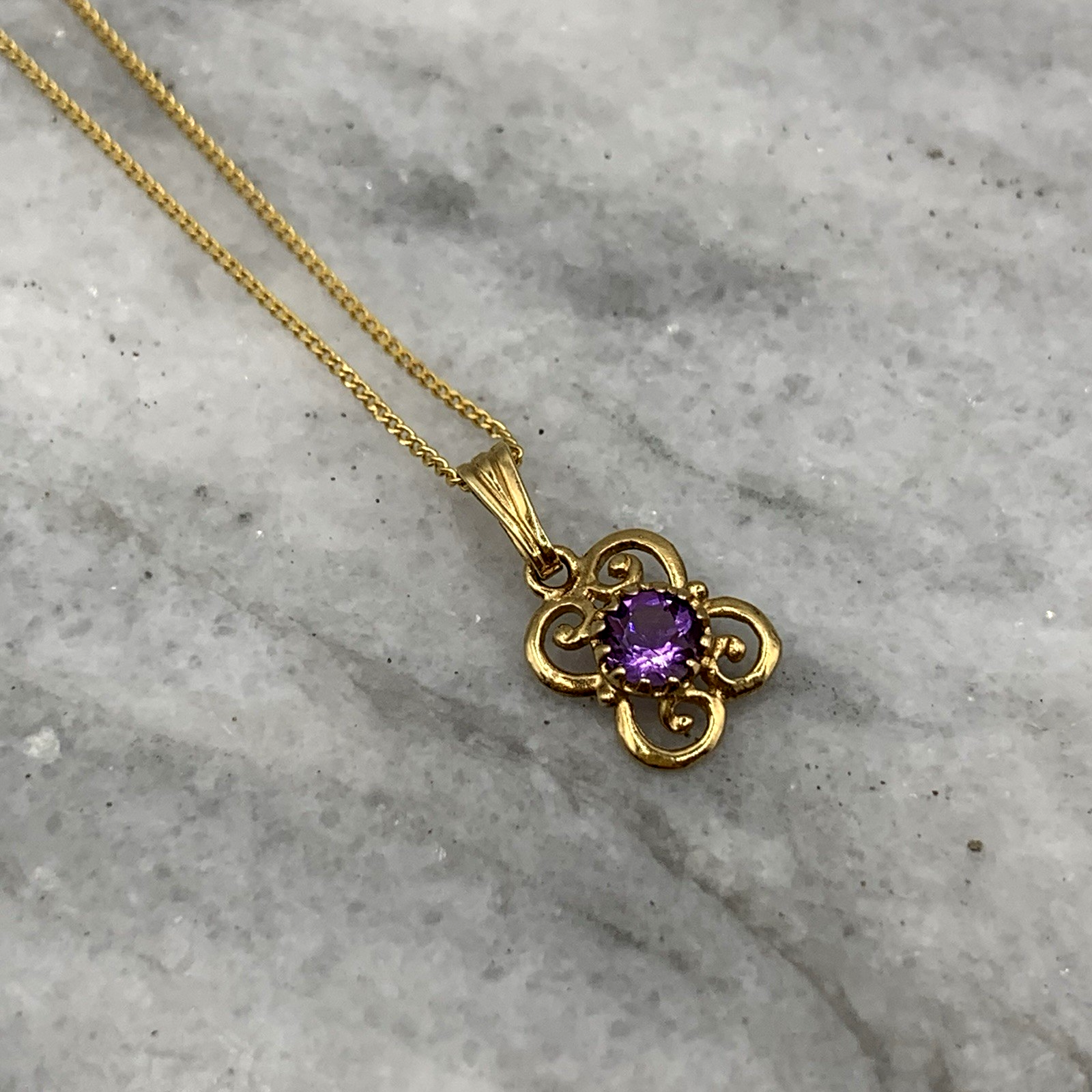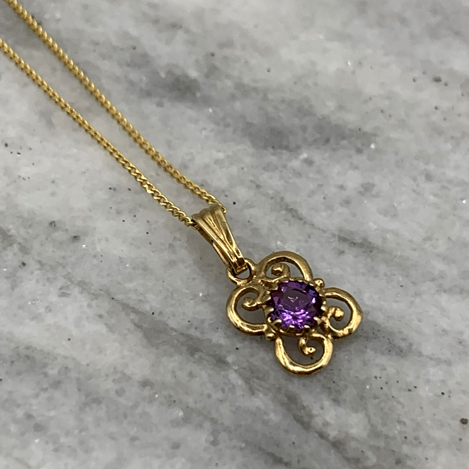 - A beautiful fine gold curb chain necklace showcasing a petite filigree pendant with a solitaire amethyst. Spring ring closure.