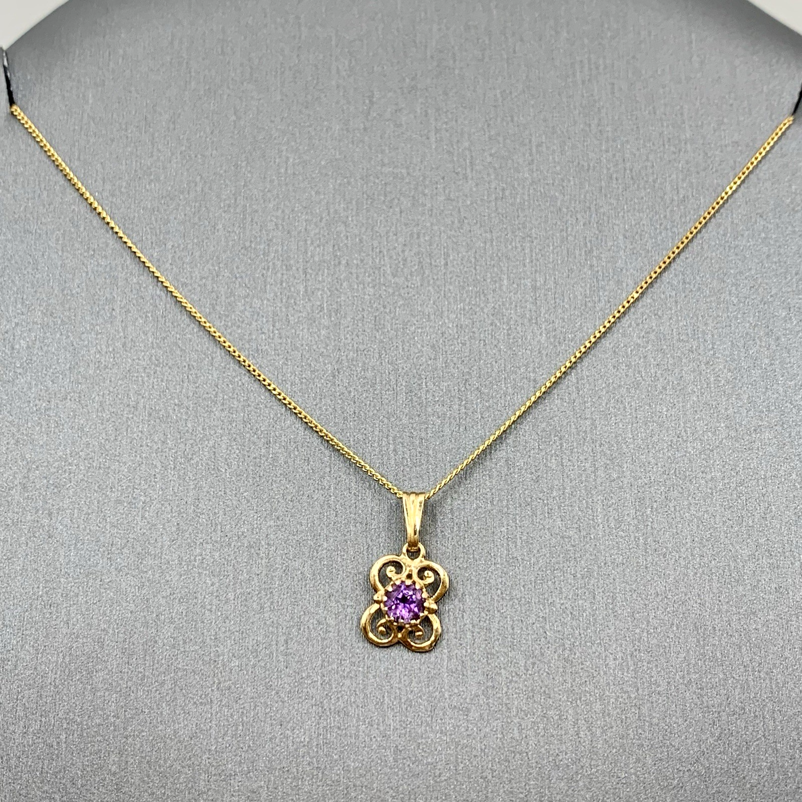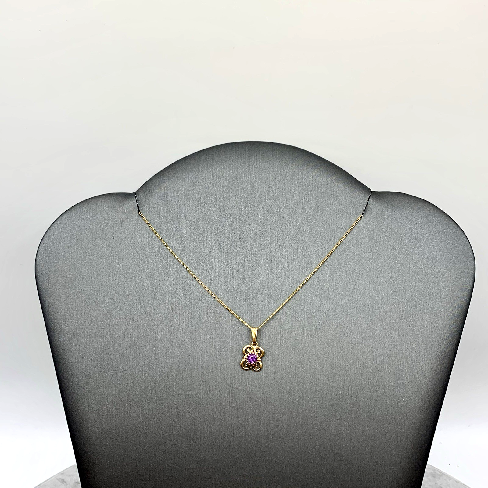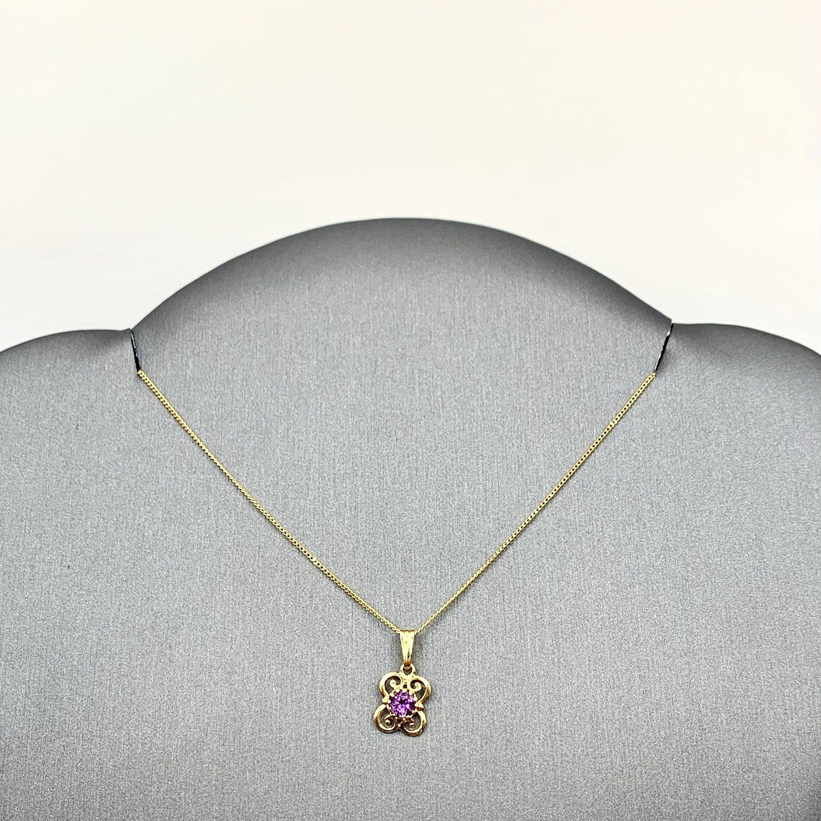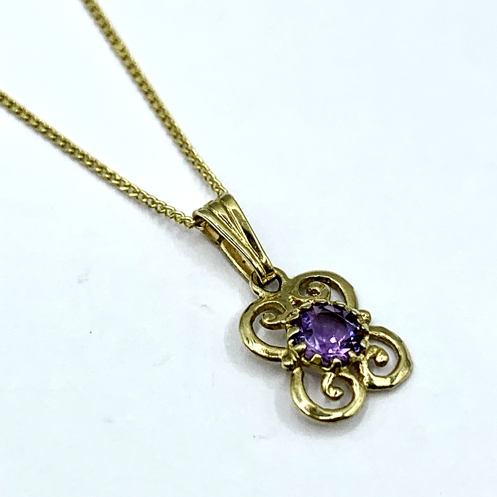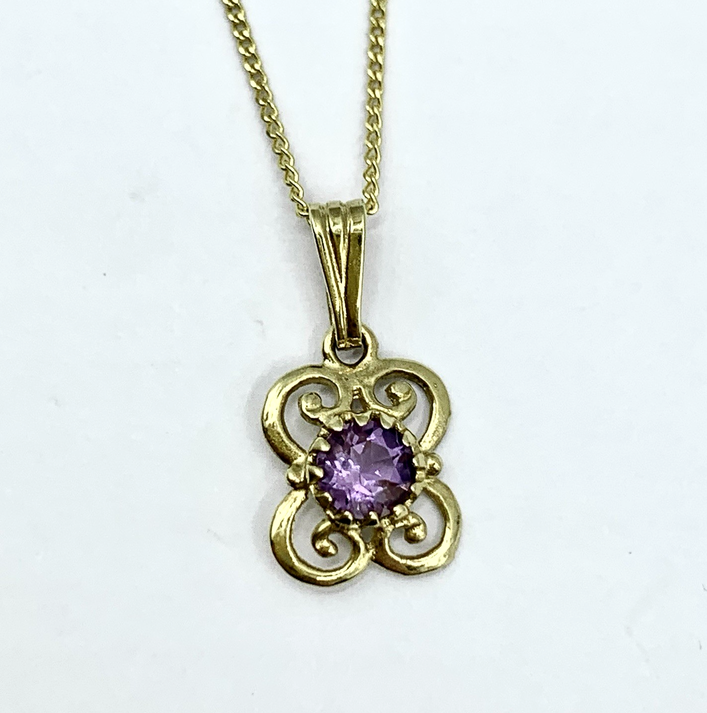 - A beautiful fine gold curb chain necklace showcasing a petite filigree pendant with a solitaire amethyst. Spring ring closure.