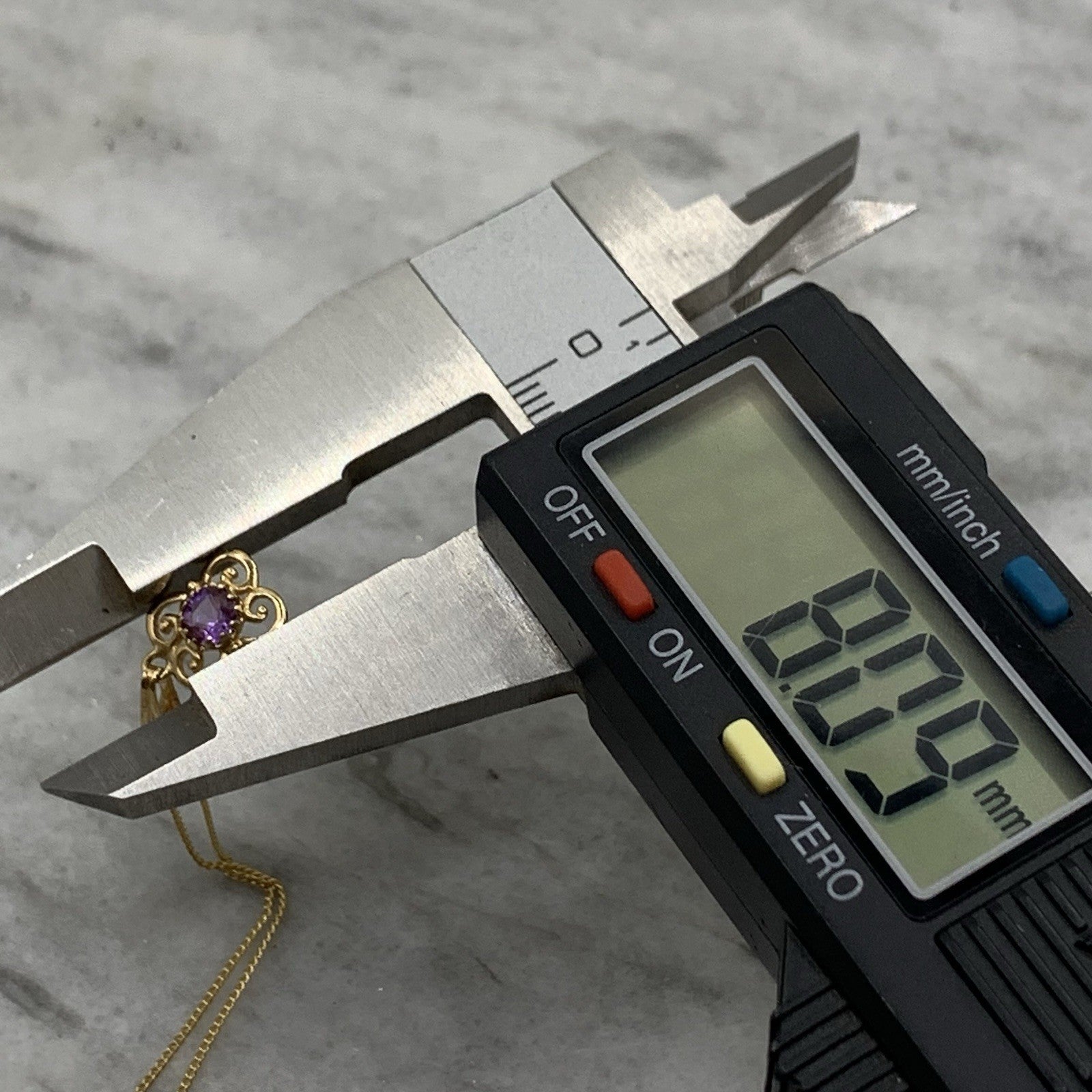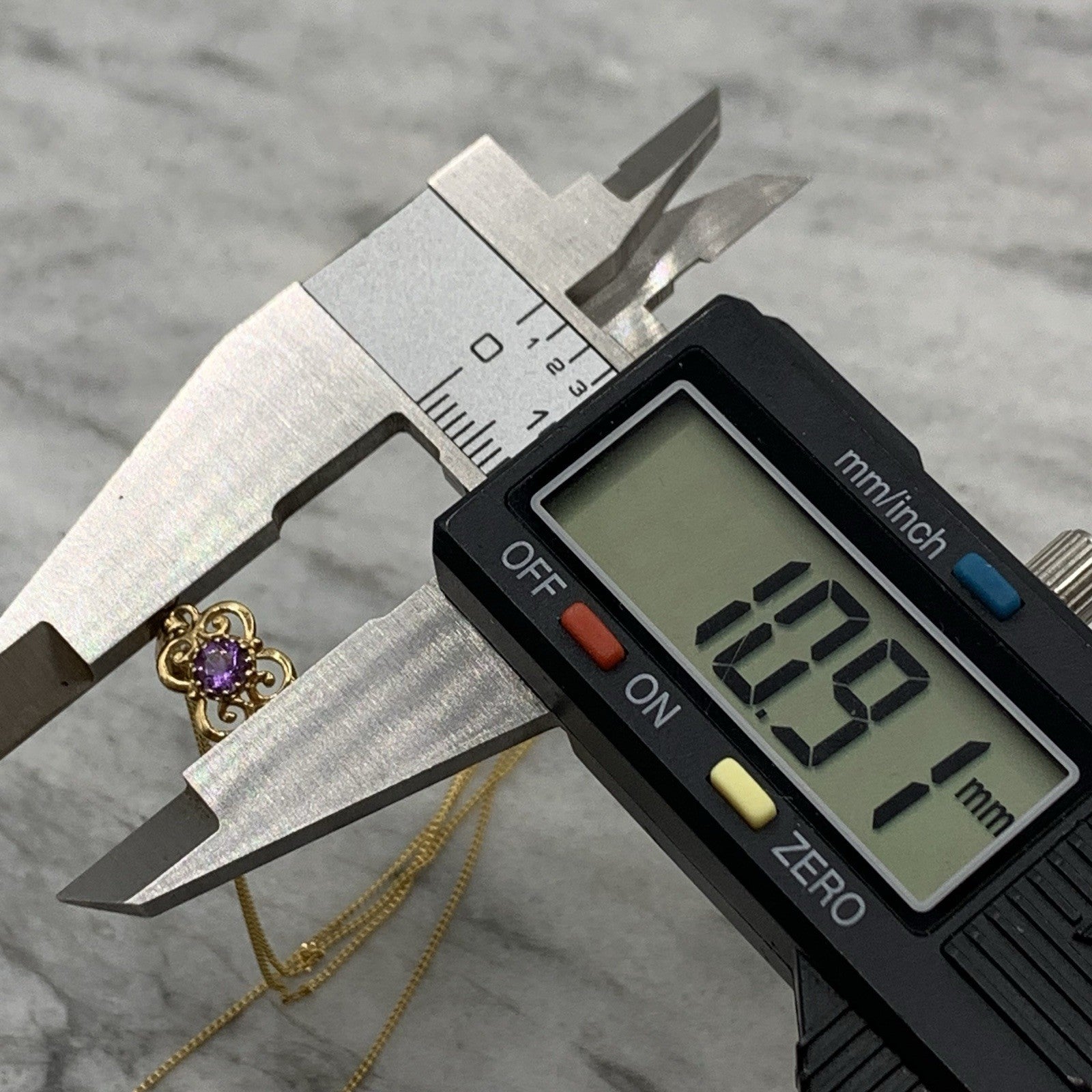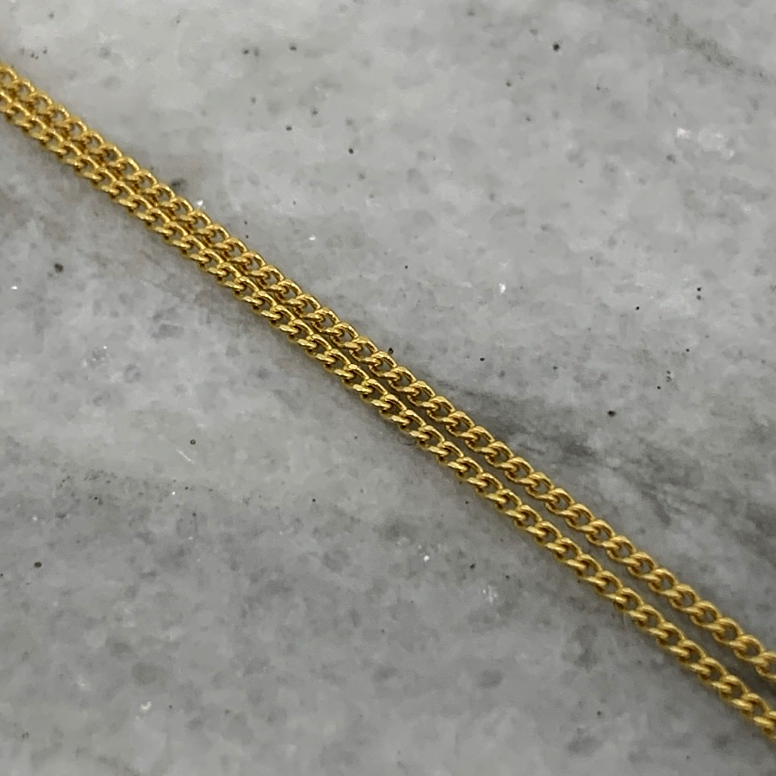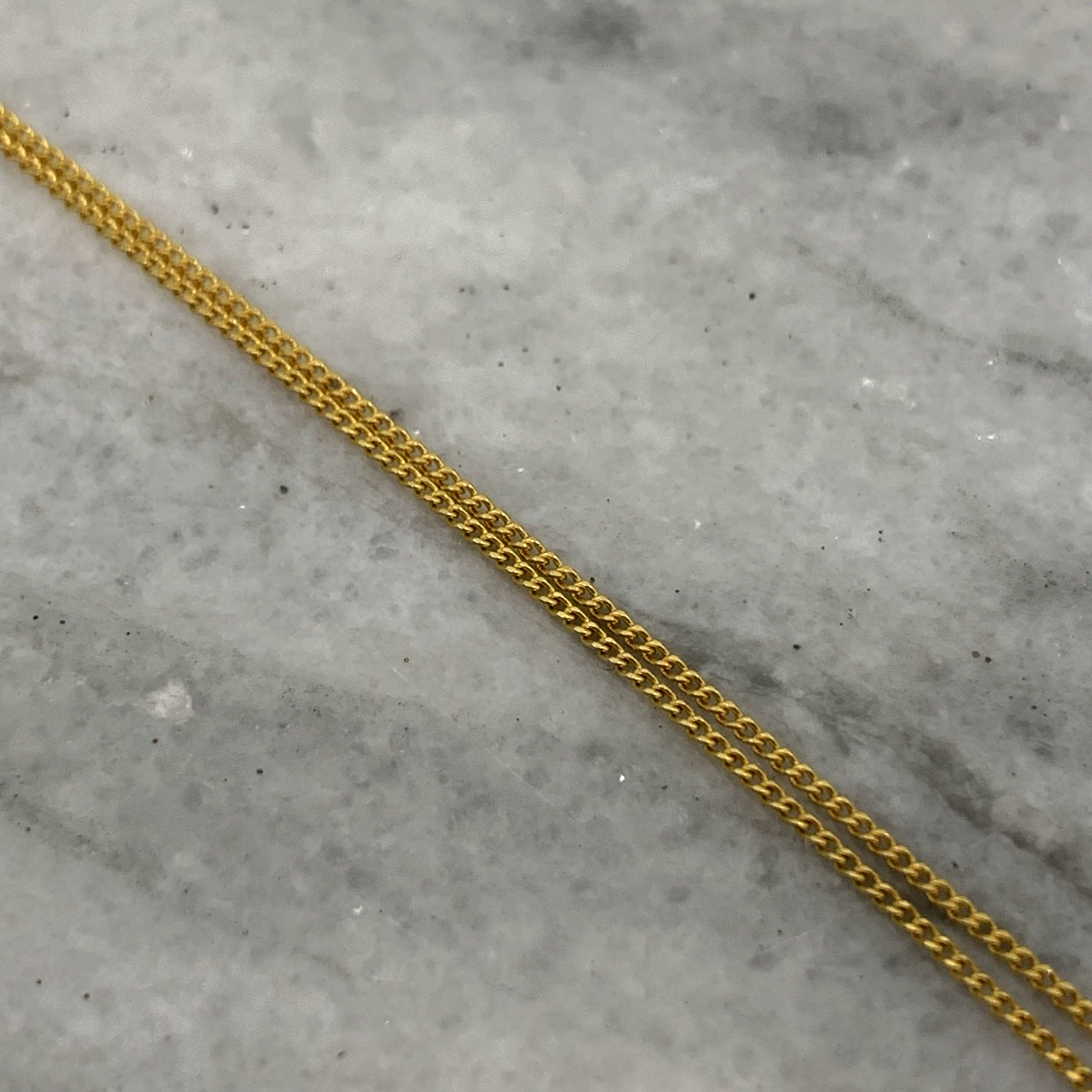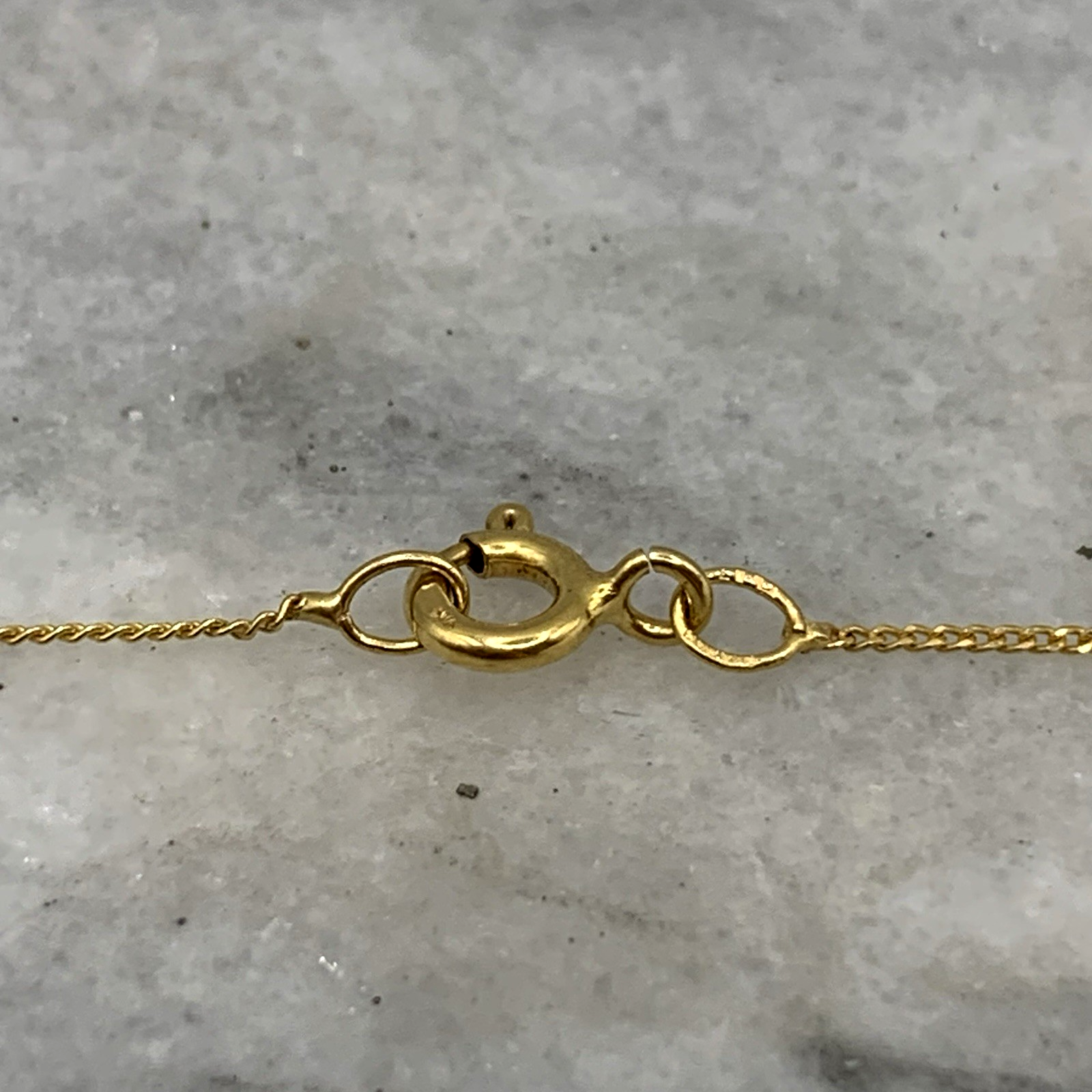 - A beautiful fine gold curb chain necklace showcasing a petite filigree pendant with a solitaire amethyst. Spring ring closure.