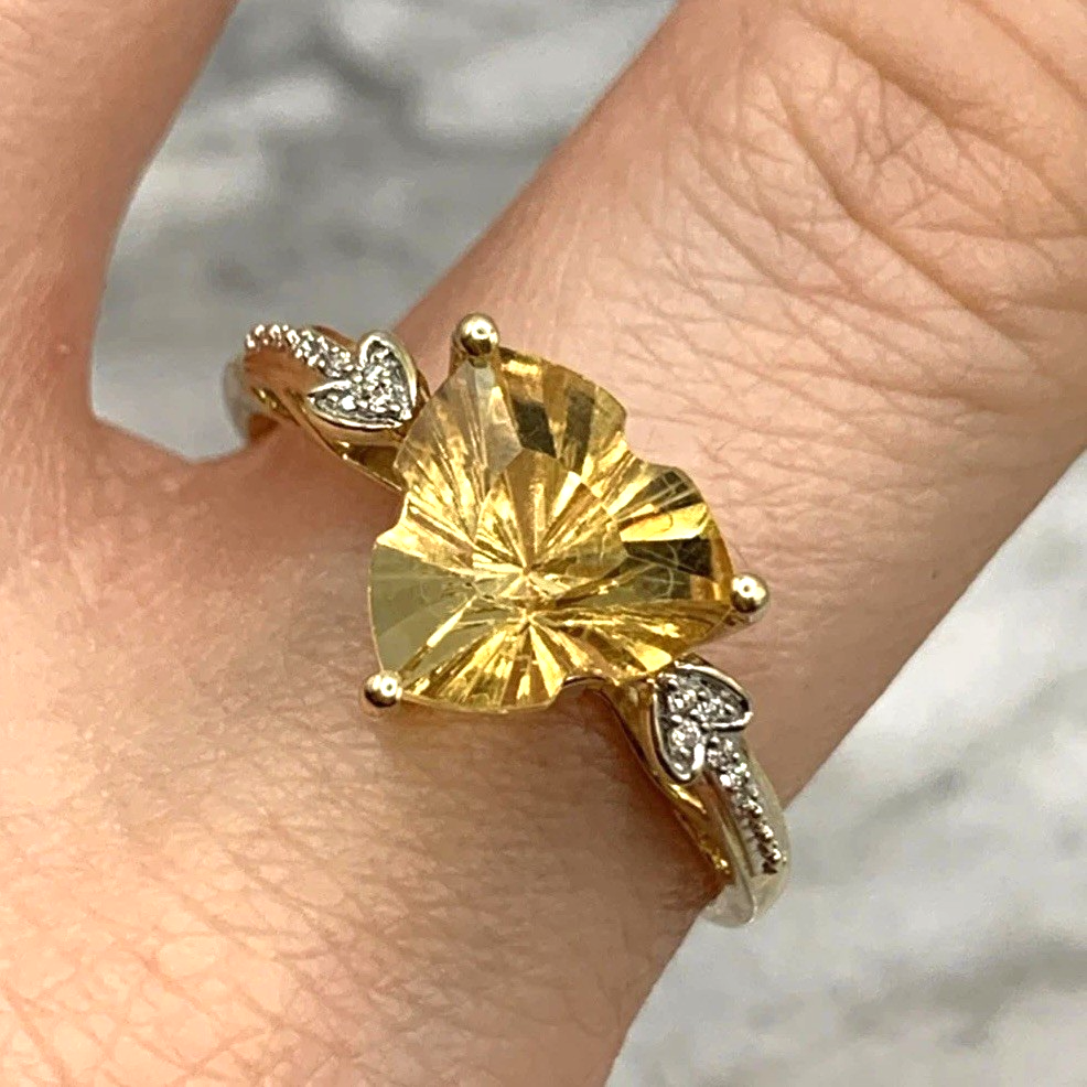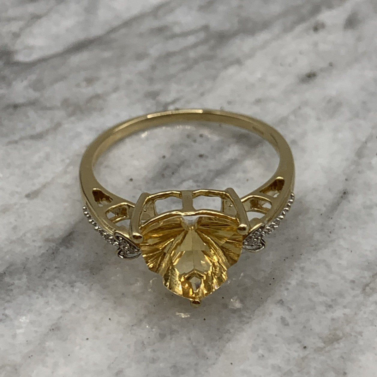 A gorgeous gold ring featuring a fancy cut citrine accented by petite diamonds.