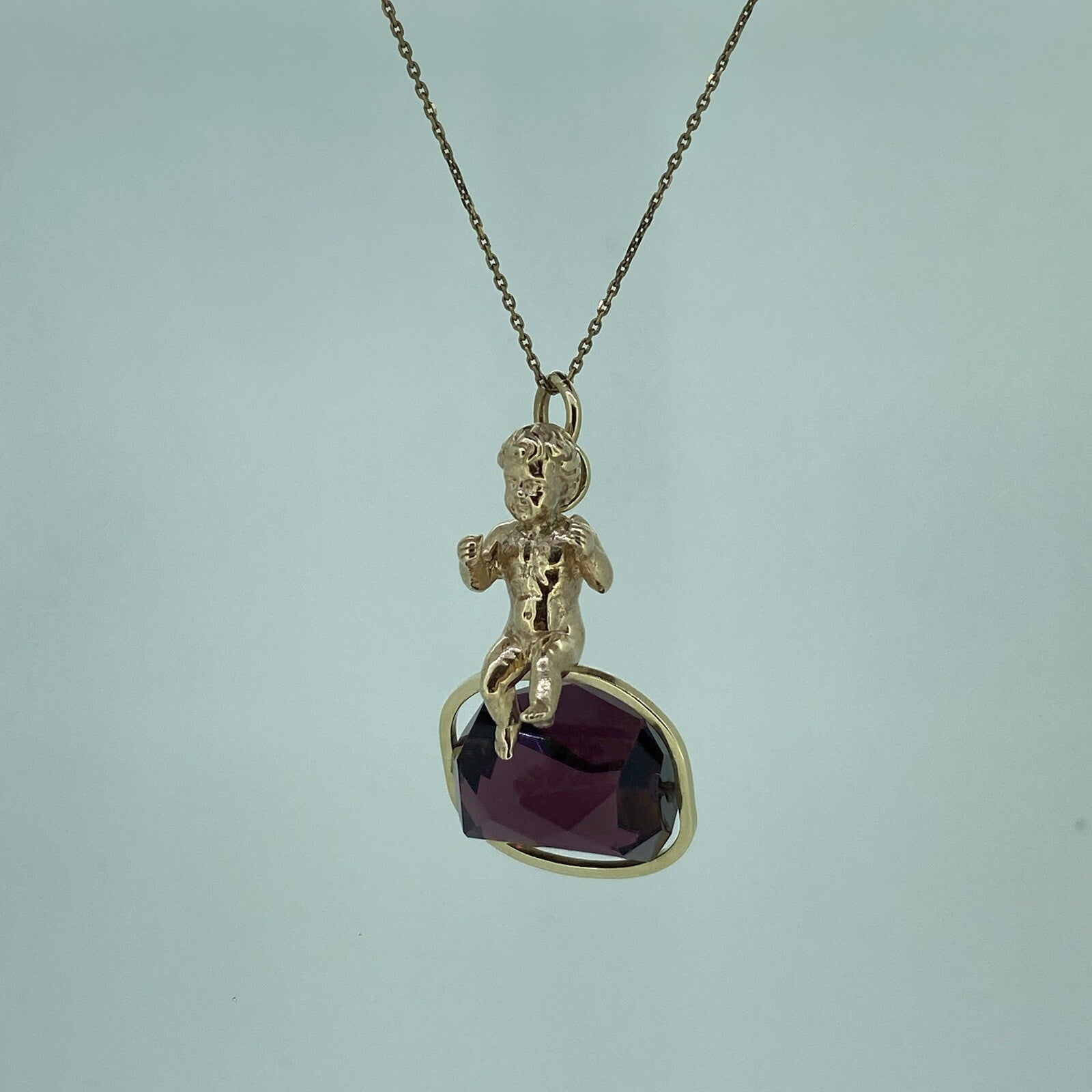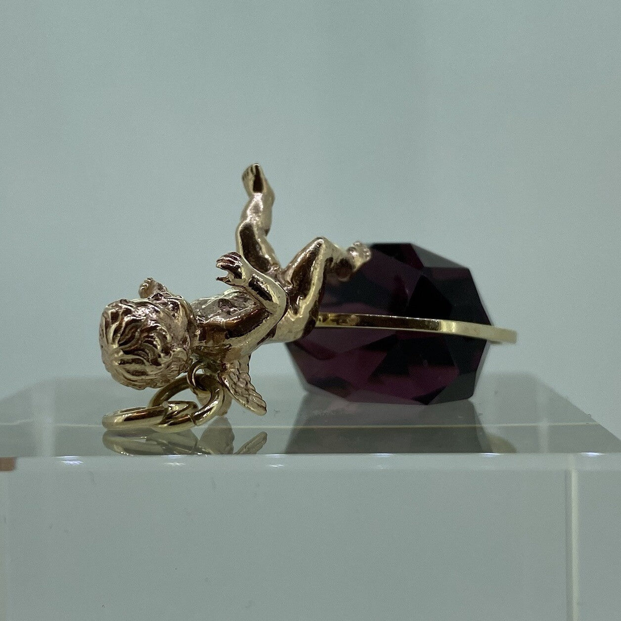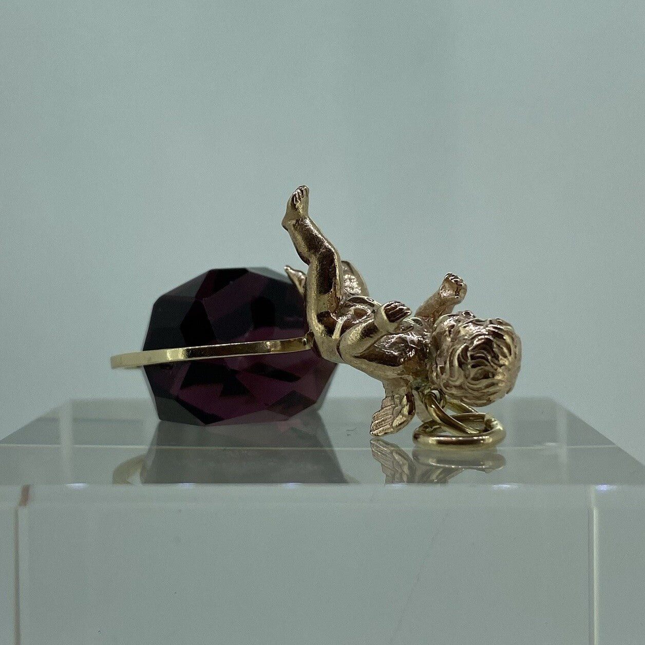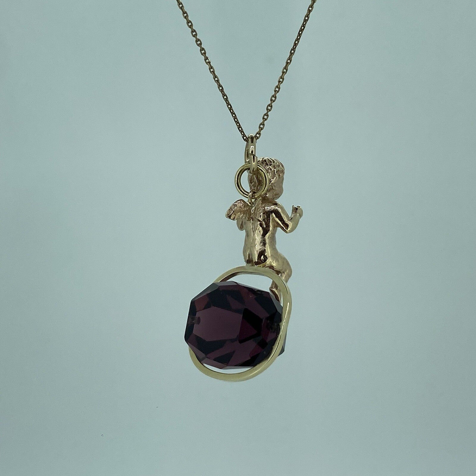 A stunning roses gold swivel fob pendant crafted in the shape of cupid, sat upon a vibrant deep purple-maroon glass stone.