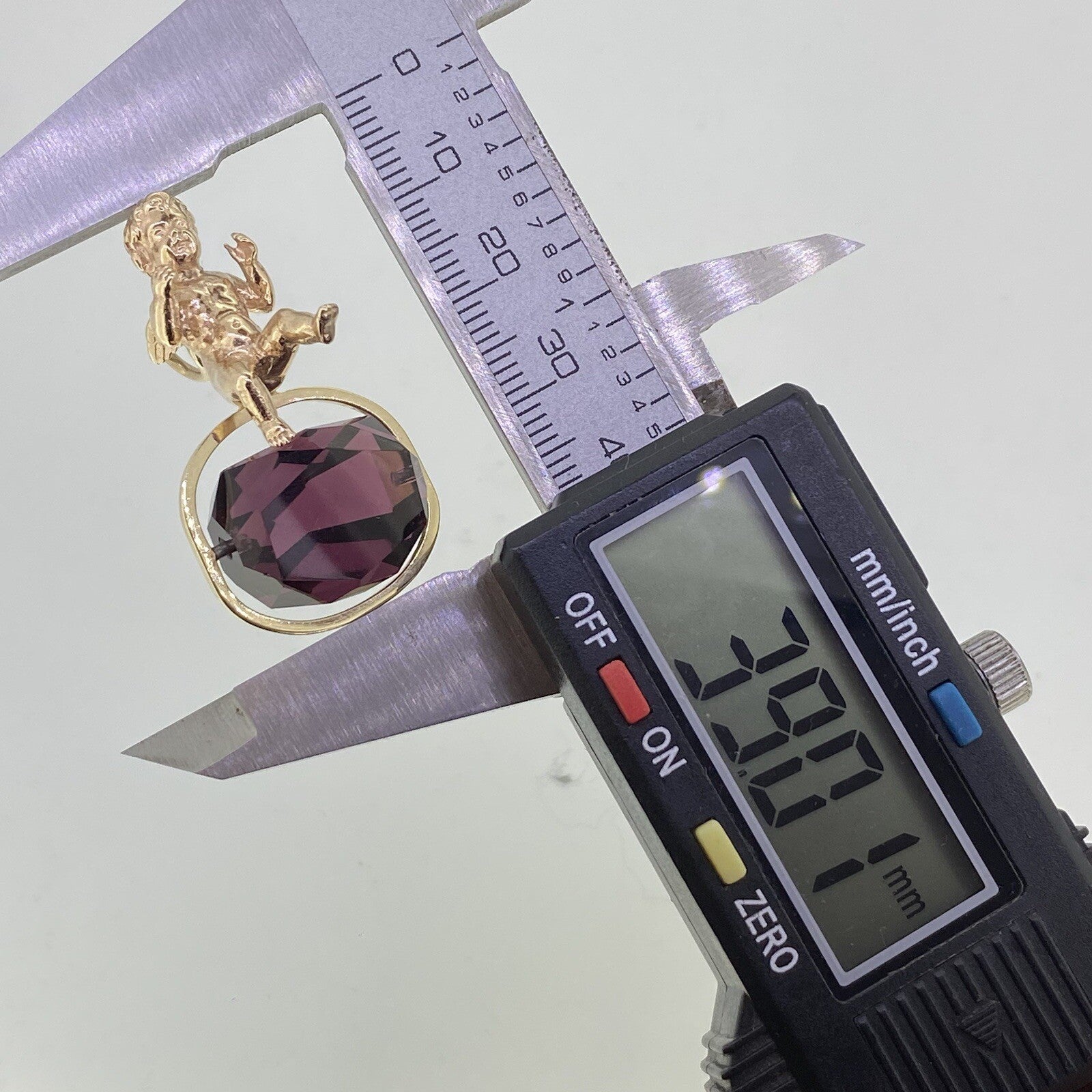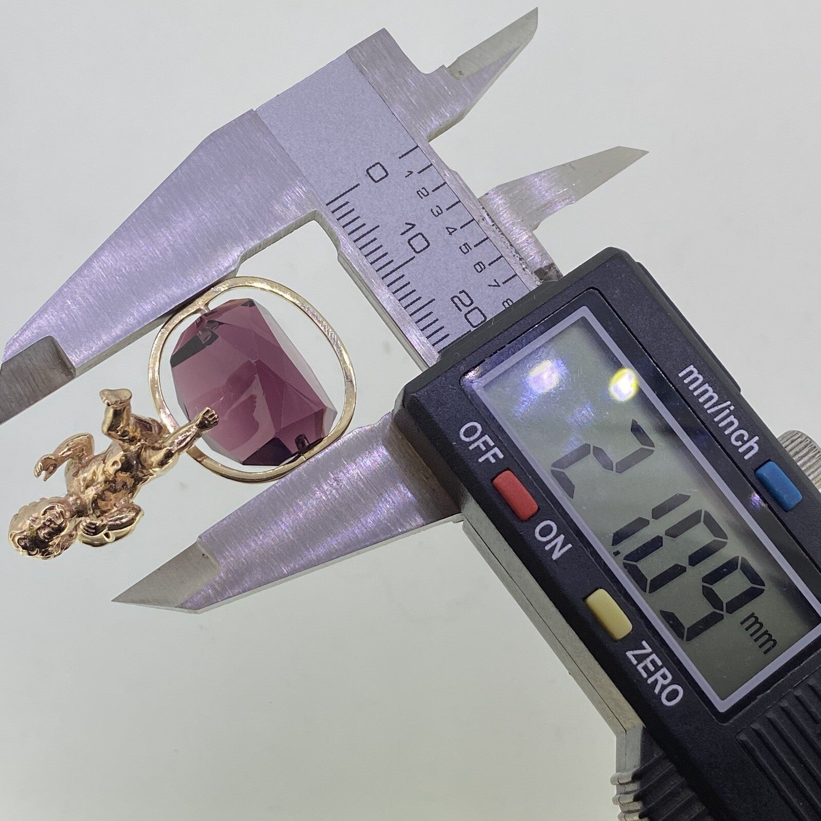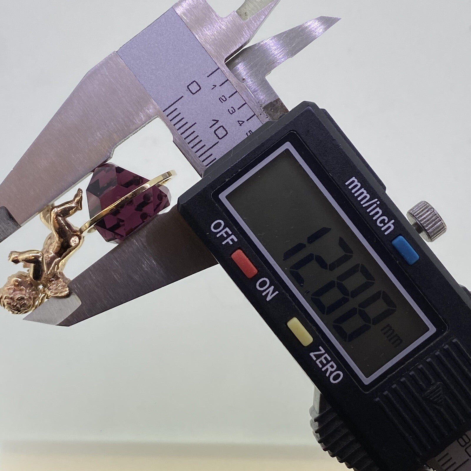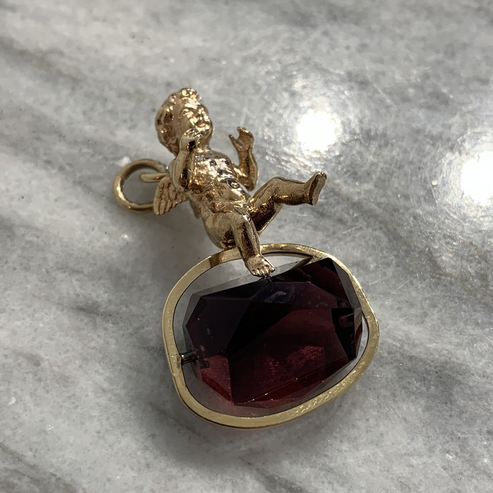 A stunning roses gold swivel fob pendant crafted in the shape of cupid, sat upon a vibrant deep purple-maroon glass stone.