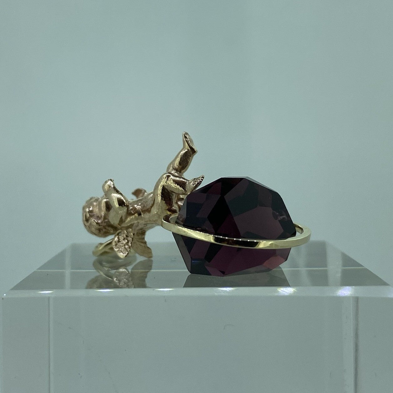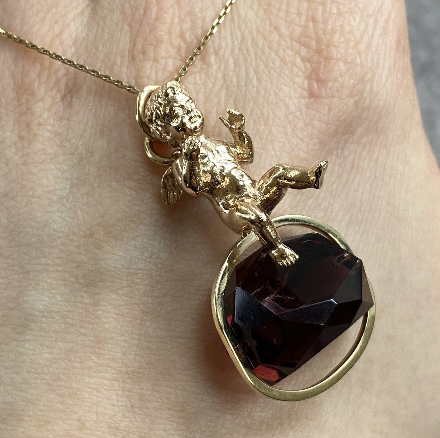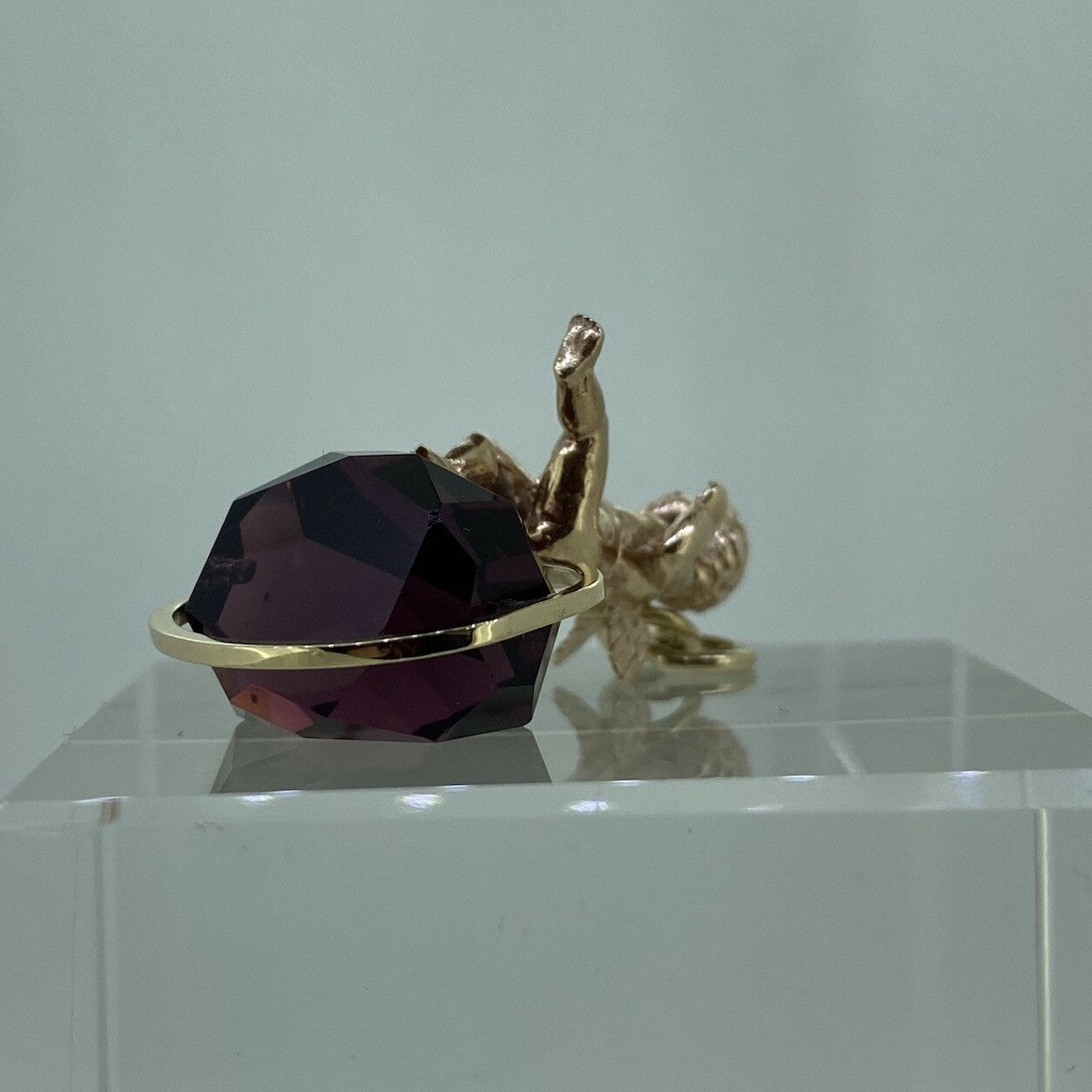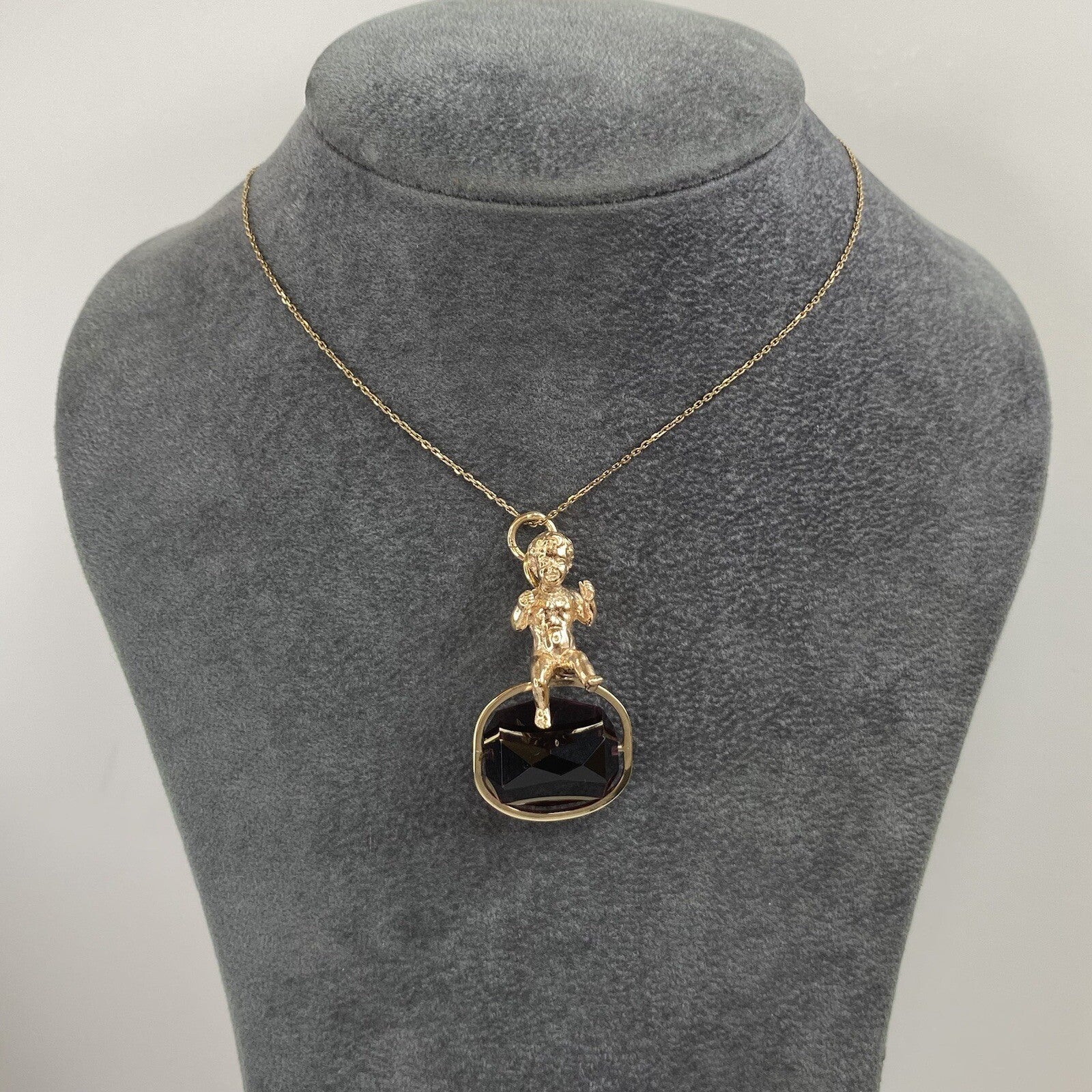 A stunning roses gold swivel fob pendant crafted in the shape of cupid, sat upon a vibrant deep purple-maroon glass stone.