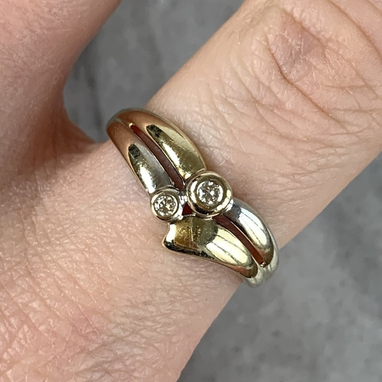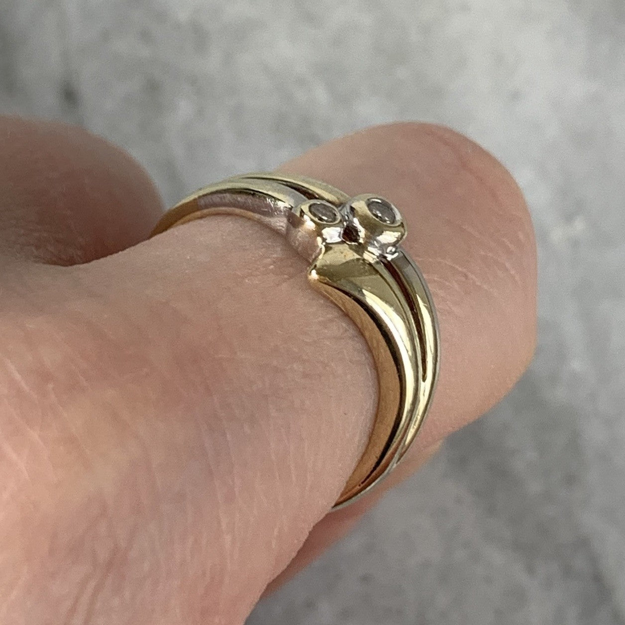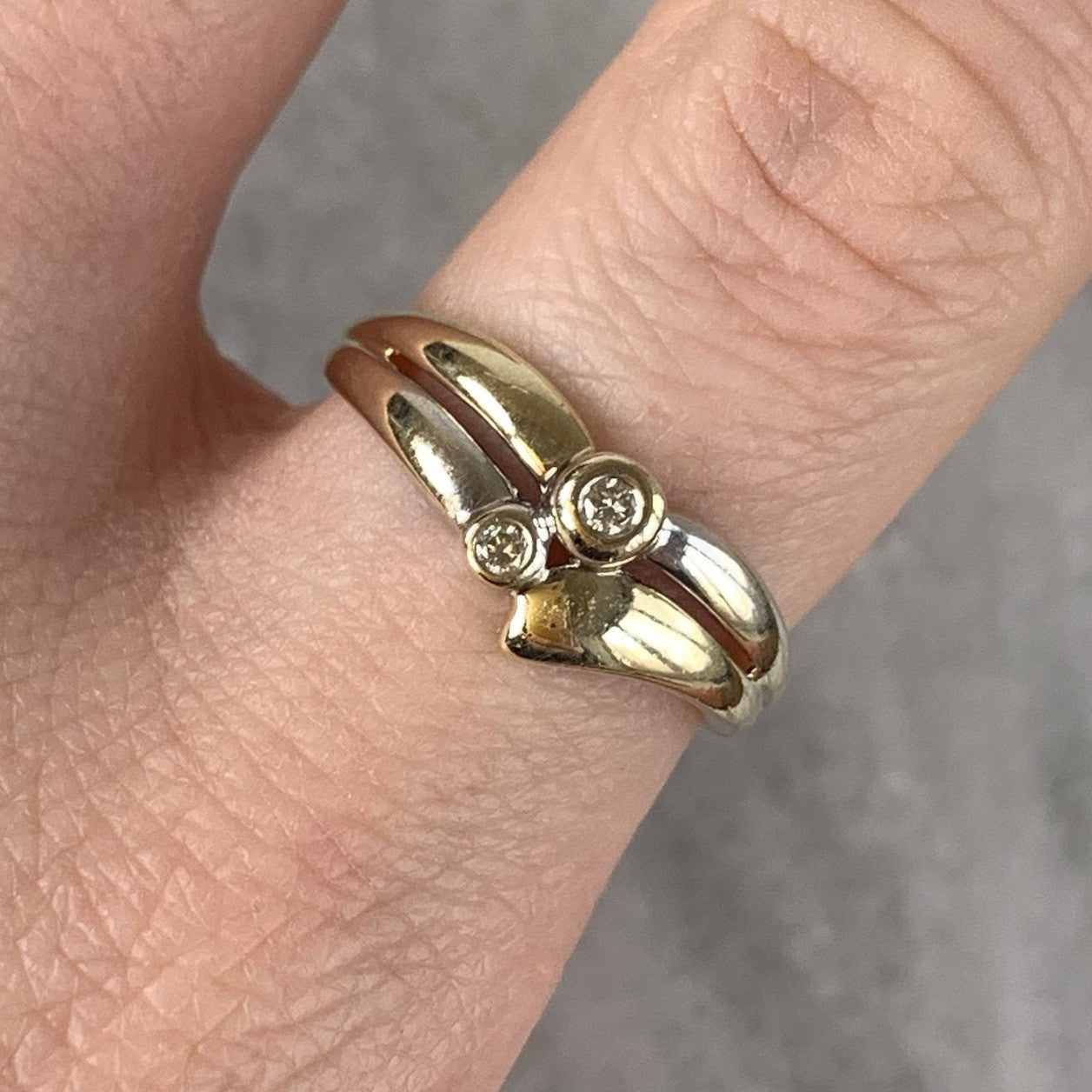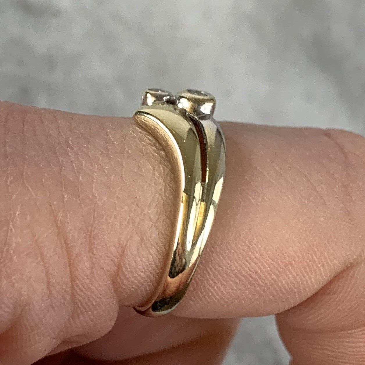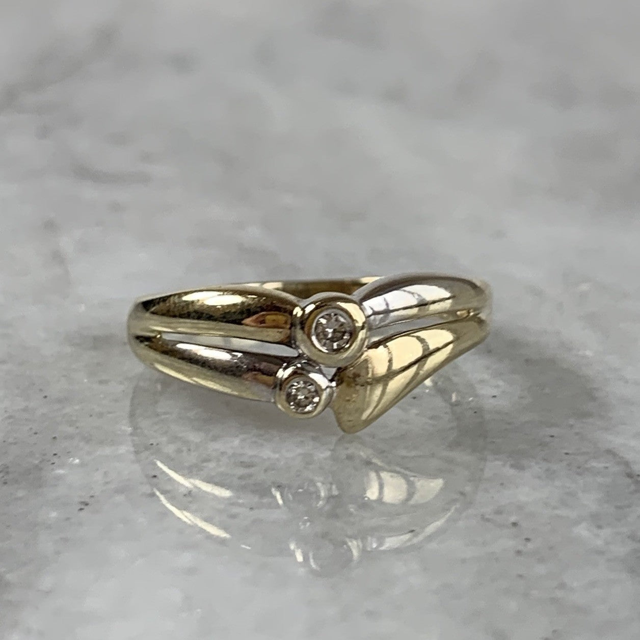 A stunning gold double wishbone style ring showcasing a duo of bezel set diamonds.