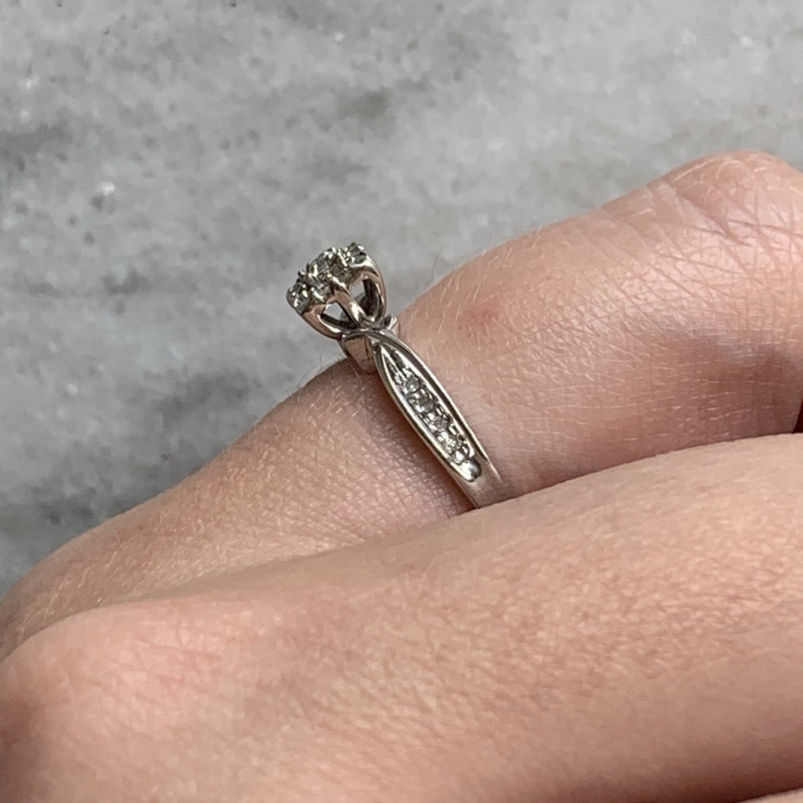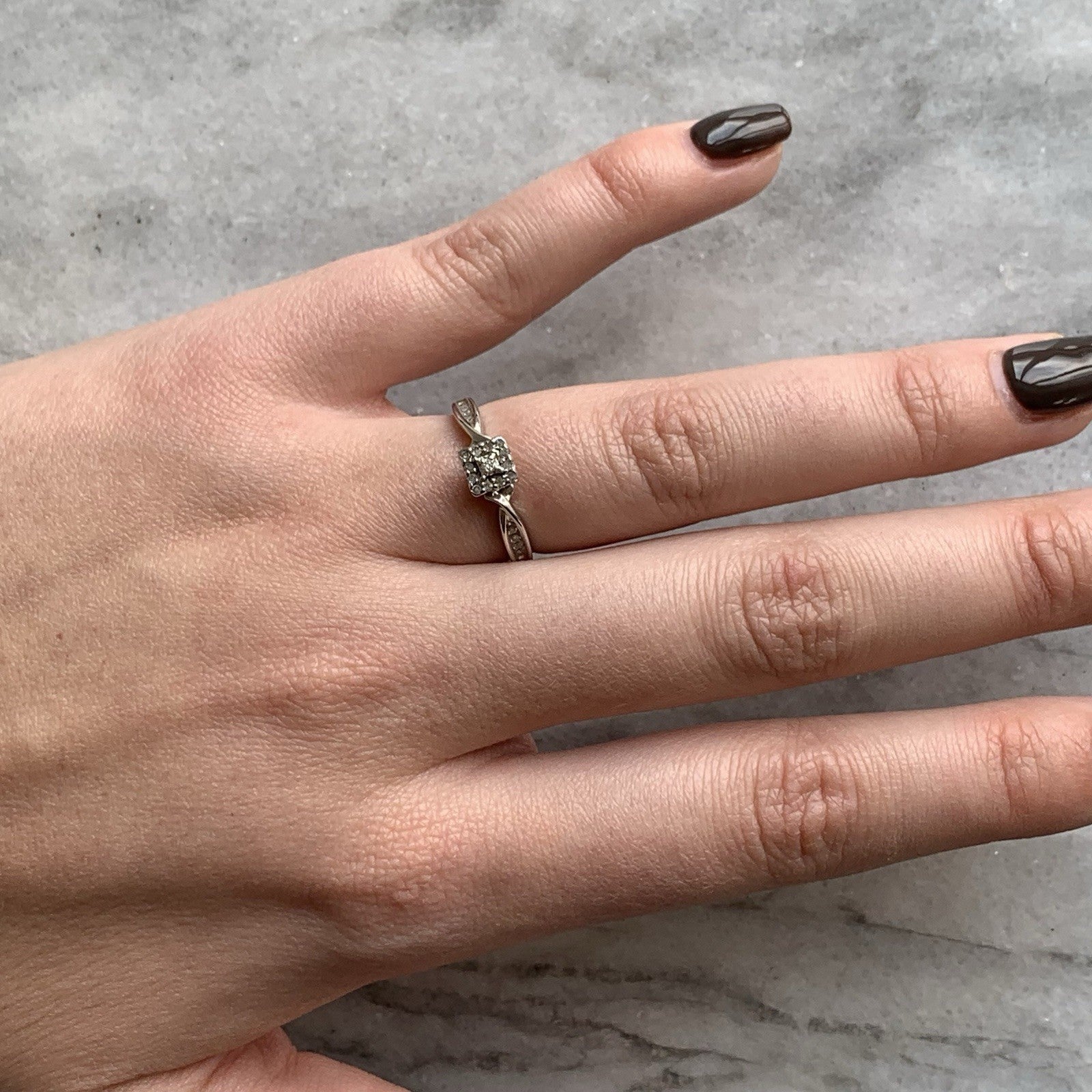A beautiful diamond cluster ring with shoulder accents, diamonds amounting to .10ct.